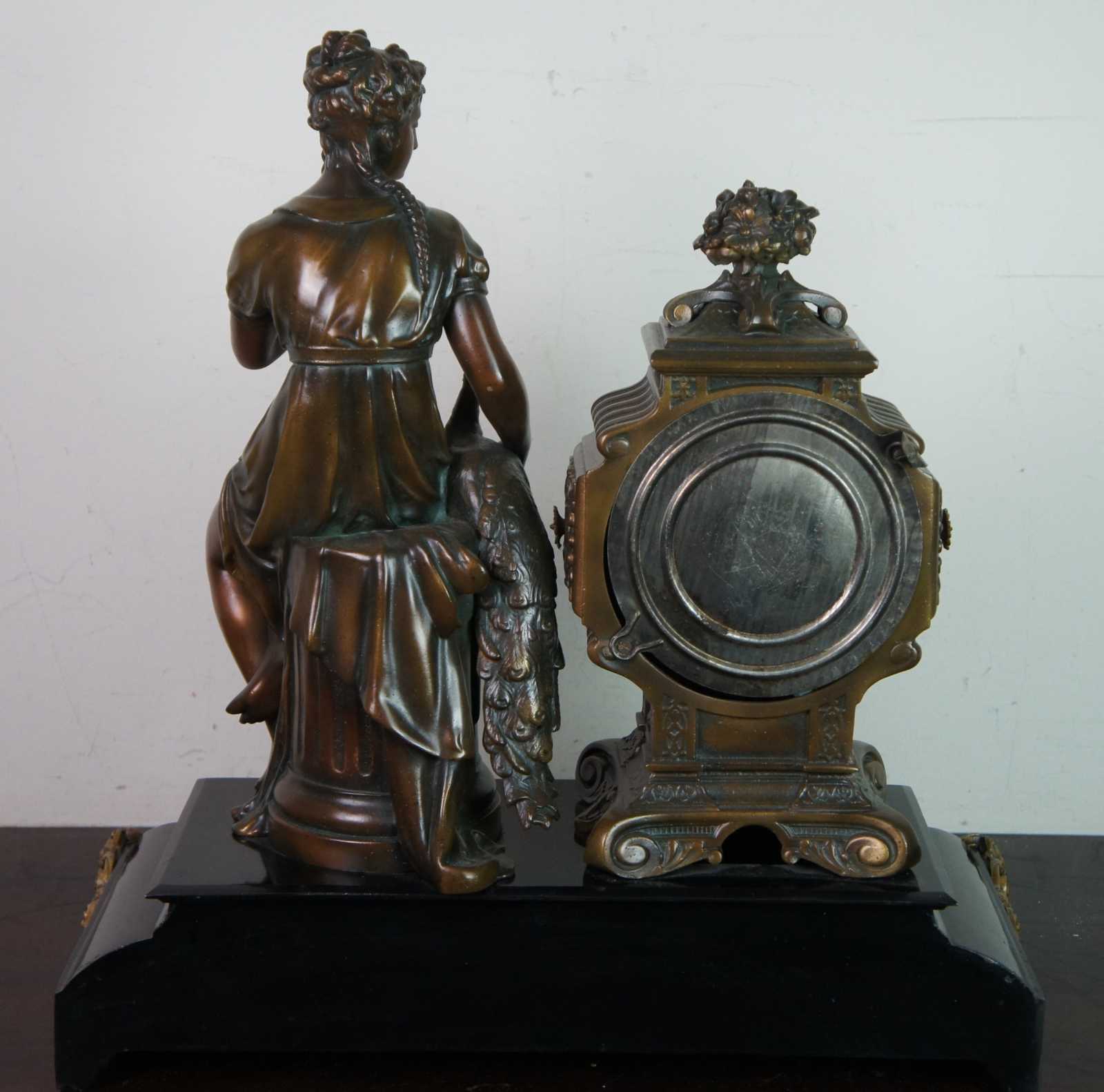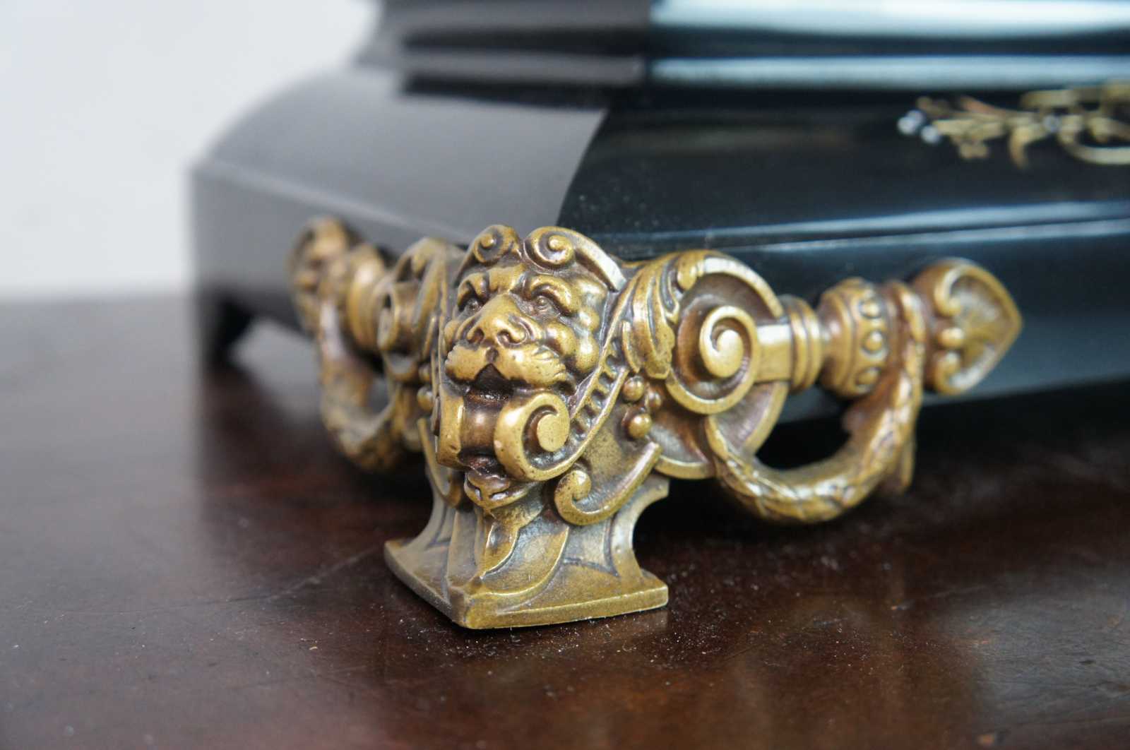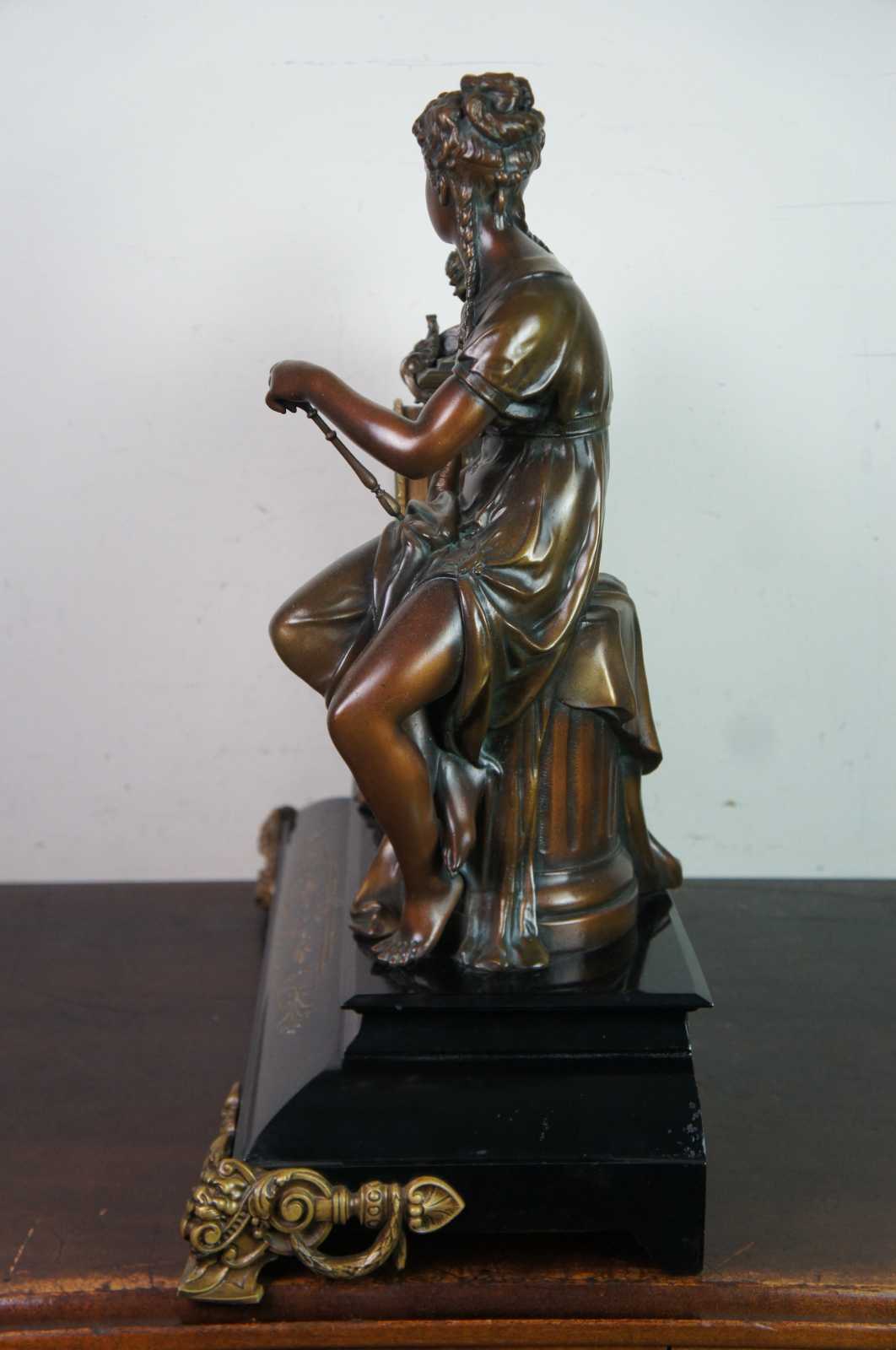 A rare and impressive Antique 1881 Ansonia open escapement mantel clock. Made of bronze and marble featuring neoclassical styling with a woman seated on a Corinthian column with her pet pheasant bird and gold footed base with half Northwind face half lion feet. Engraved in gold along the center with exceptional filigree design.