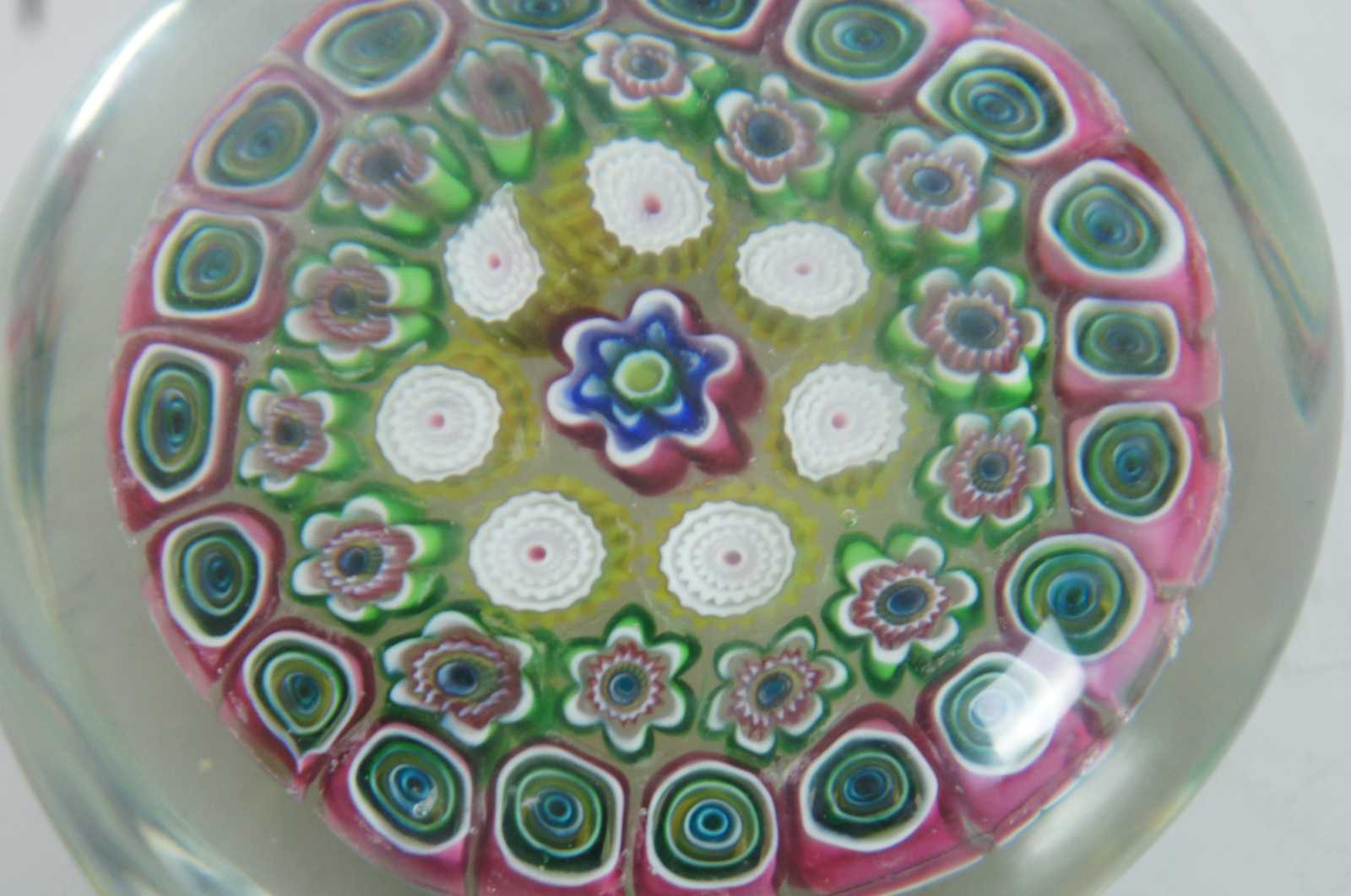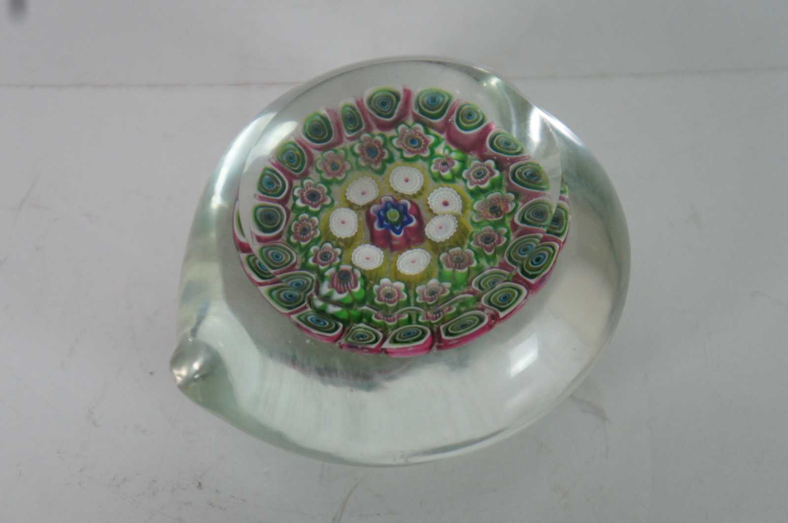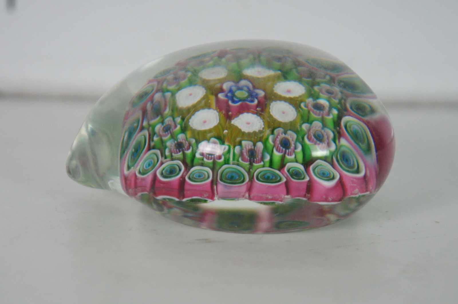 Vintage Murano Italy art glass heart and flower paperweight filled with millefiori glass cane patterns.