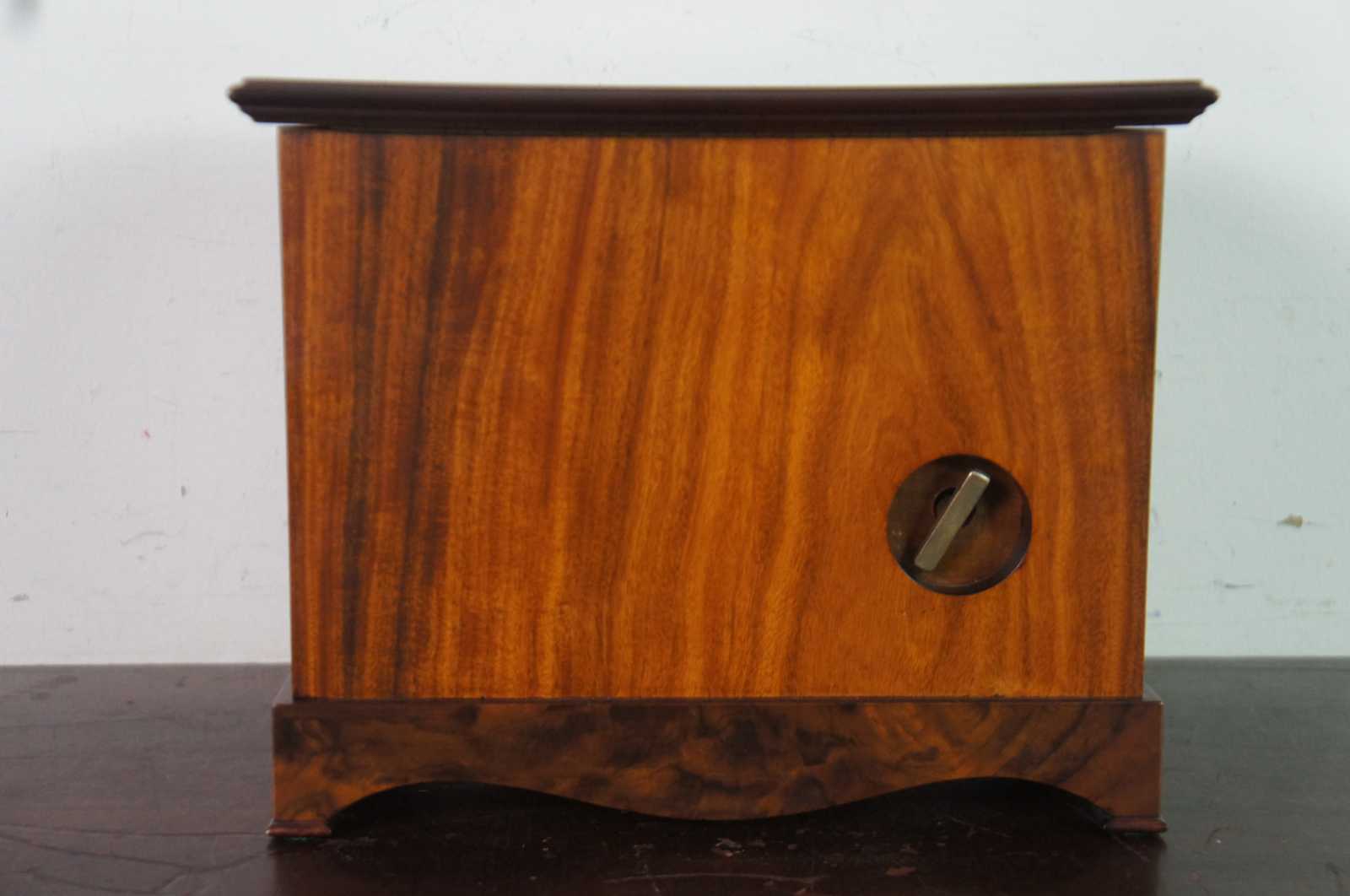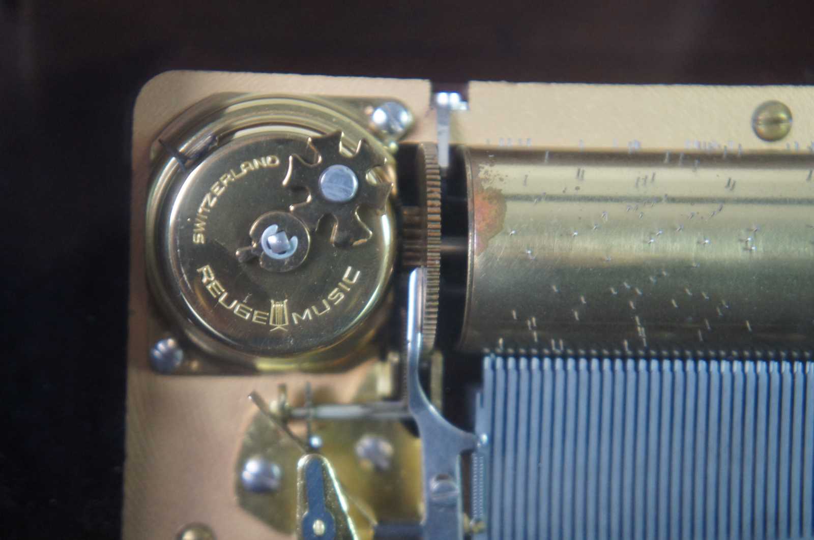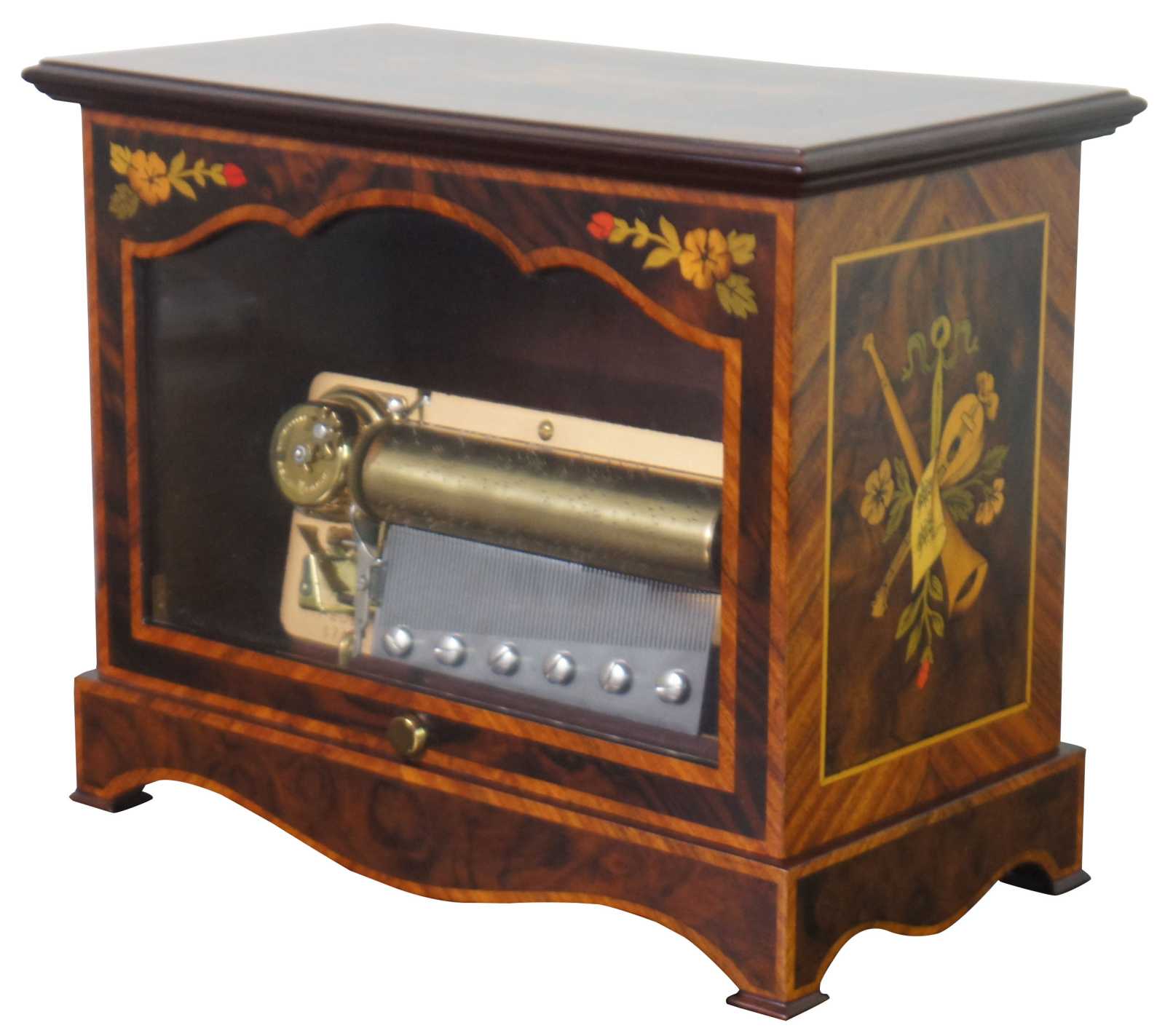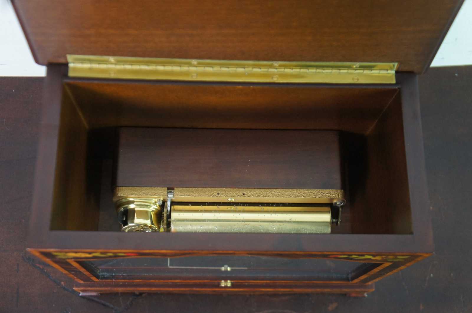 Vintage Reuge Swiss music box number 5725, displayed in a marquetry case decorated with flowers and instruments and a glass front to show the 72 note works. Key is inset on the back; top flips open for access to interior; mechanical stop included on the front.