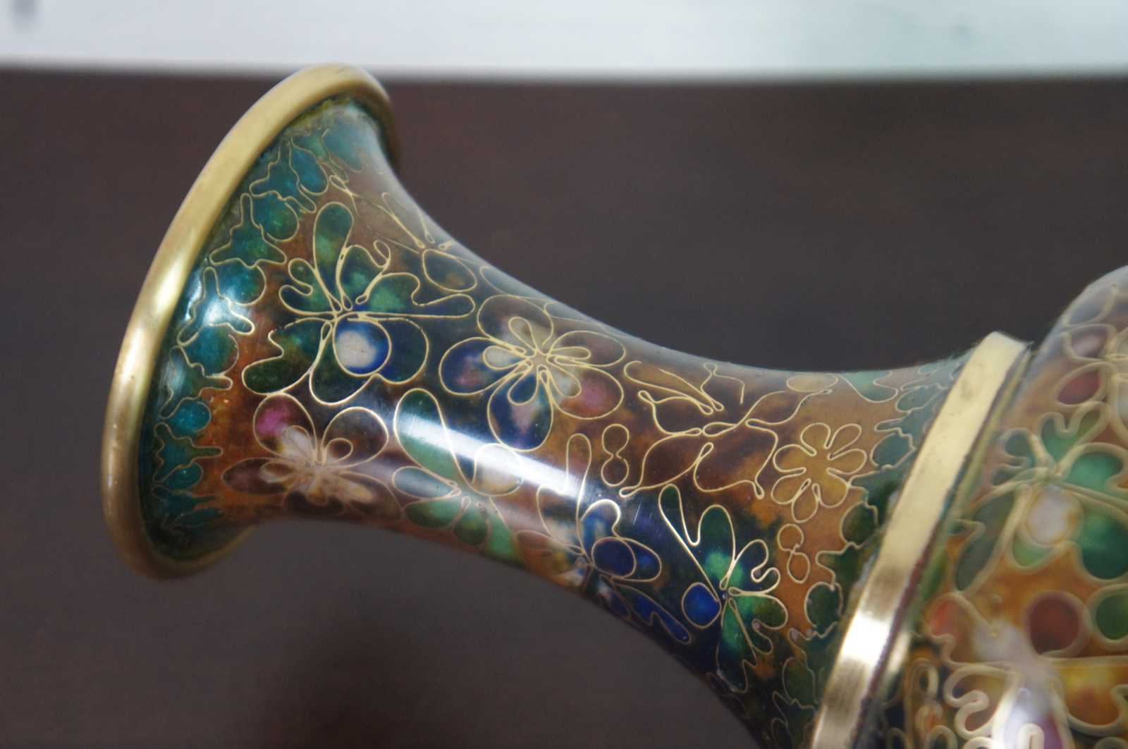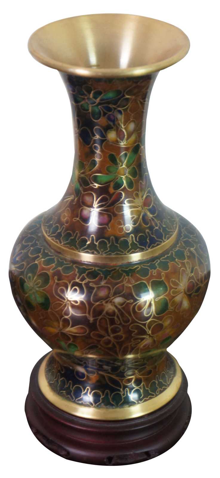 Vintage 1970s to early 1980s cloisonne vase by Robert Kuo. Features a predominantly brown, green and blue floral design and a snugly fitting wooden base. Marked in gold on the base.“Robert Kuo's own story presents a life that partakes of the best of Chinese and 20th century traditions. Born in Beijing, he moved with his family to Taiwan in 1947. Kuo grew up in an artistic environment. His father, an art professor and Chinese watercolor painter, started a cloisonne atelier where Robert became an apprentice at age fifteen. Although he never engaged in formal art studies, Kuo gained technical expertise and learned about decorative tradition from ""hands on"" training. As he mastered each of the steps involved in cloisonne from preparing copper bases to enameling and firing the kilns, Kuo absorbed all the basics that were to serve him throughout his artistic career.