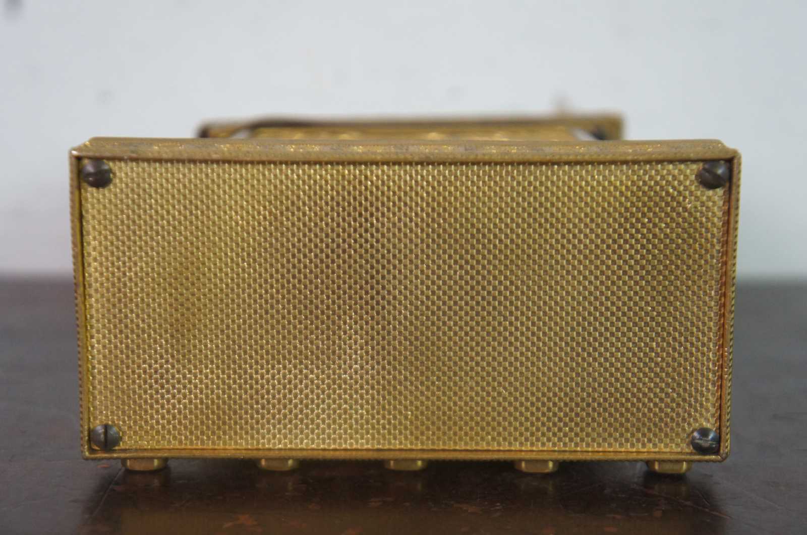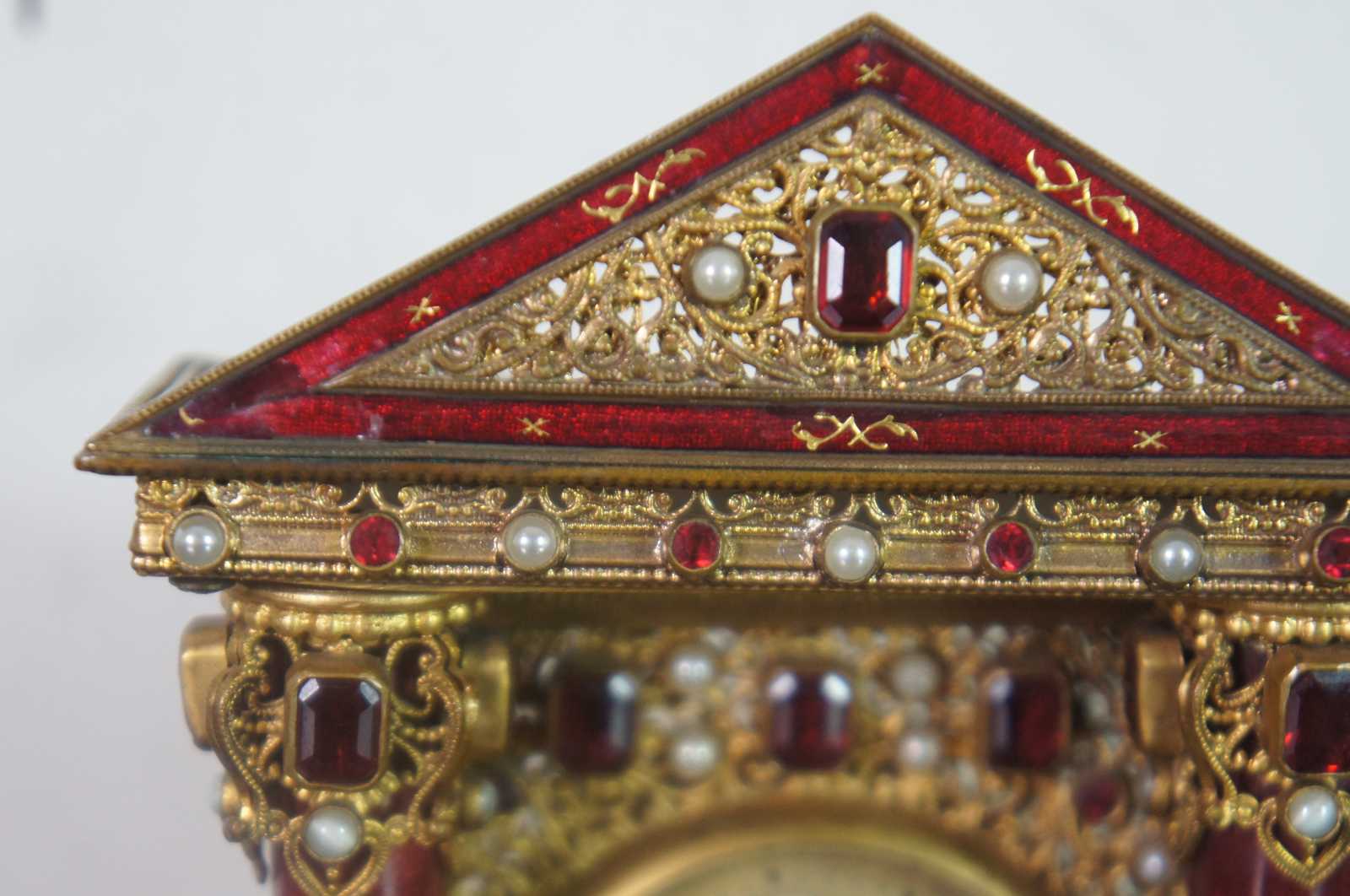 Early 20th century French table clock styled as a neoclassical building crafted of gilded filigree studded with gemstones and pearls, featuring two columns of semi-translucent red enamel columns supporting a triangular pediment. Dial marked T&B Vienna France.