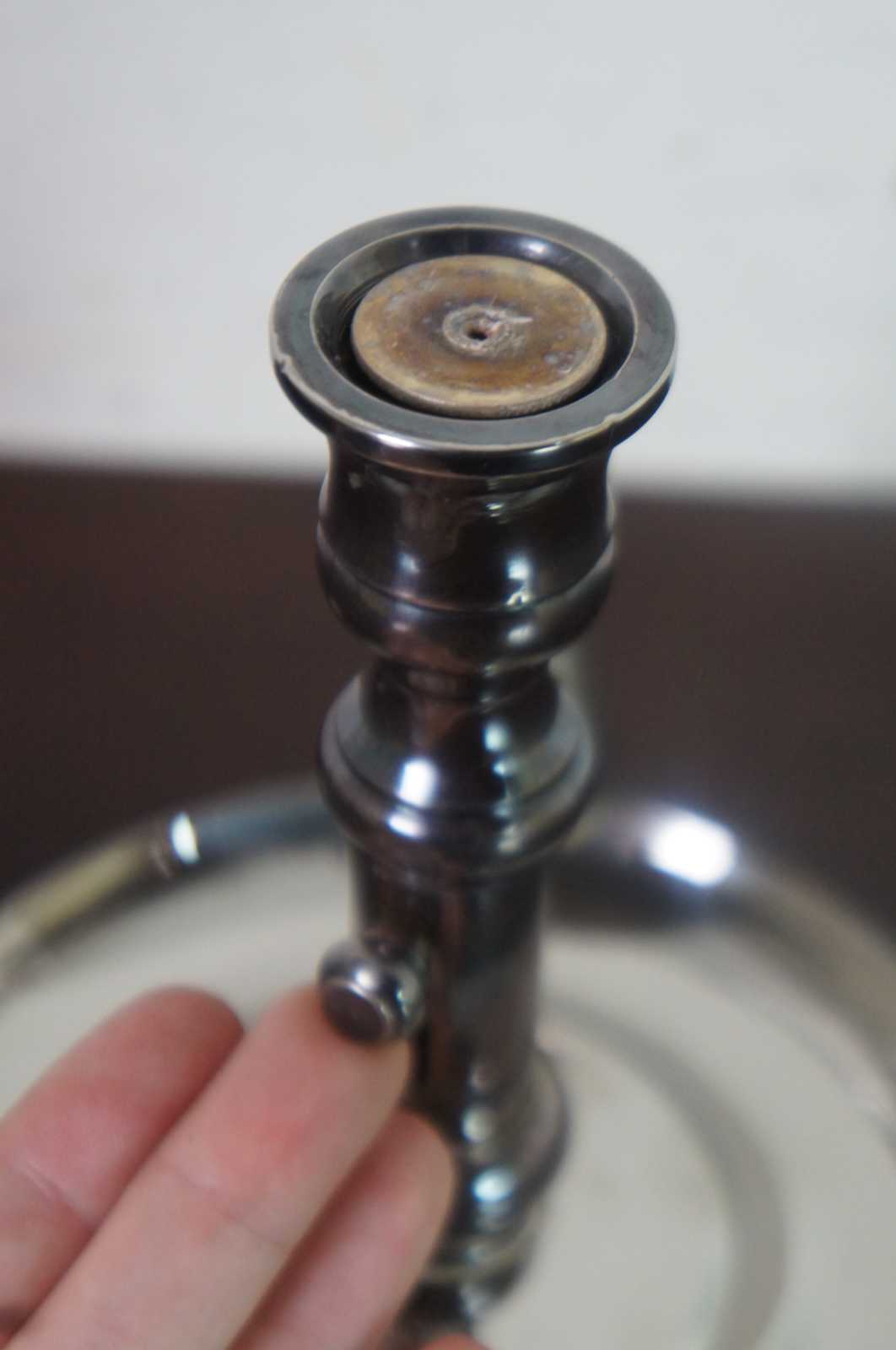Antqiue English Georgian silver plate chamber candlestick with ring handle, snuffer, and push up mechanism to raise the candle as it burns down.
