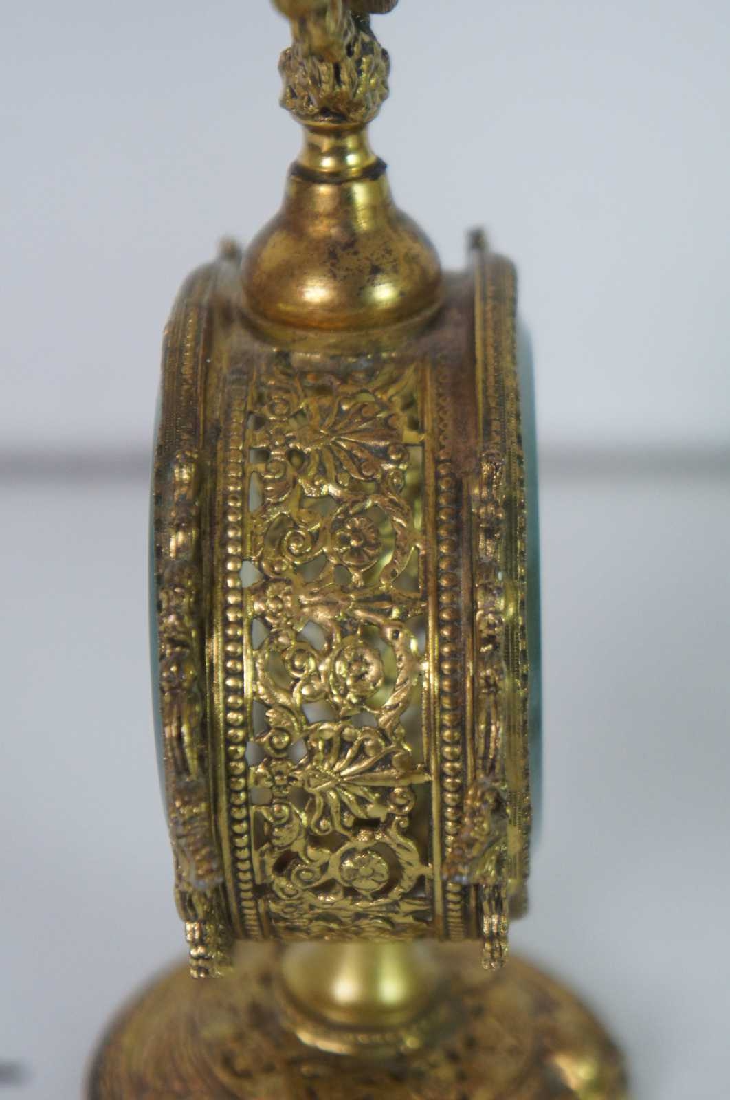 Antique three piece gilded French filigree & glass vanity set, including two perfume bottles with daubers and stand or flower frog with five spaces for make up brushes and six spaces for lipstick tubes or other small bottles.