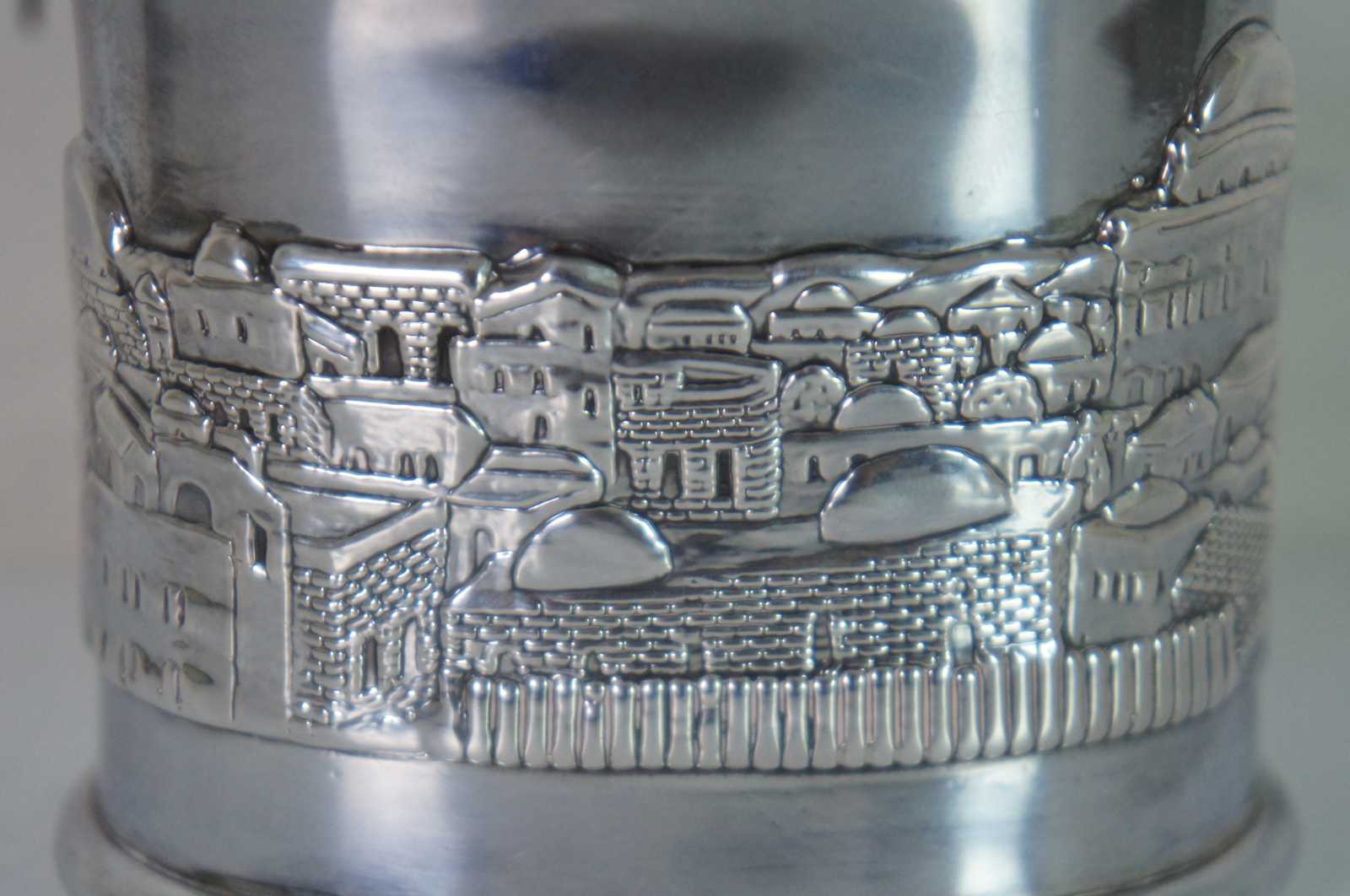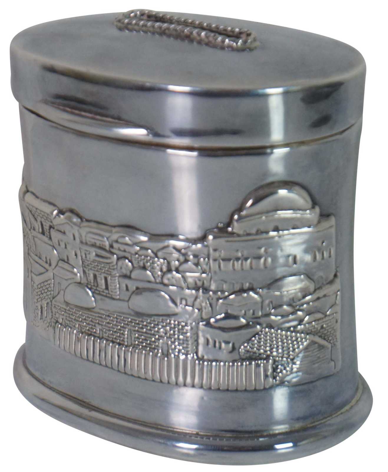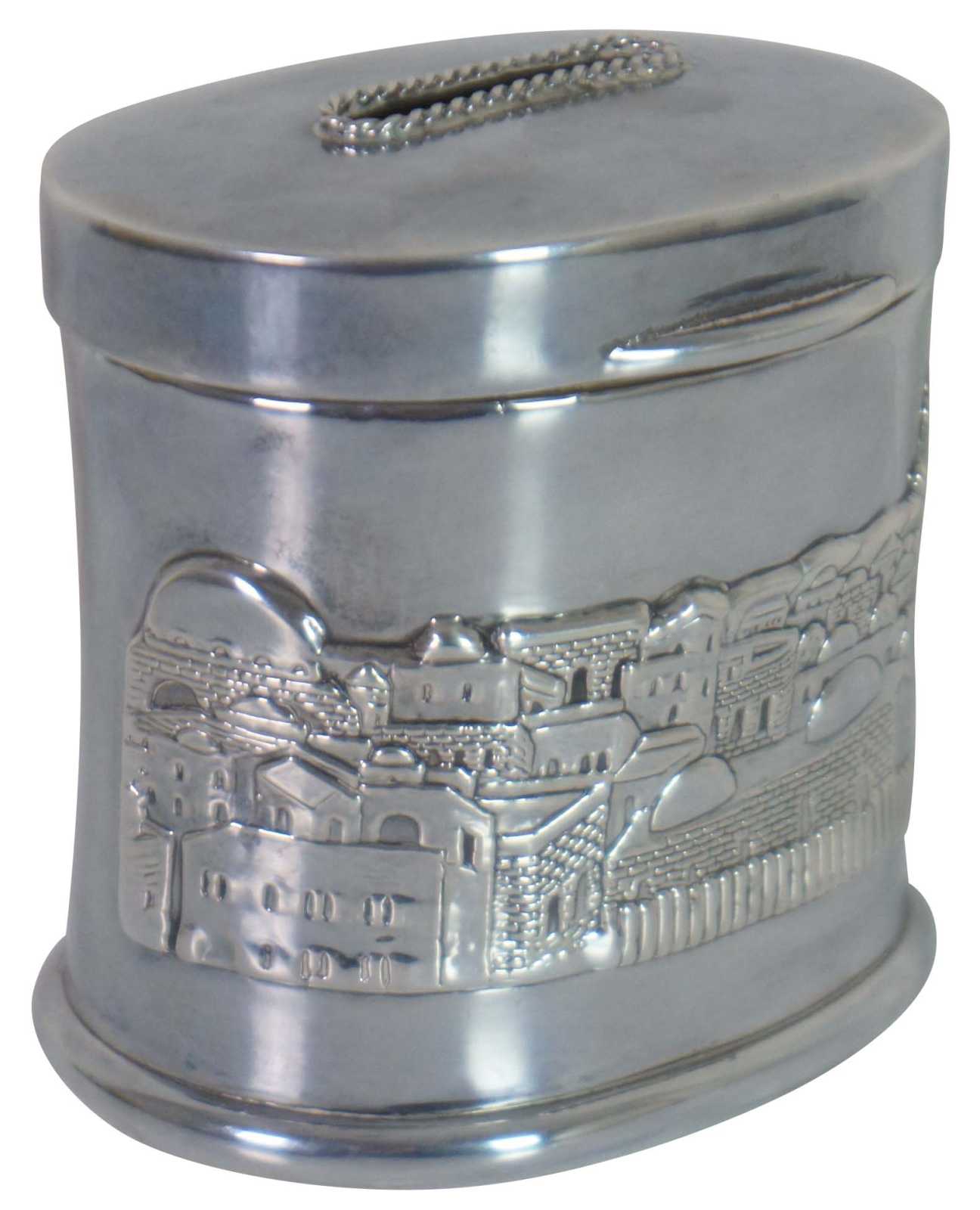 Sharaby 999 pure silver artistain bank with hinged lid, rope twist border and coin slot featuring a repousse cityscape of Jerusalem; sold by Adir Gallery.