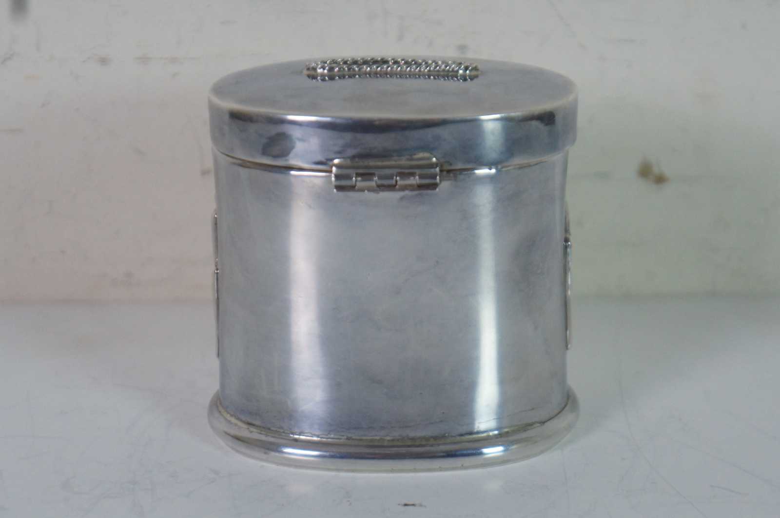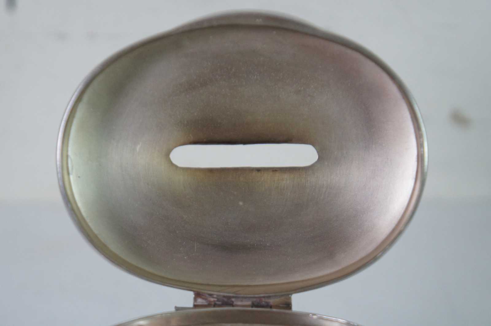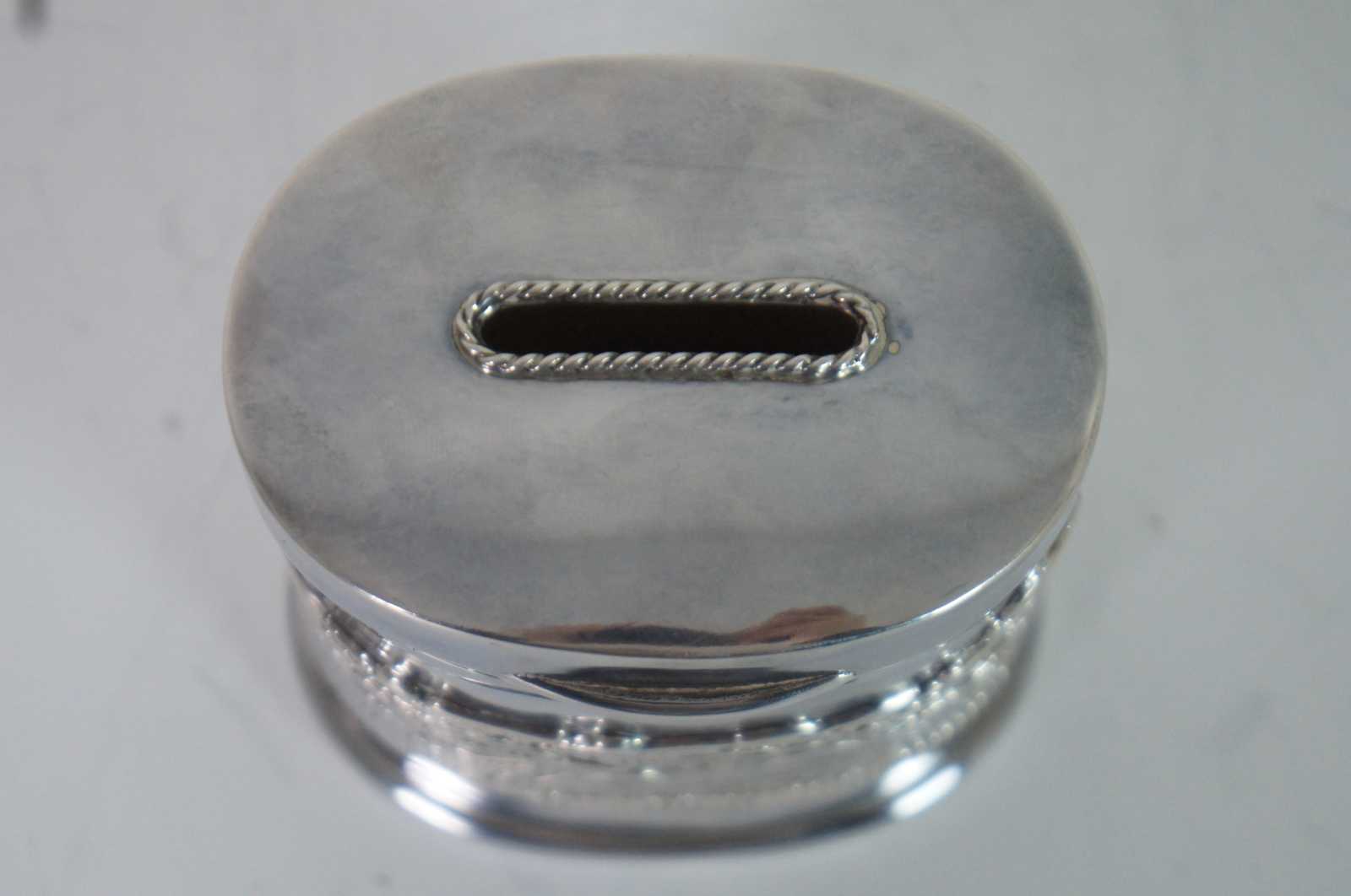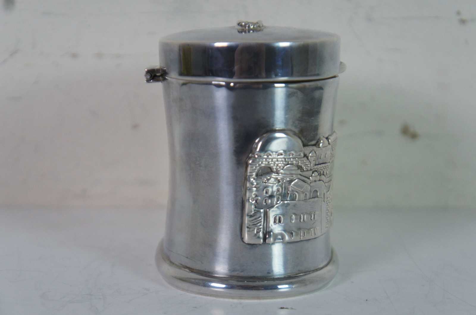 Sharaby 999 pure silver artistain bank with hinged lid, rope twist border and coin slot featuring a repousse cityscape of Jerusalem; sold by Adir Gallery.