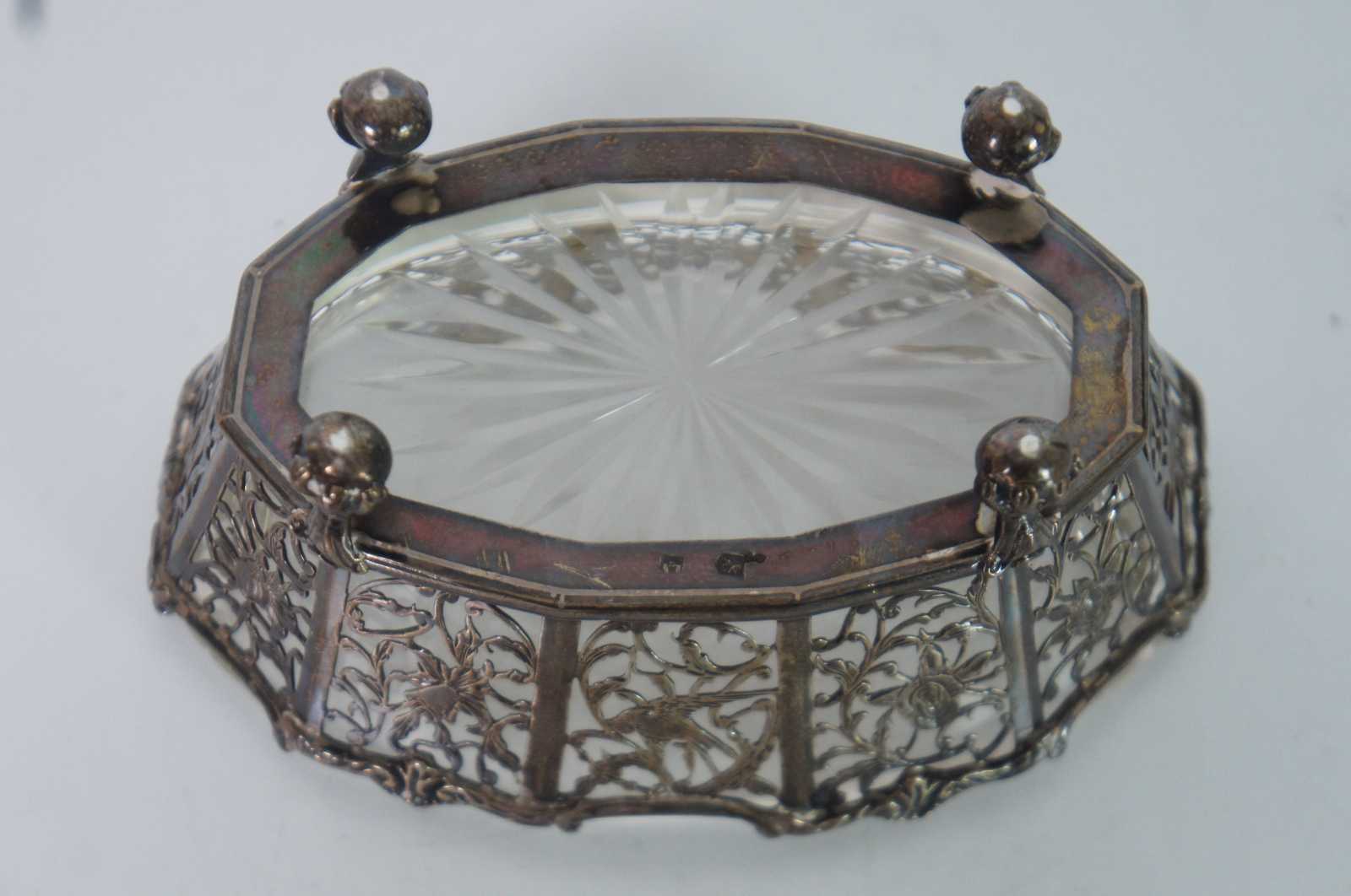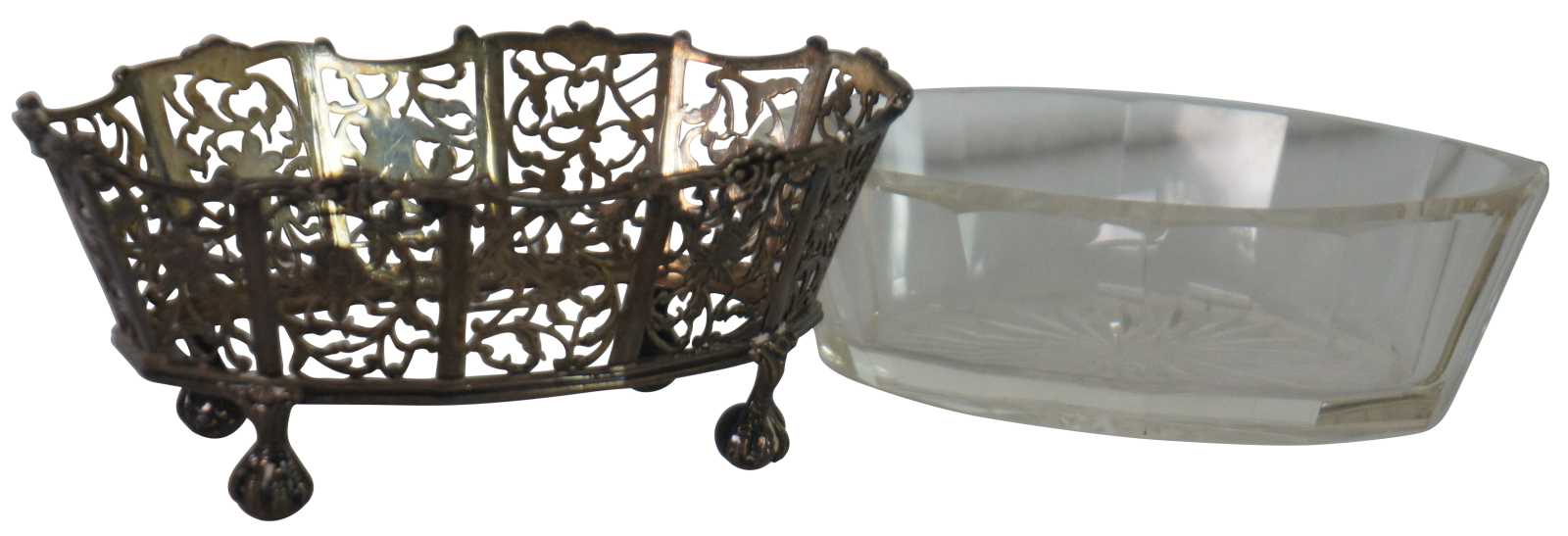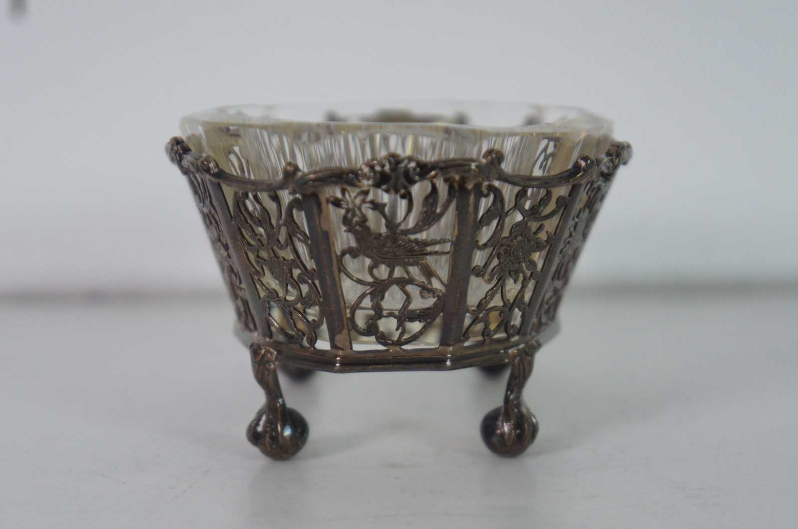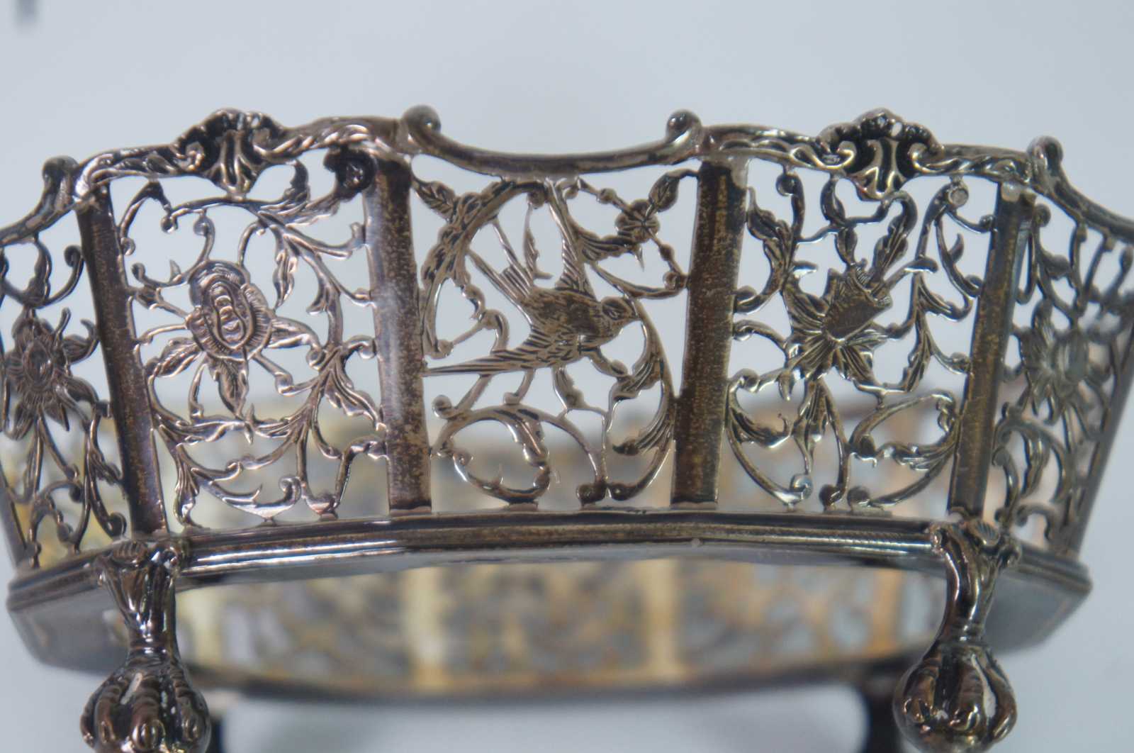Antique Scottish sterling silver, oval basket shaped candy /sugar / dish / vanity / bowl / compote, ornately decorated with pierced birds, flowers and swirling vines, ball and claw feet, and a faceted clear glass insert.