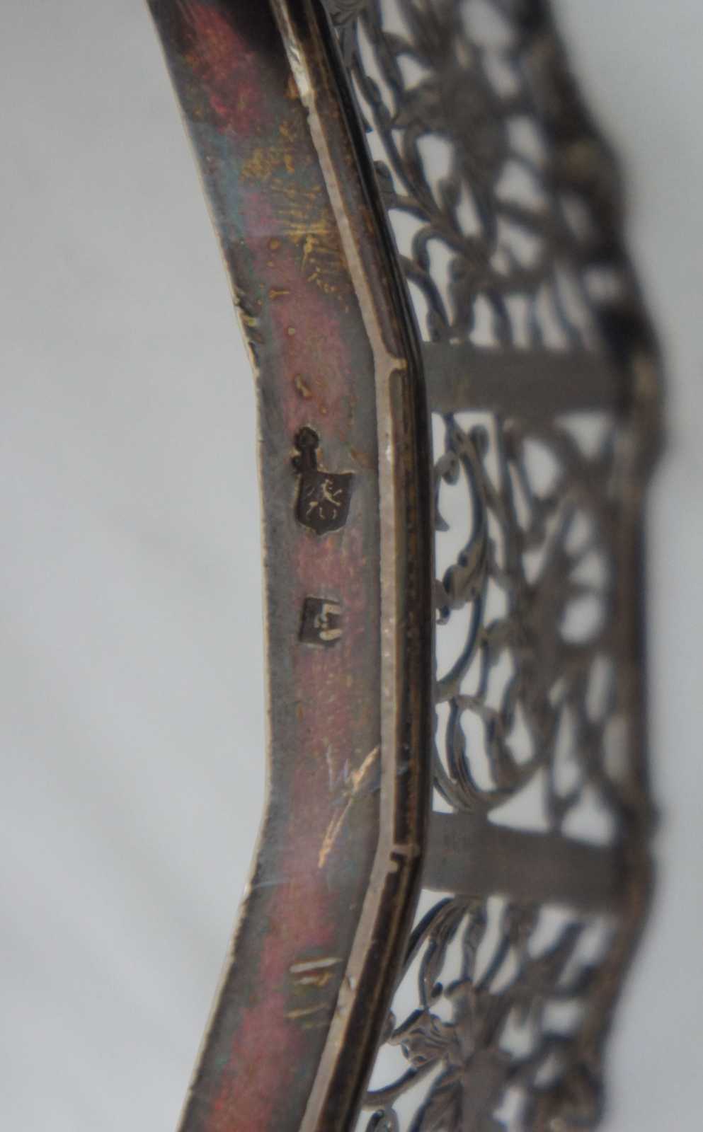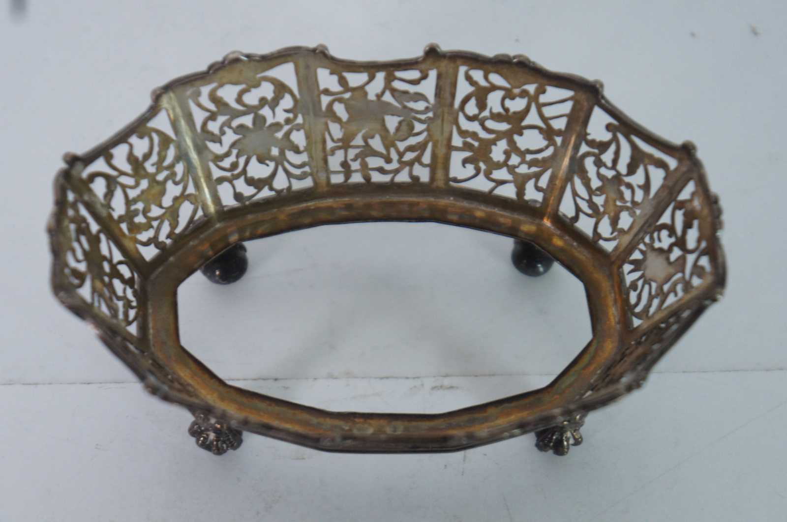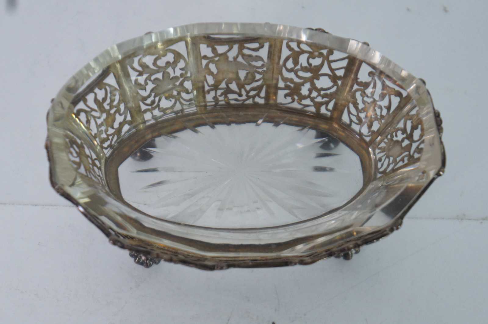Antique Scottish sterling silver, oval basket shaped candy /sugar / dish / vanity / bowl / compote, ornately decorated with pierced birds, flowers and swirling vines, ball and claw feet, and a faceted clear glass insert.