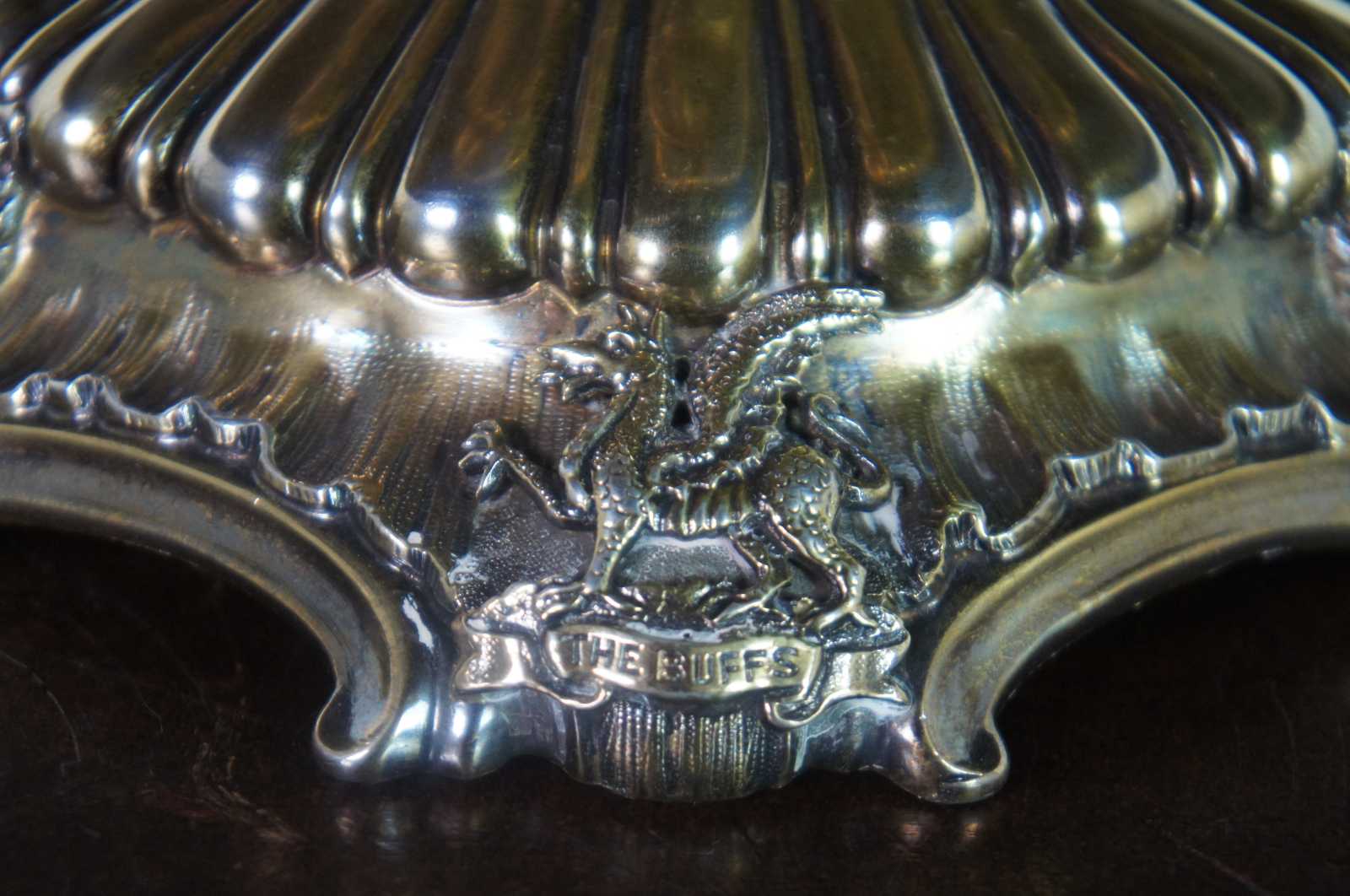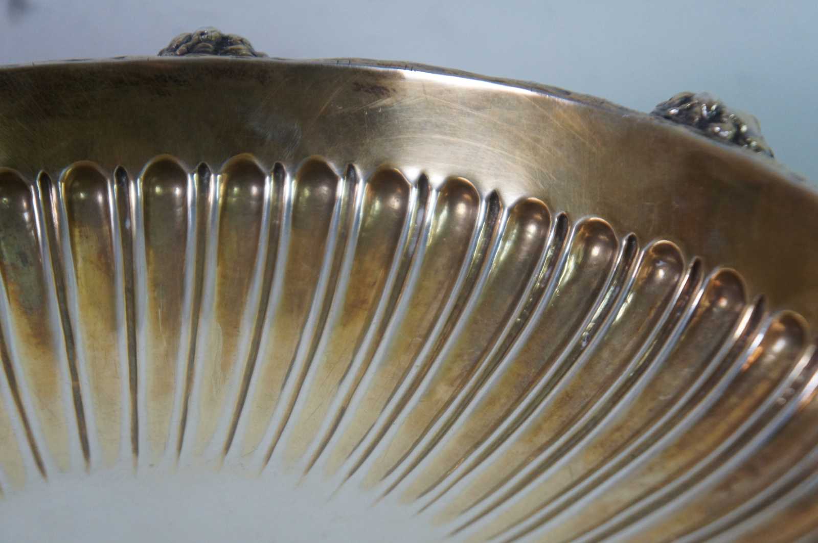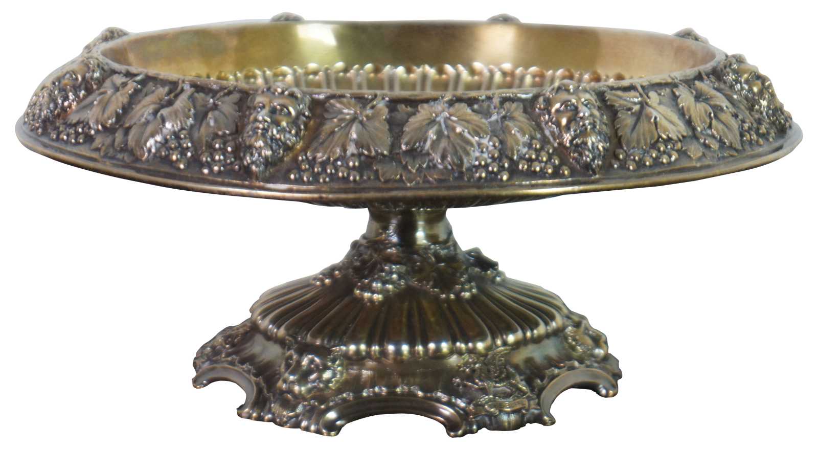 1902 antique English Edwardian sterling silver 925 footed centerpiece compote by Goldsmiths & Silversmiths Co of London. Features stamped and fluted design of grapevines with figural face of a bearded man (Dionysus) along the top and a fox / wolf / cat along the base accompanied by The Buffs badge, a winged griffon / gryphon / dragon referred to as East Kent Regimental Dragon Badge.