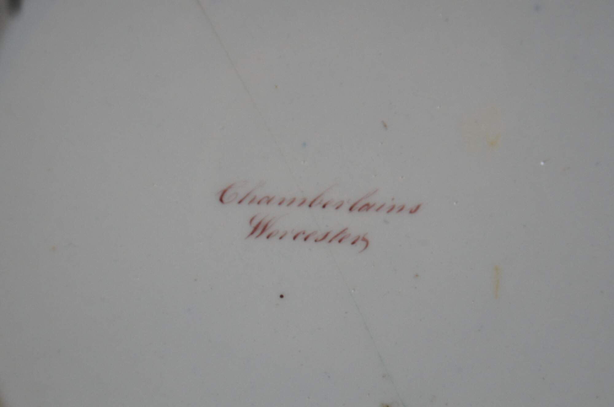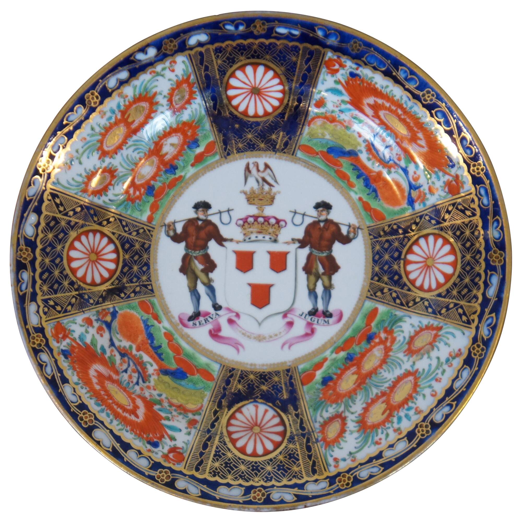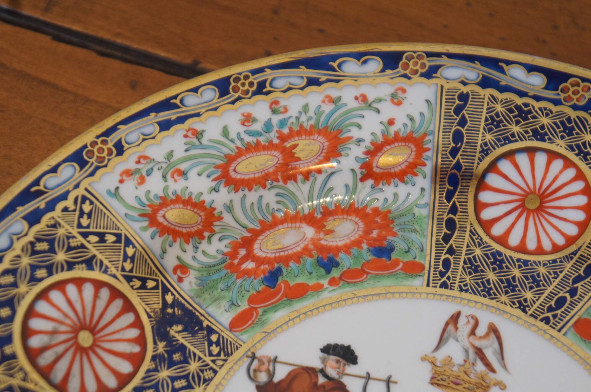 Pair of antique porcelain plates made circa 1800 by Chamberlains Worcester, featuring ornate gilded floral motifs surrounding a pair of figures flanking a crowned rendition of the Clan Hay armorial coat of arms / crest. Motto Serva Jugum, meaning, Keep the Yoke.