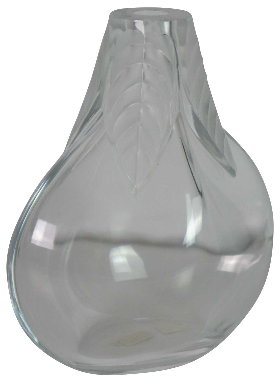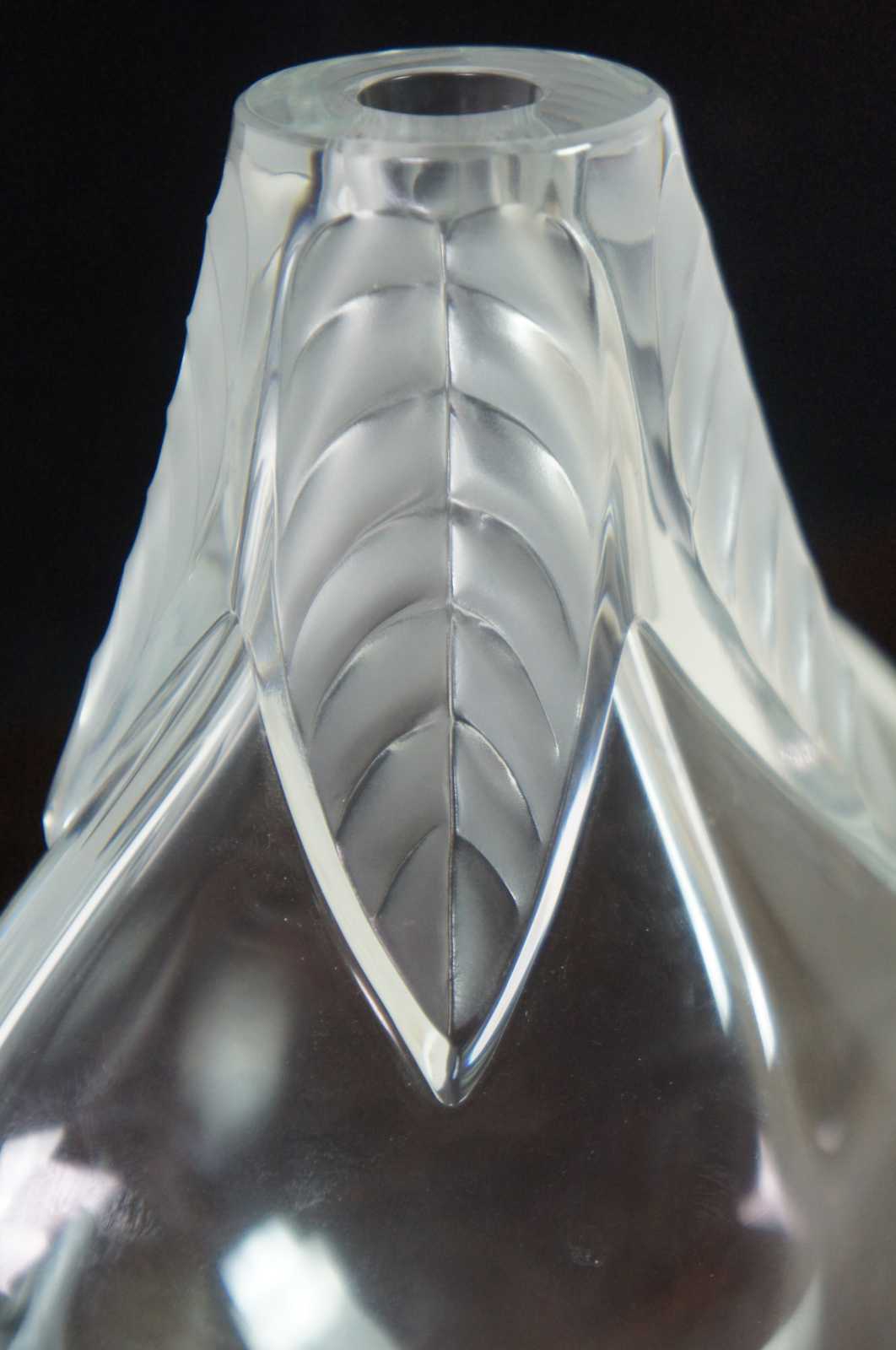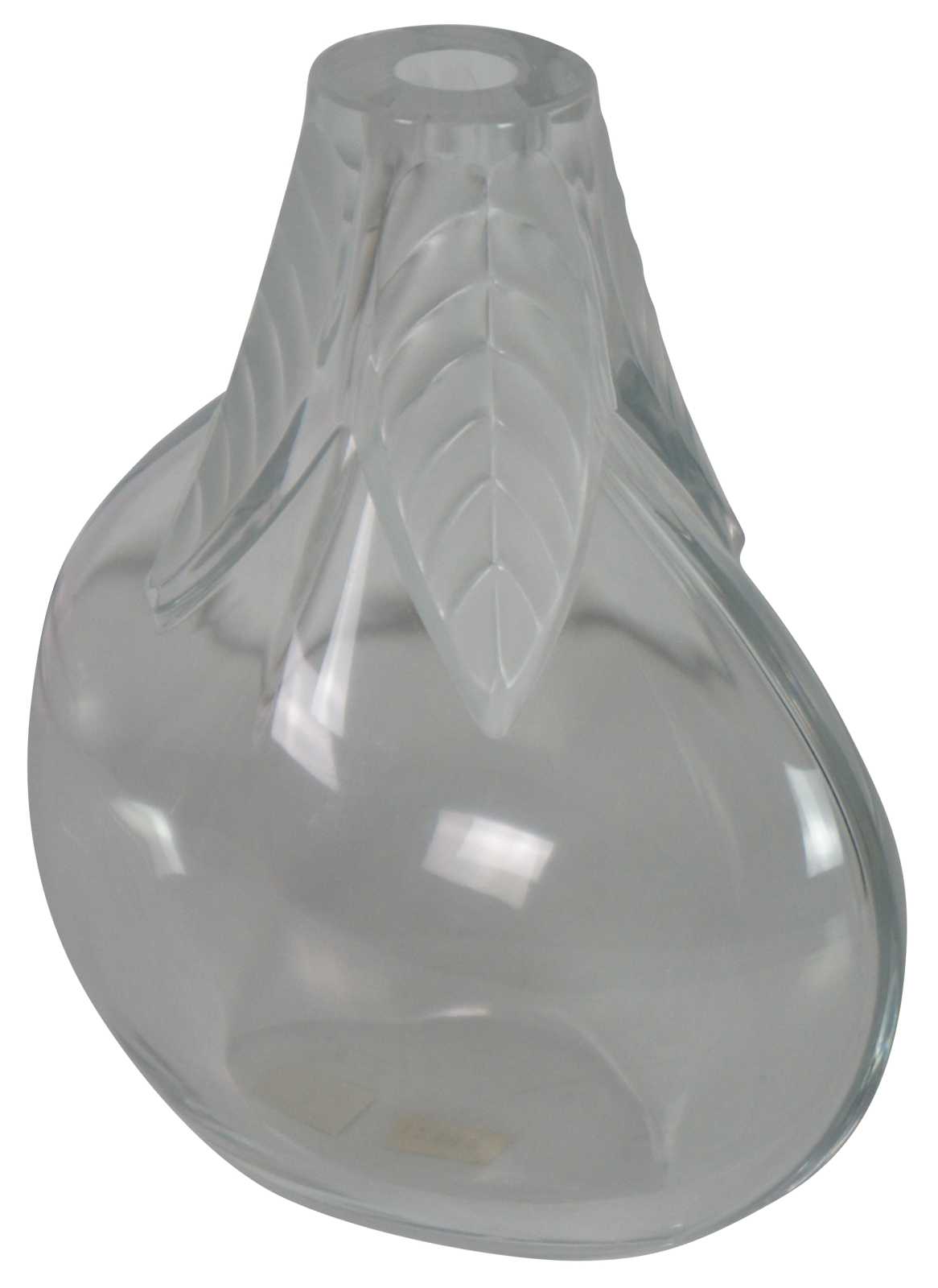 Vintage Lalique France Osumi Leaf crystal bottle shaped vase with a border of frosted leaves around the mouth. 12302.