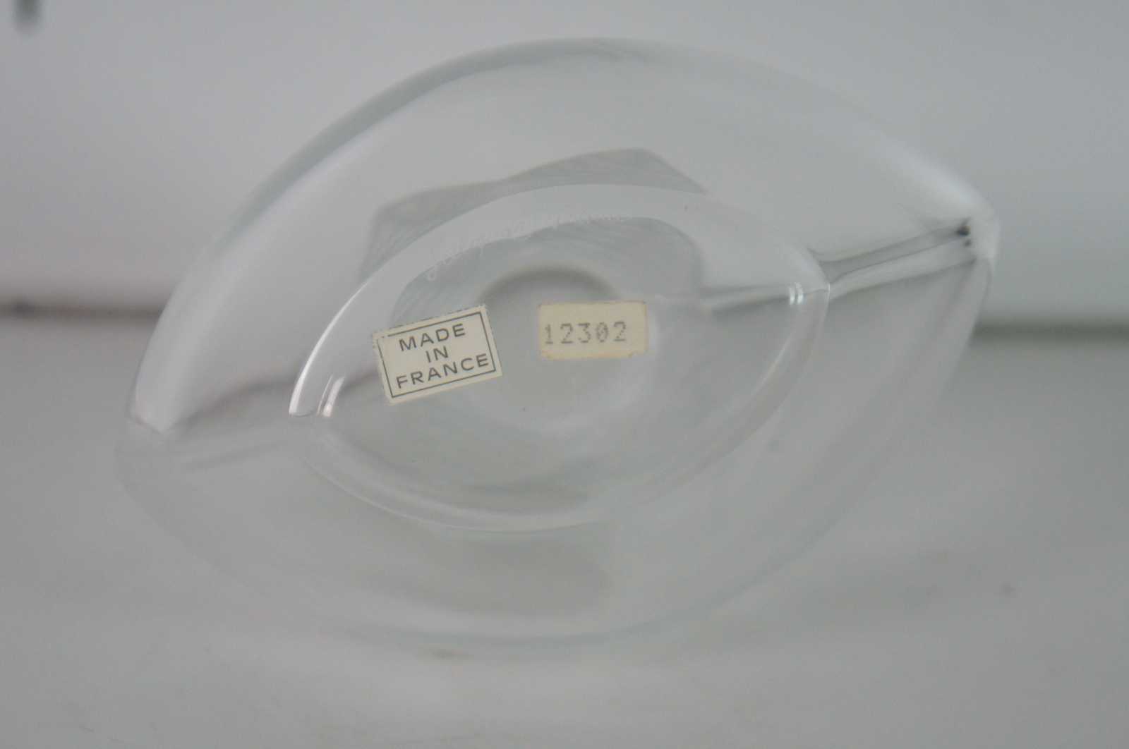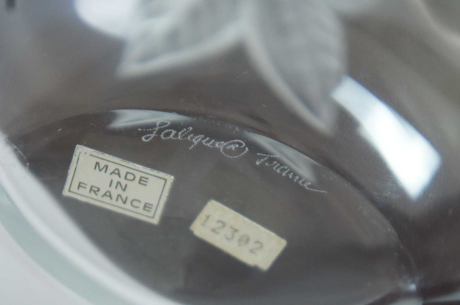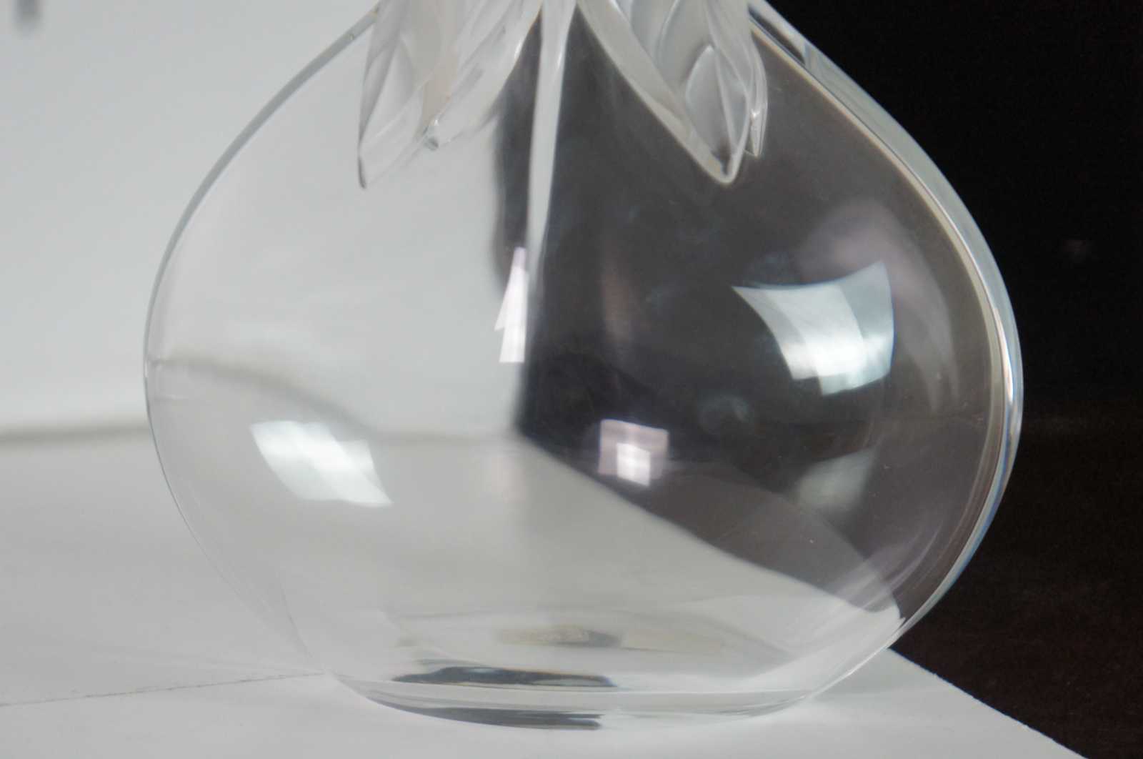 Vintage Lalique France Osumi Leaf crystal bottle shaped vase with a border of frosted leaves around the mouth. 12302.