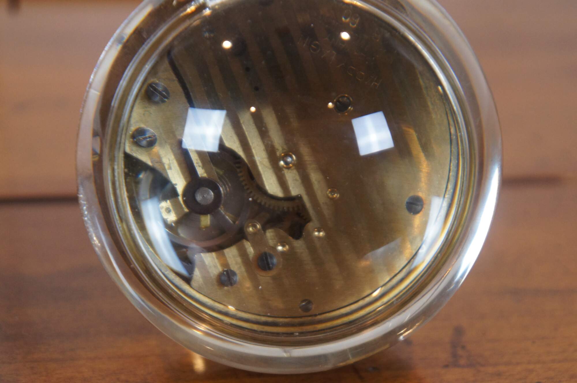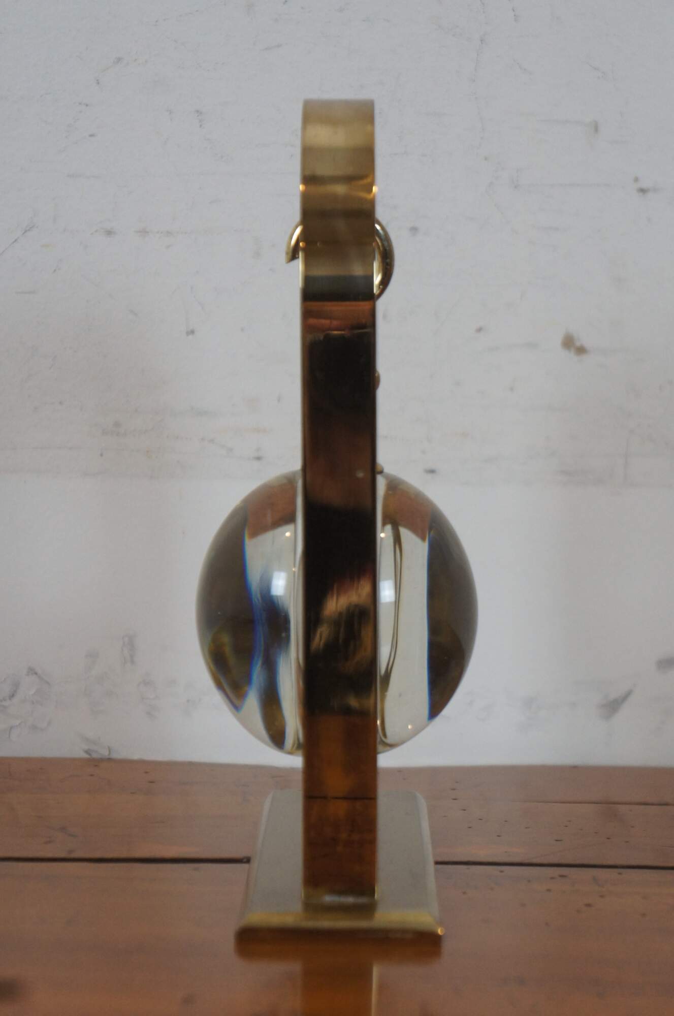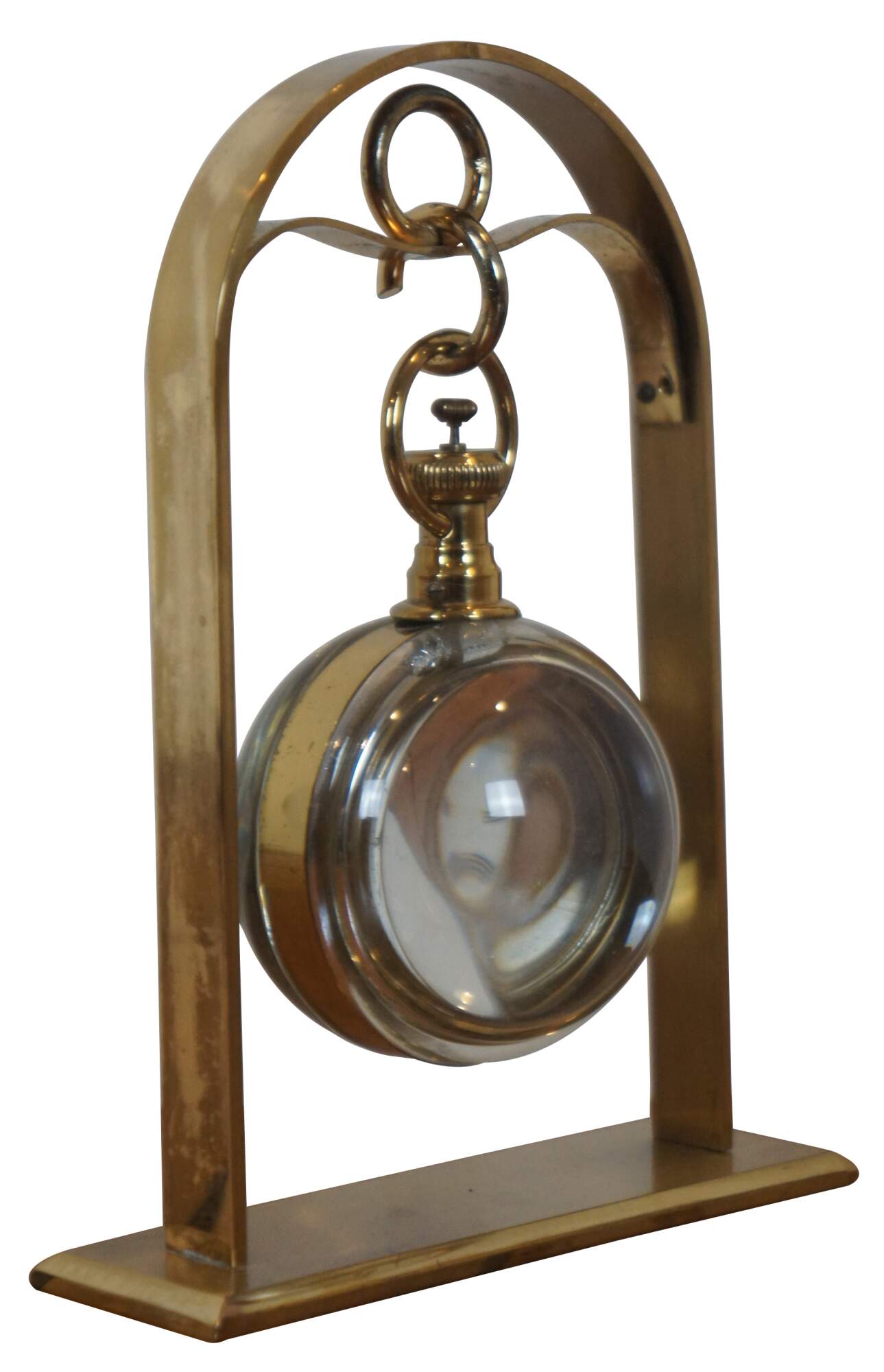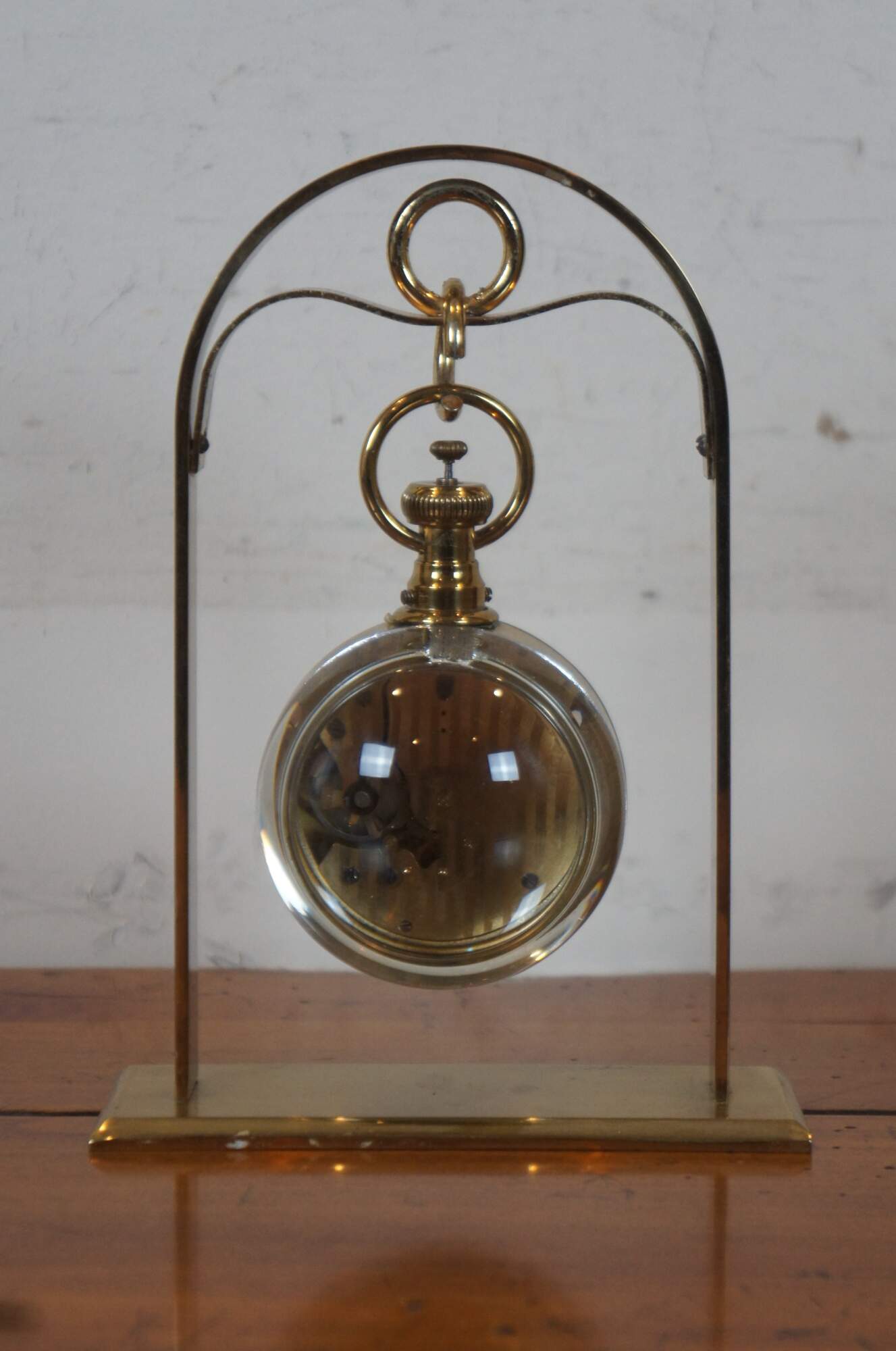 Mid century Henri Lagin Cie desk clock featuring a gold tone arch from which hangs a brass pocket watch inside a crystal paperweight orb / ball.