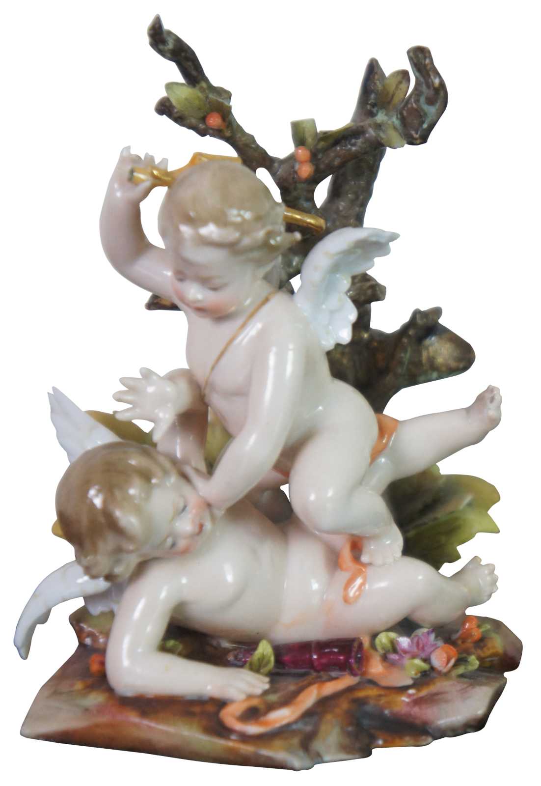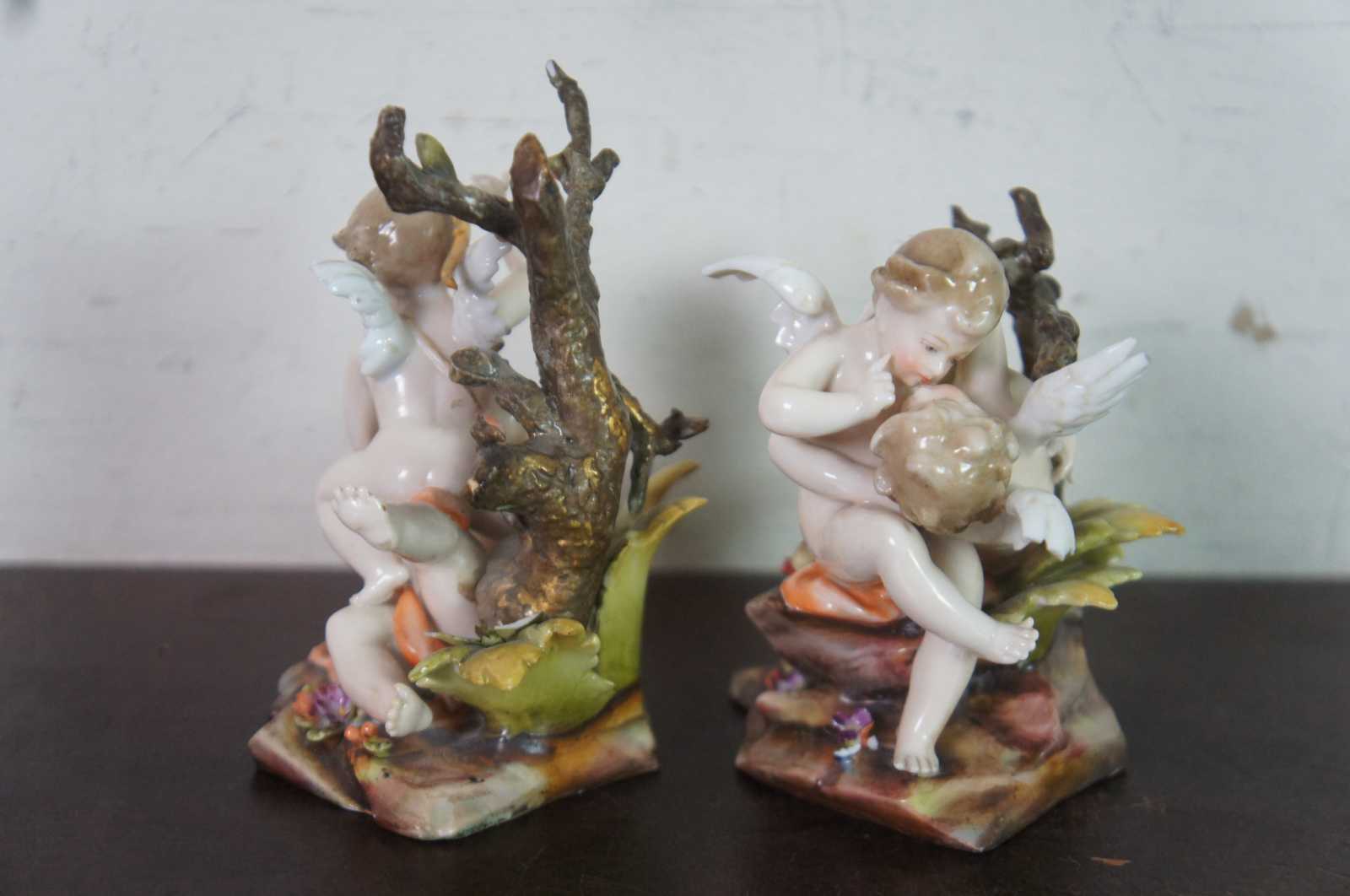 Pair of two rare early 20th century German Volkstedter porcelain figurines showing pairs of cherubs / angels / putti / cupids tumbling among rocks and trees, made by Richard Eckert in Volkstedt around 1905. This factory was affiliated to the oldest Volkstedter porcelain factory in the 1930s.