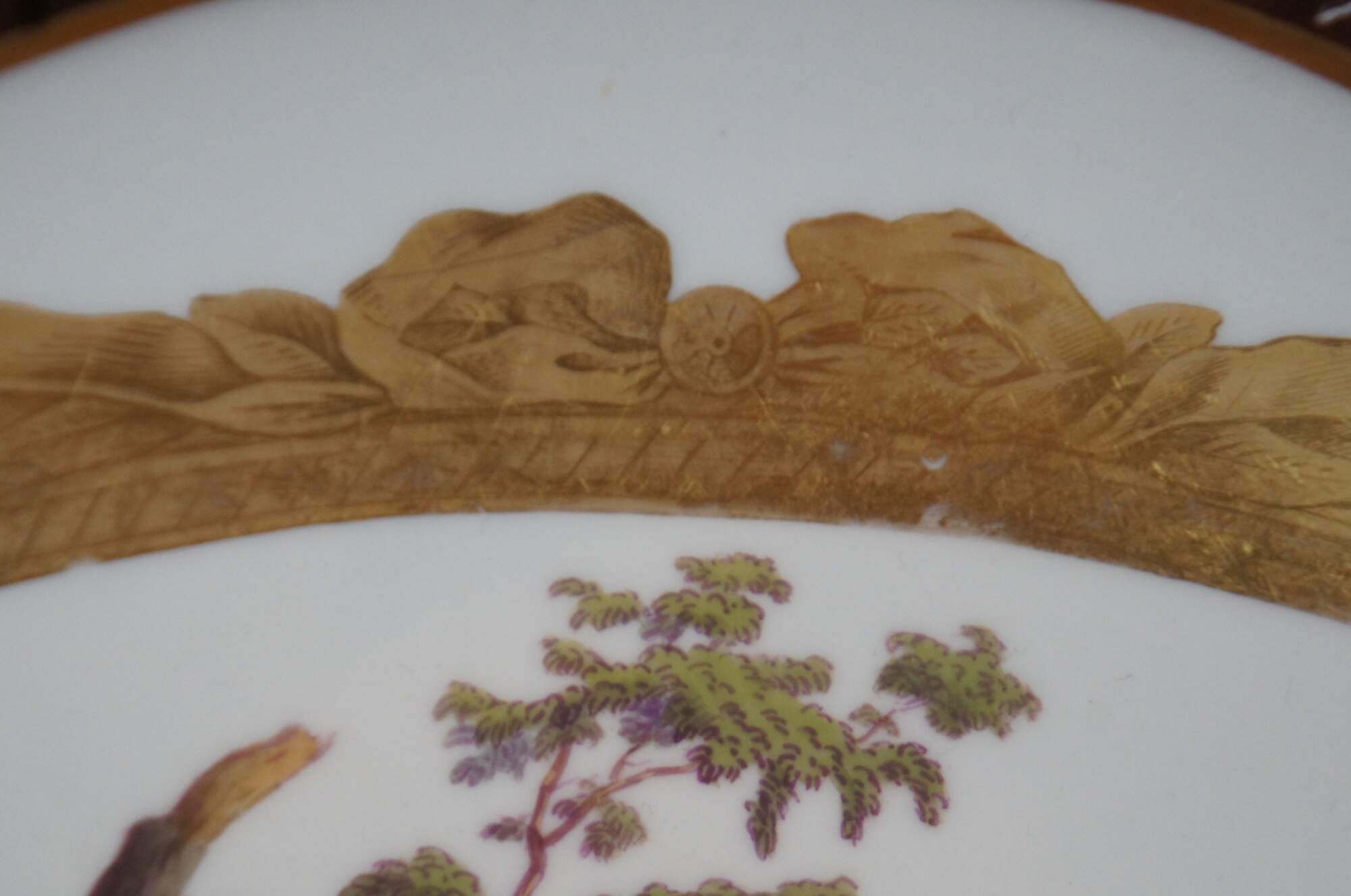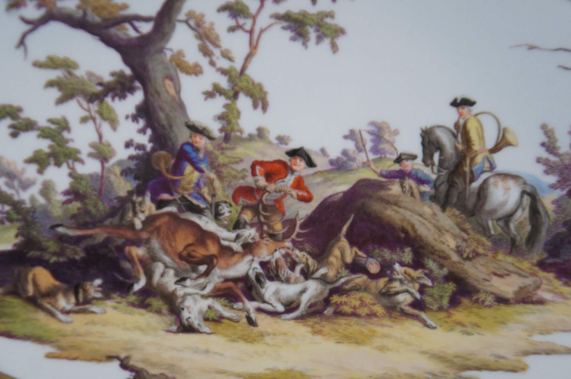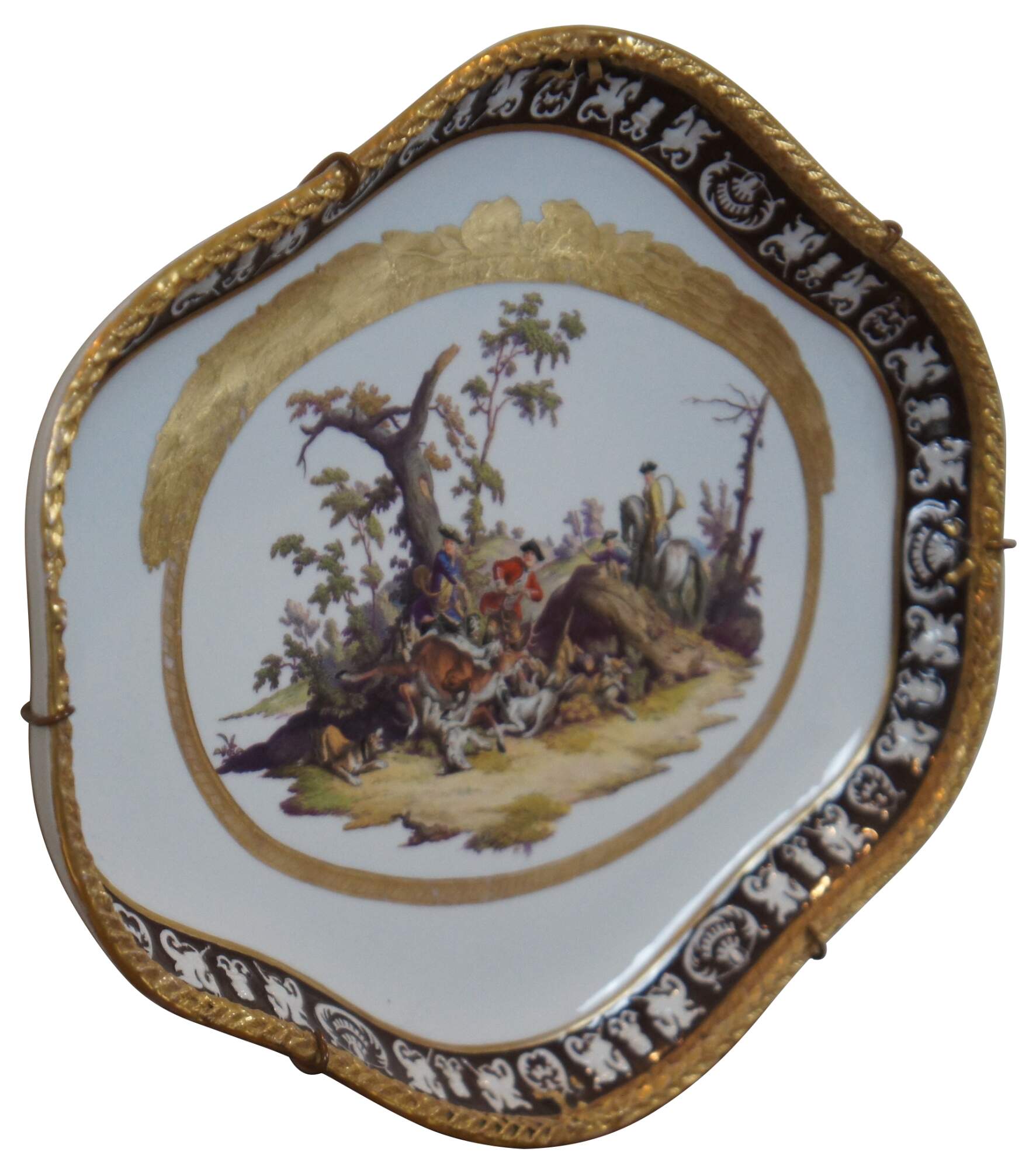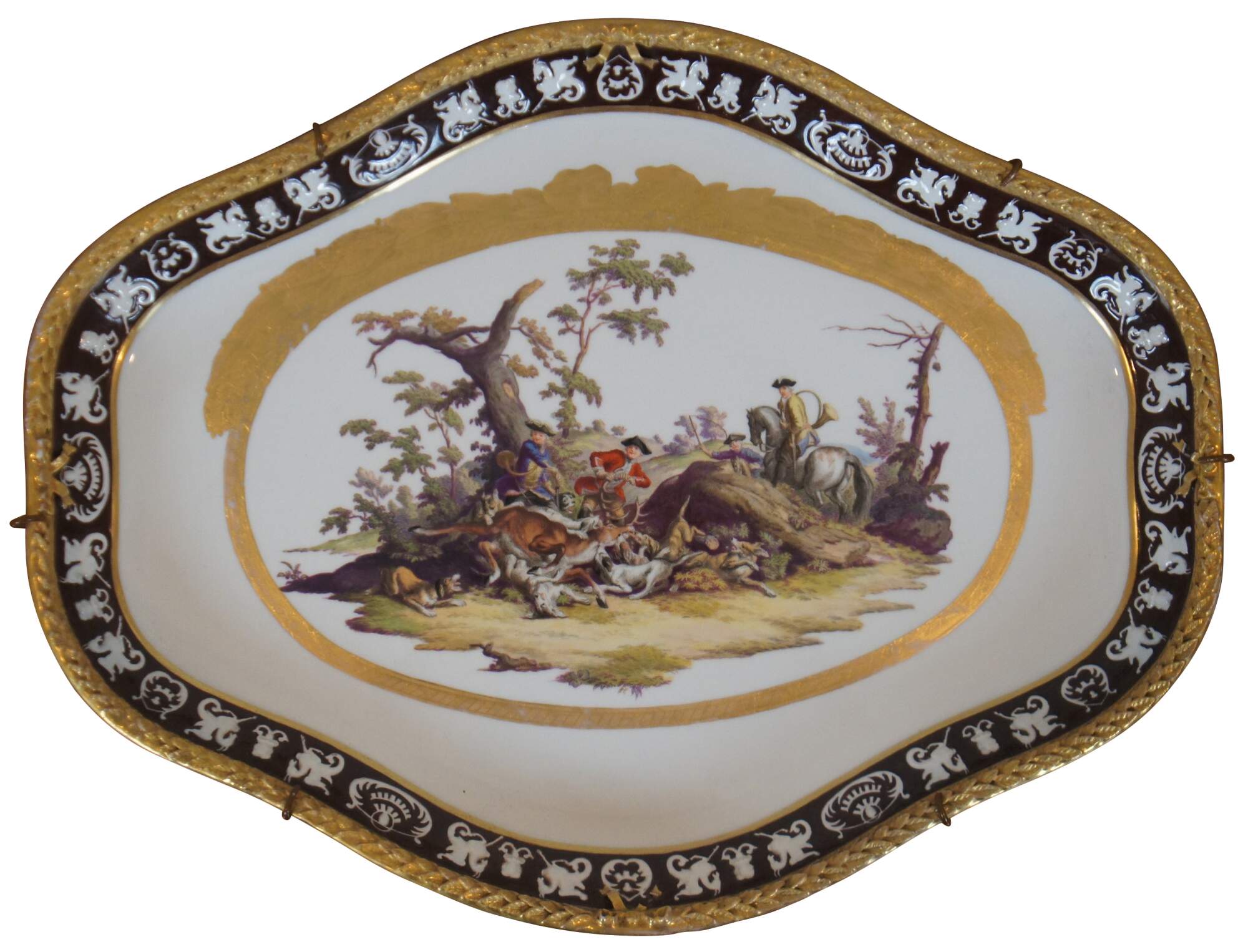 Antique Meissen porcelain Tete a Tete serving platter with a molded neoclassical and dragon motif around the edge and a hunting scene that features a deer / stag being brought down by a team of dogs and men. Marked with crossed swords topped with a star, used from 1774-1814.