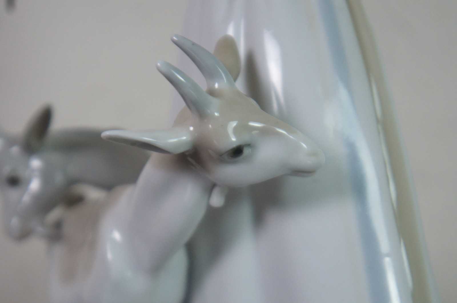 Vintage Lladro Spain porcelain figurine titled “Shepherdess with goats,” number 1001, featuring a shepherdess holding a baby goat with two other goats at her feet.
