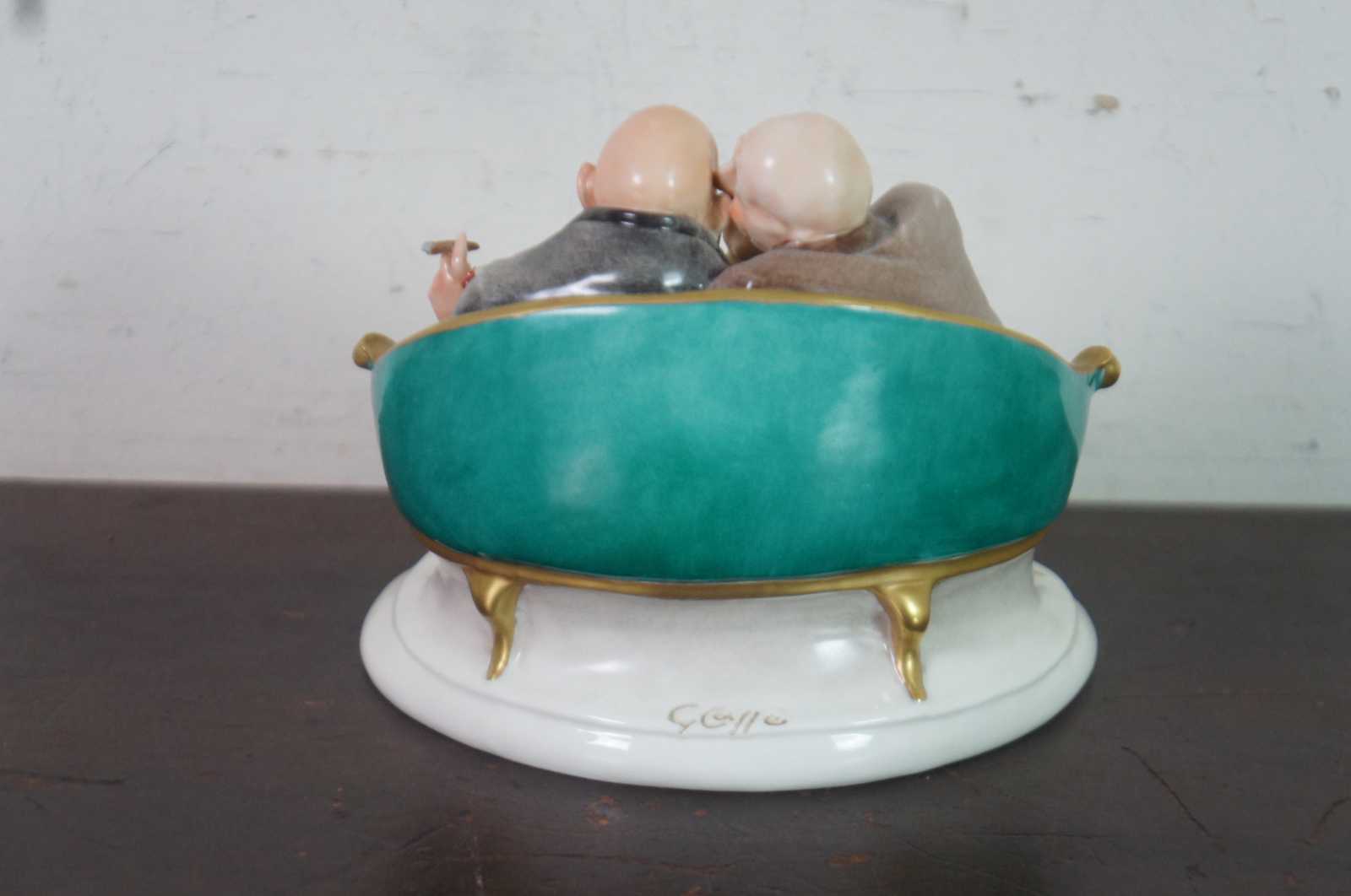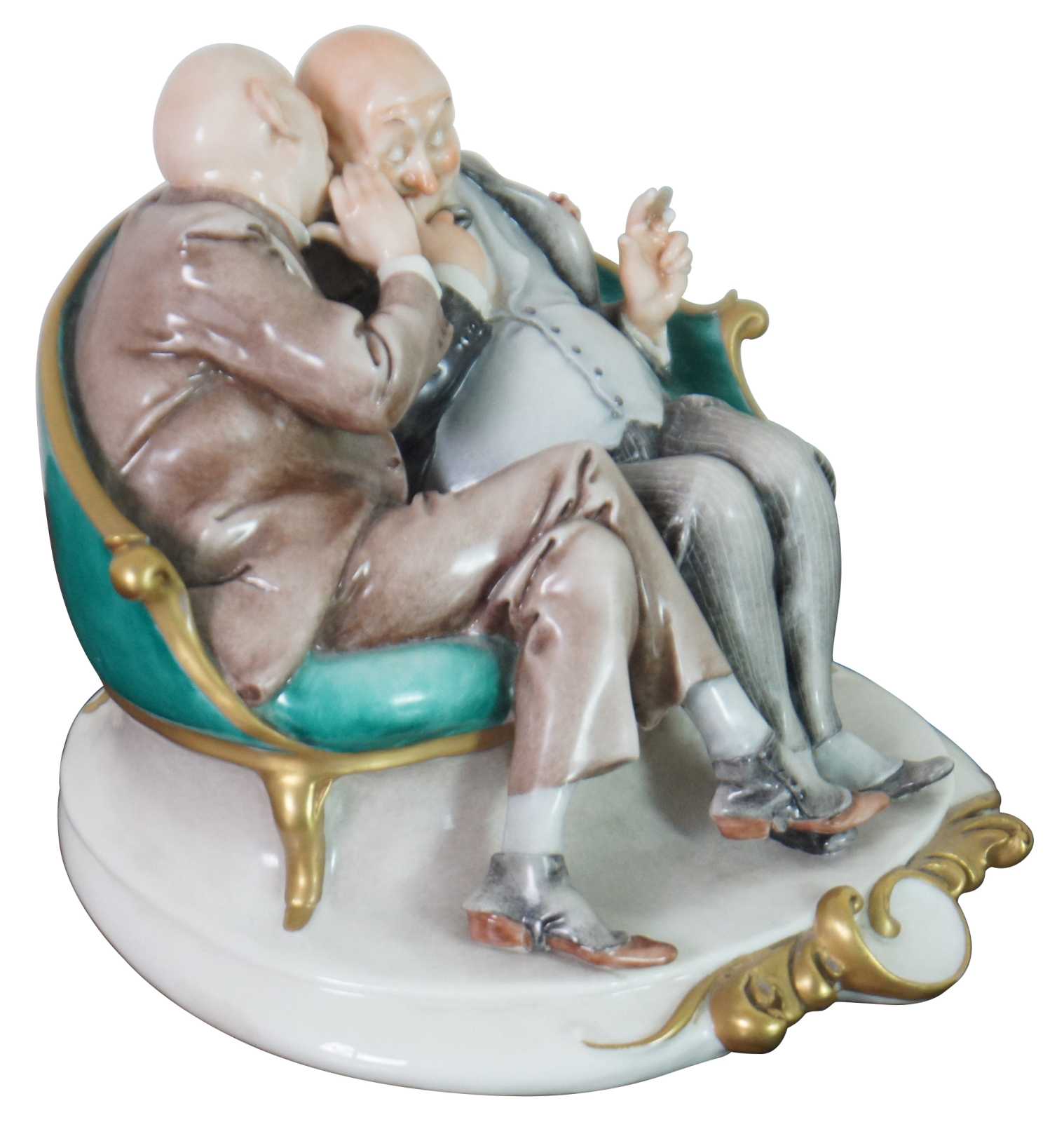 Vintage Italian Giusseppe Cappe porcelain figurine featuring two old men sitting in a parlor smoking cigars and gossiping / telling jokes on a couch / settee.