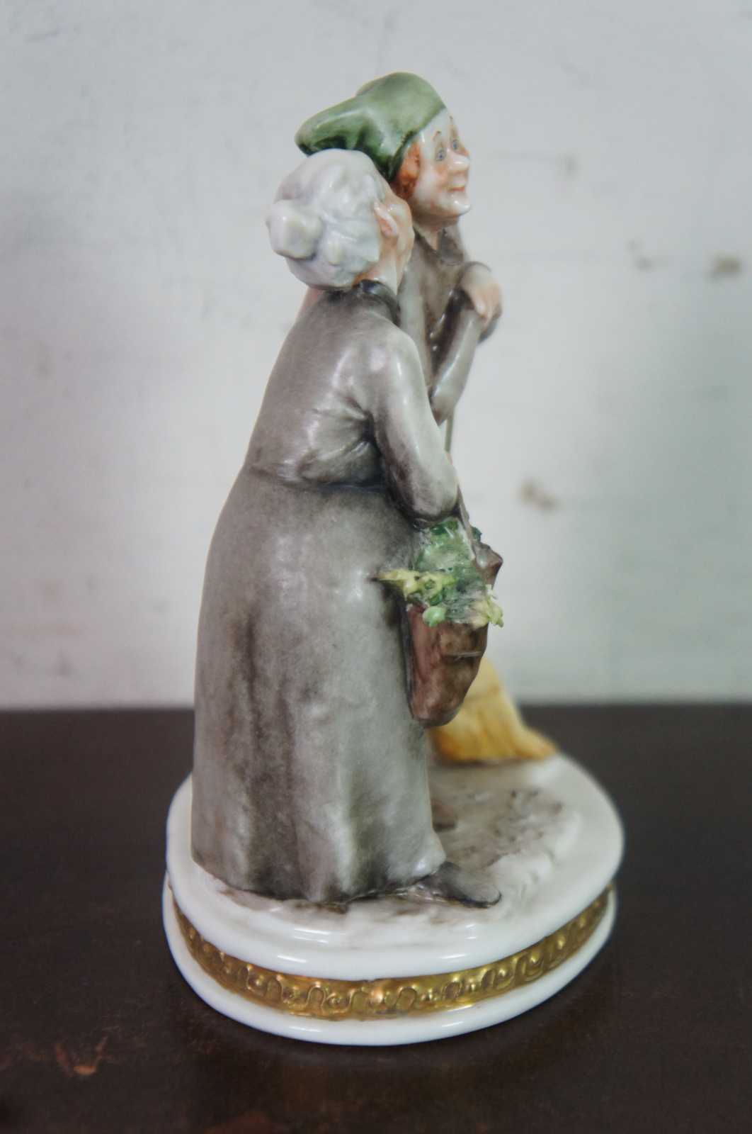 Rare original Italian Giuseppe Cappe Capodimonte porcelain figurine featuring two elderly women, one with a broom, and the other with groceries, whispering / gossiping to each other, next to a small white cat. Made in Italy, 5 prong crown N mark.