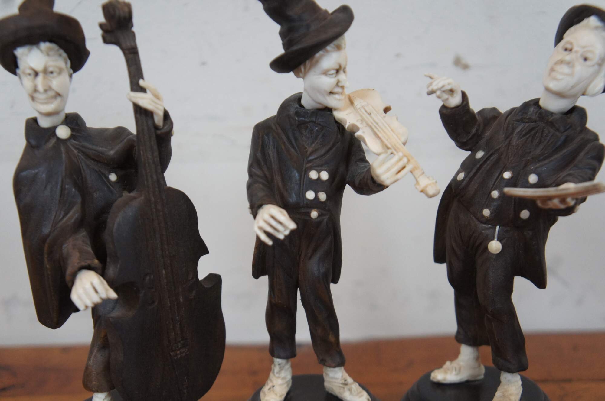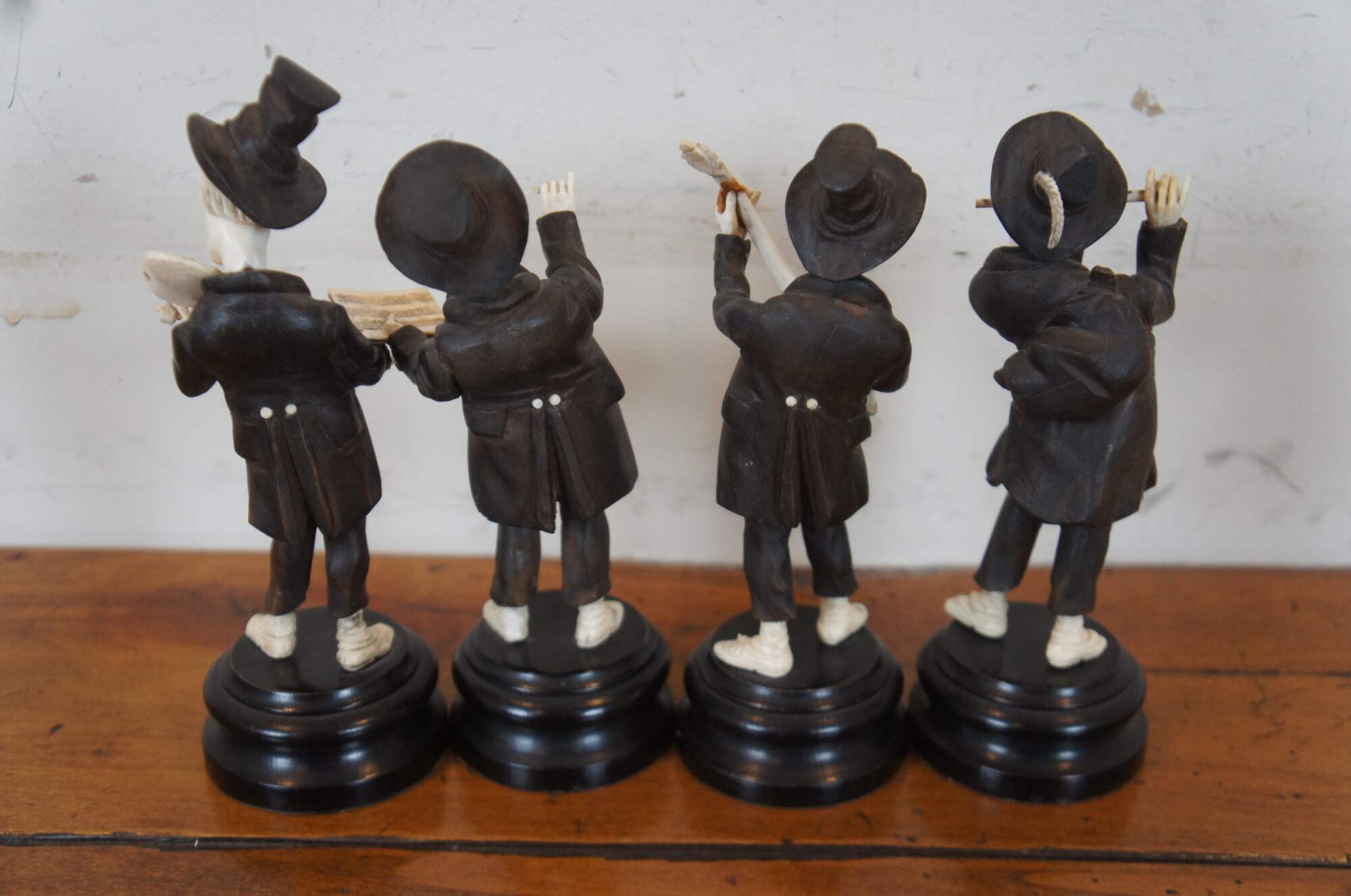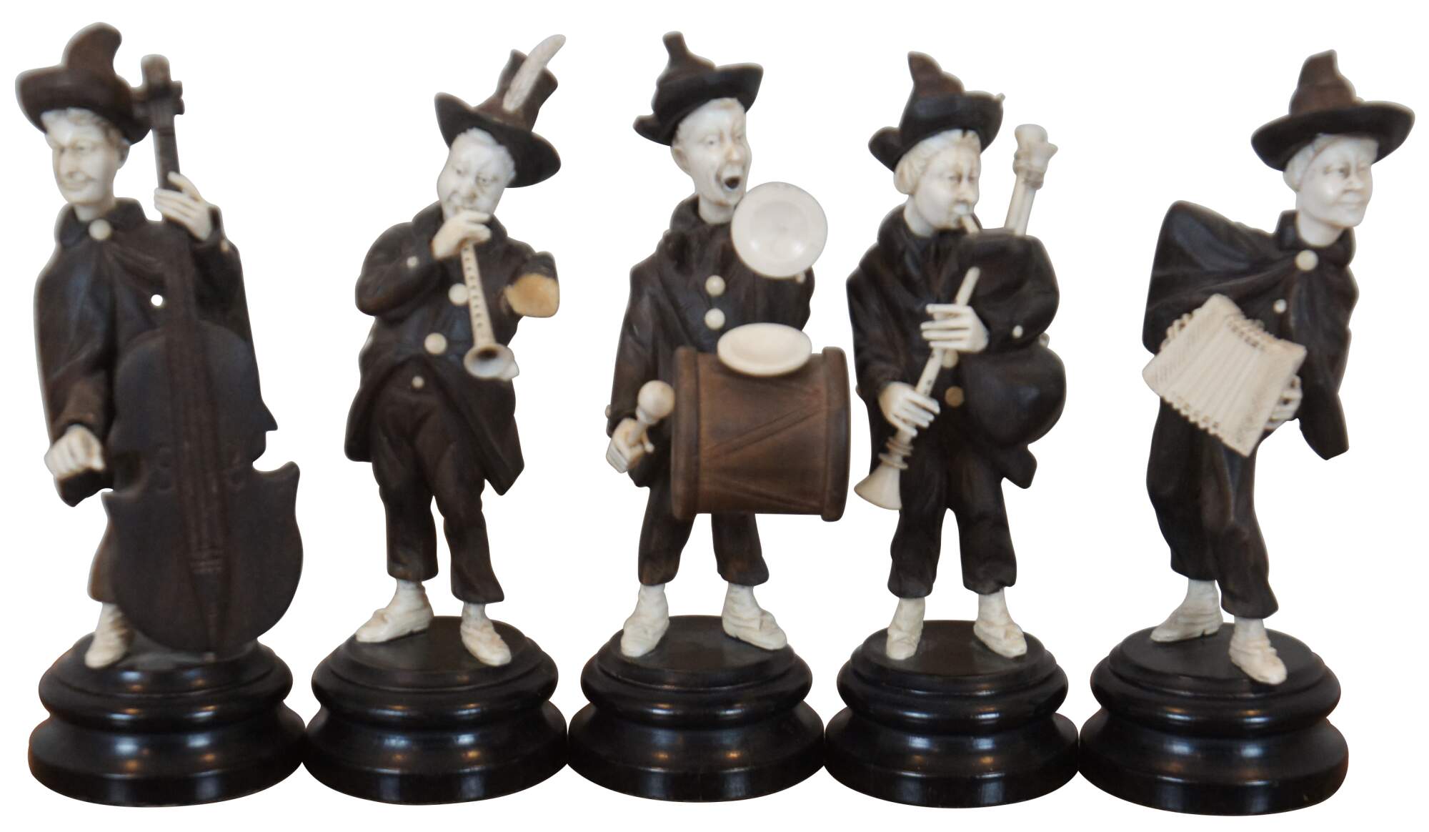 Set of ten German hand carved wood figurines portraying musicians playing a variety of instruments; accordion, flute, bag pipes, mandolin, drum / cymbals, conductor, horn, violin, cello.