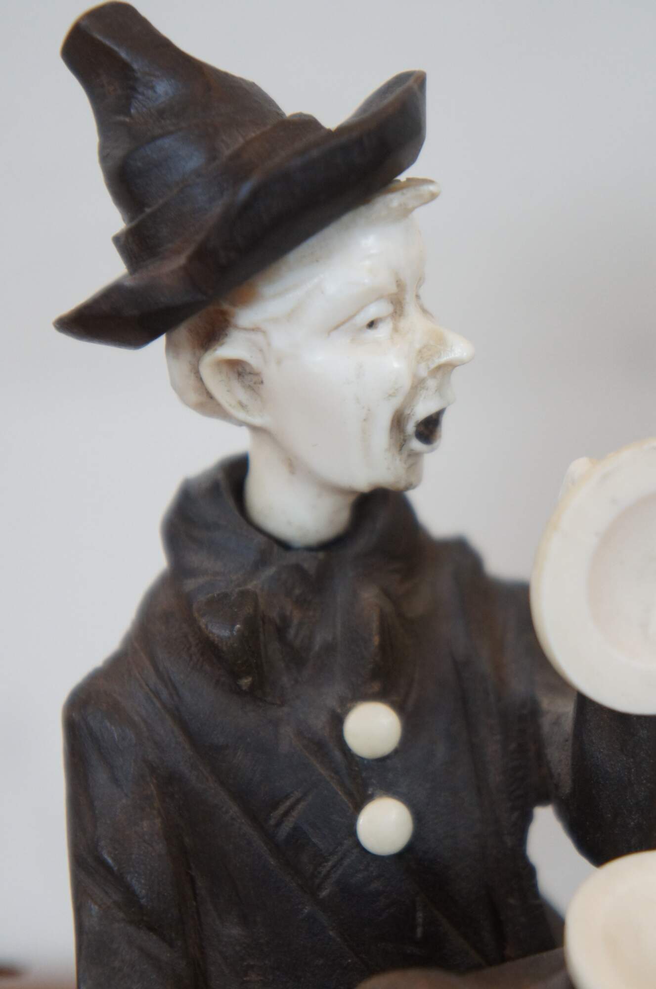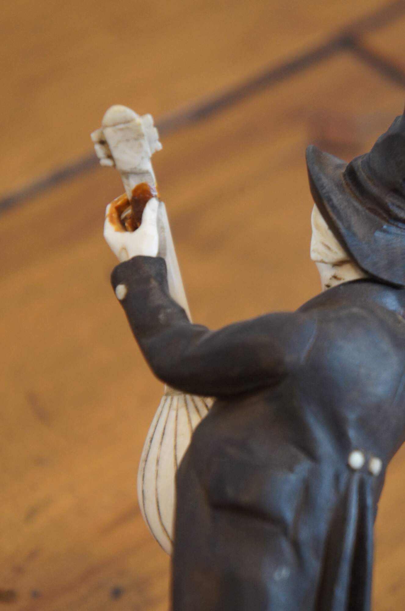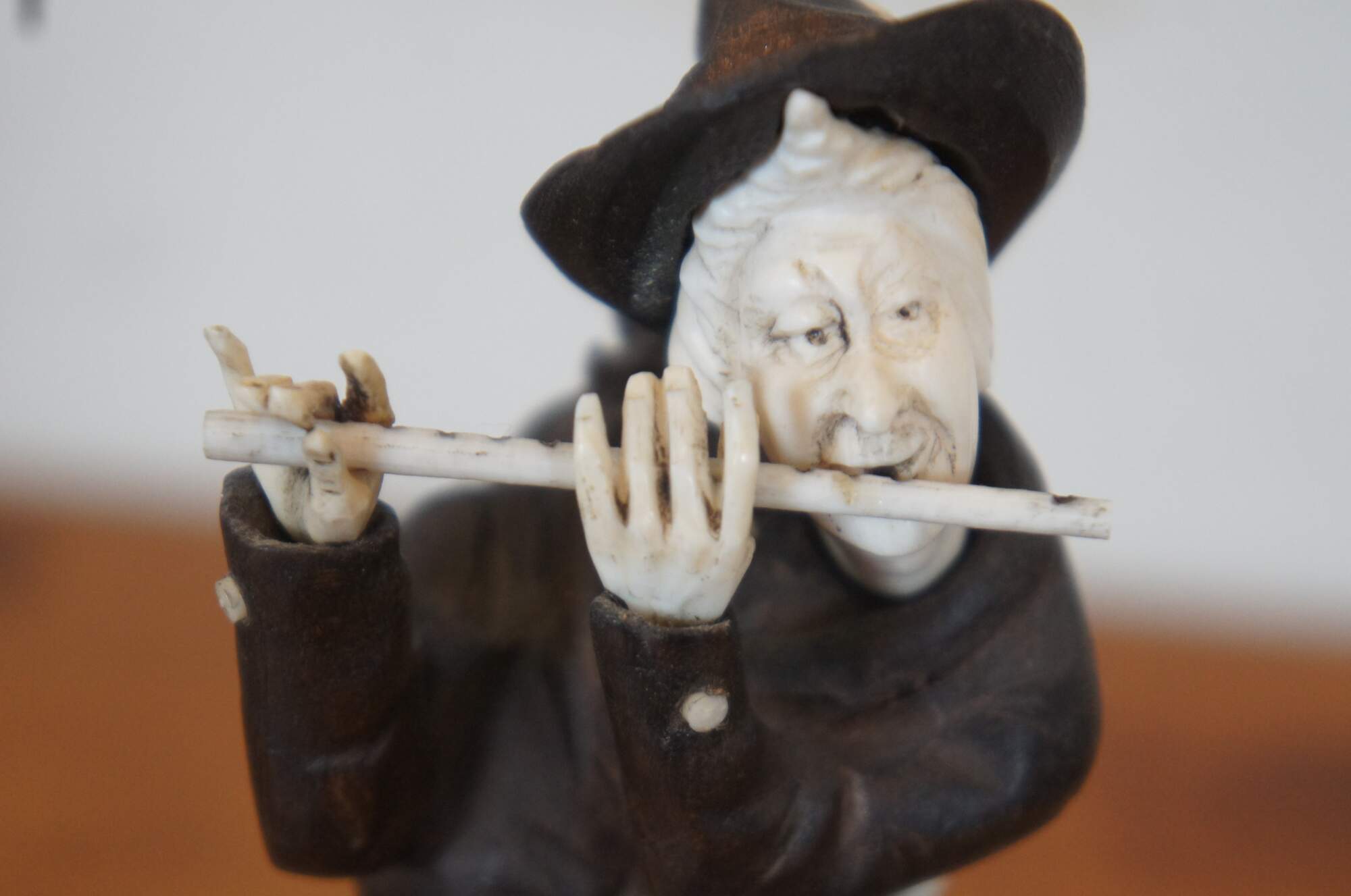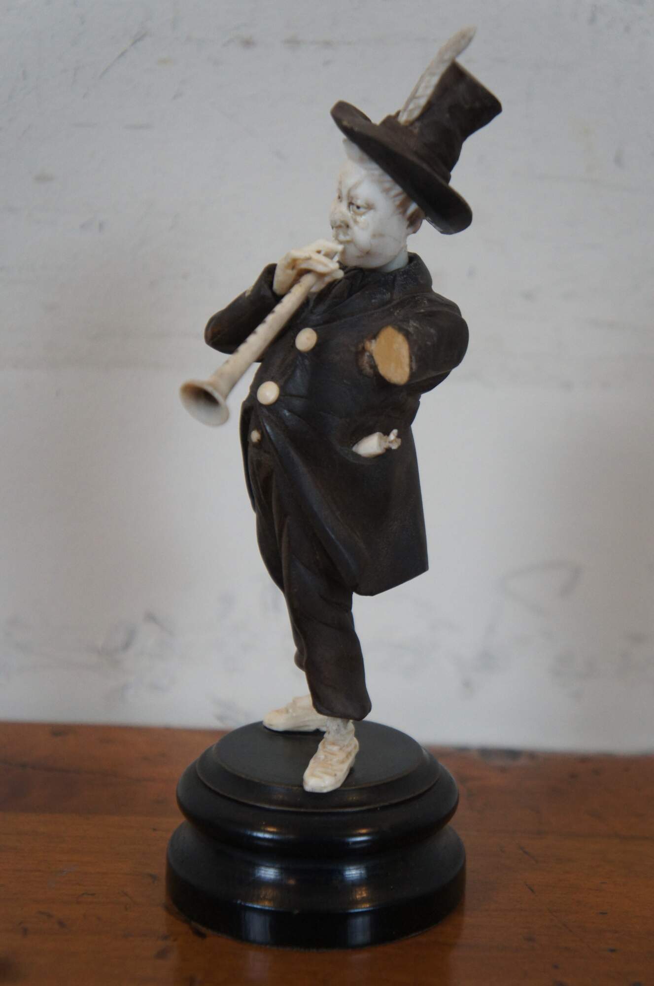 Set of ten German hand carved wood figurines portraying musicians playing a variety of instruments; accordion, flute, bag pipes, mandolin, drum / cymbals, conductor, horn, violin, cello.