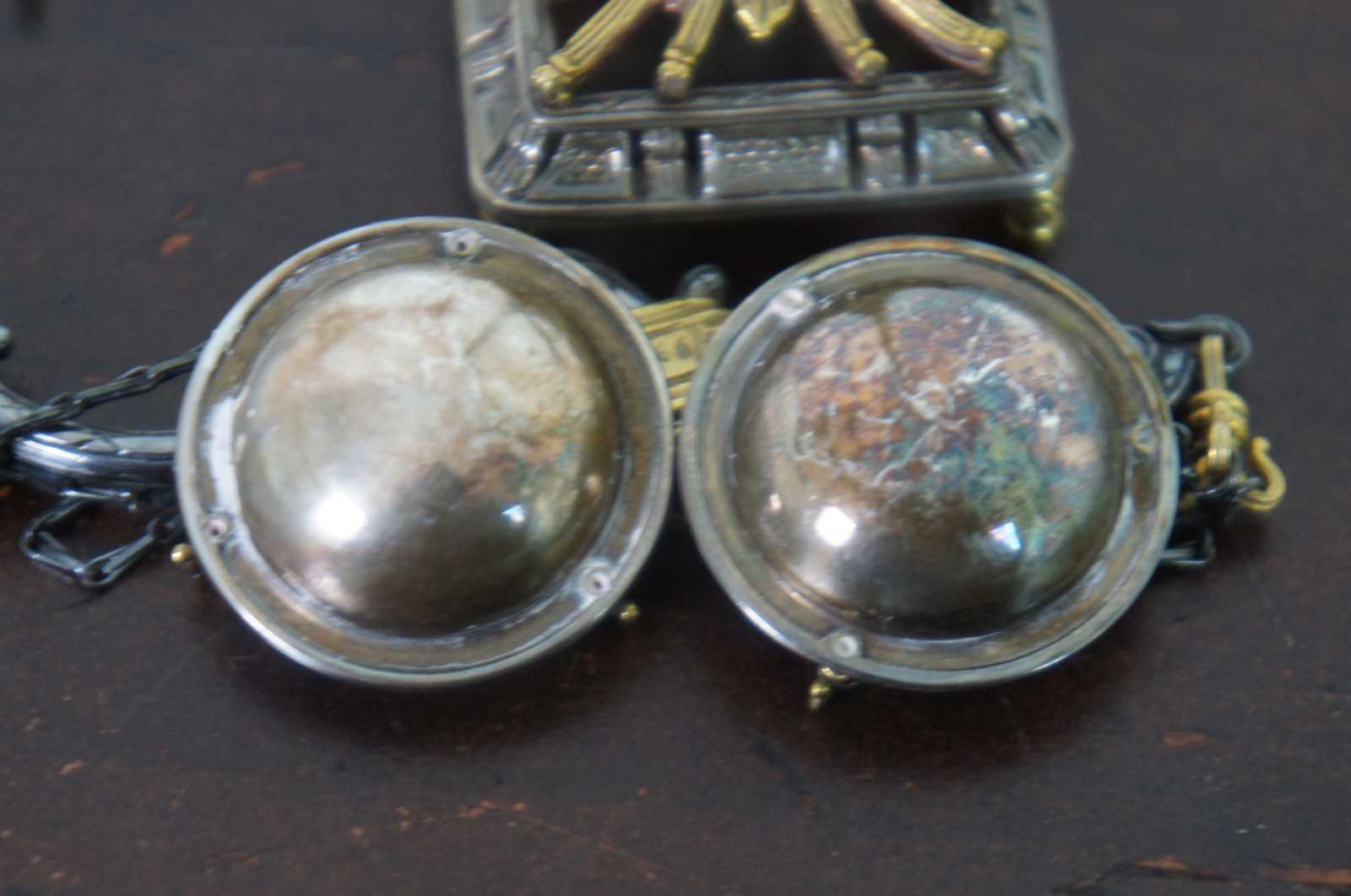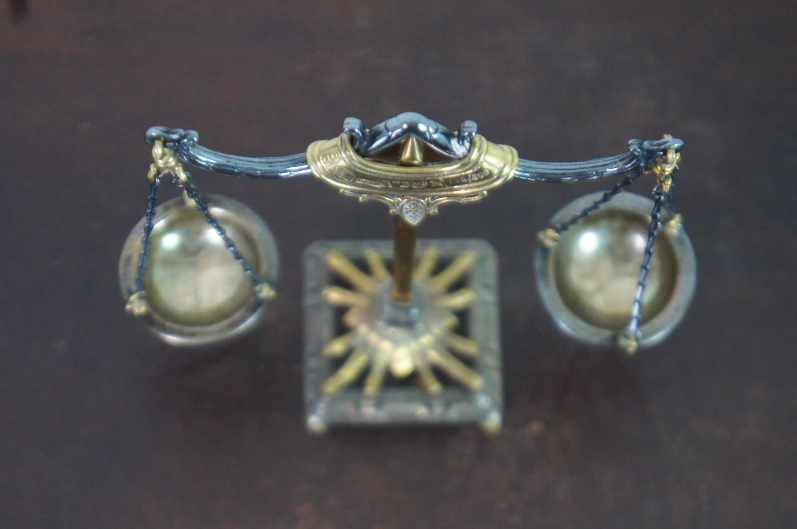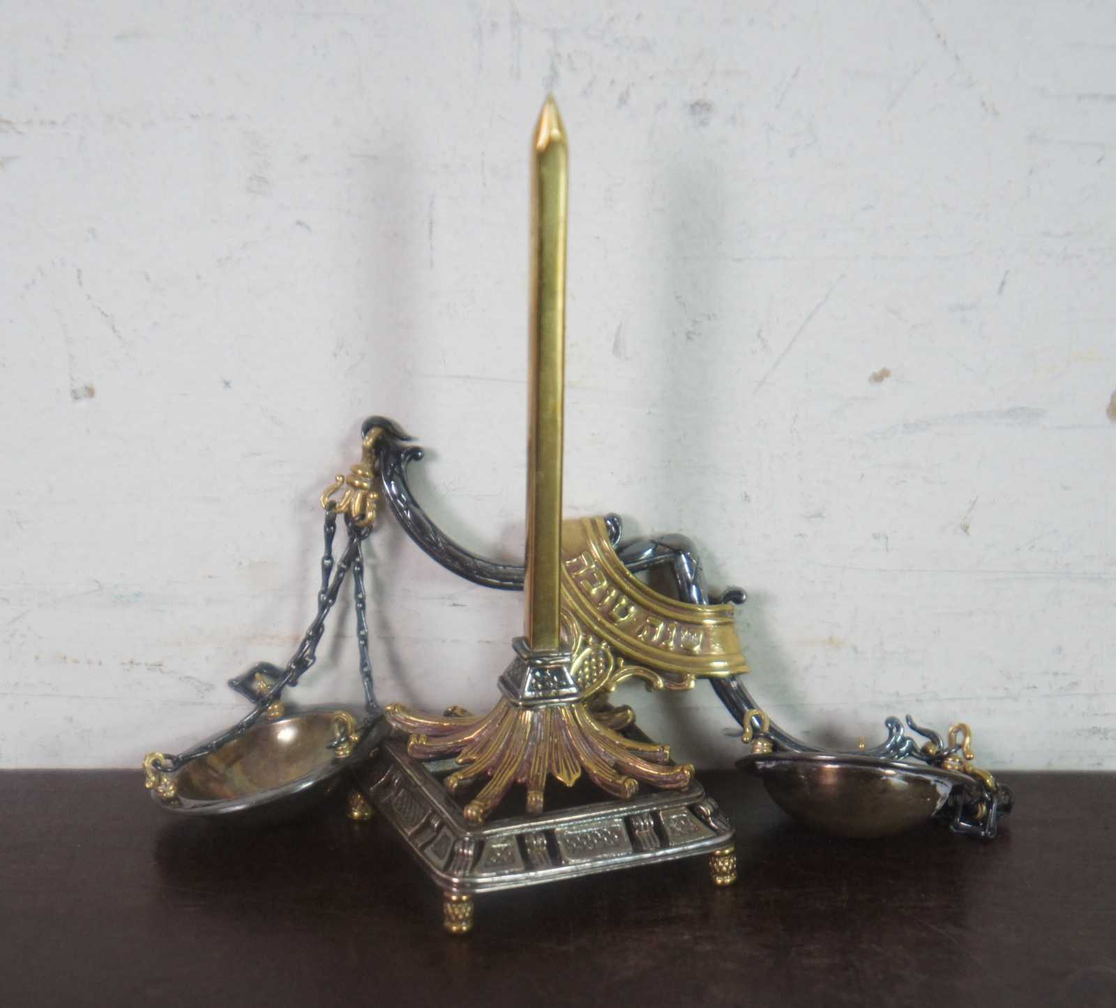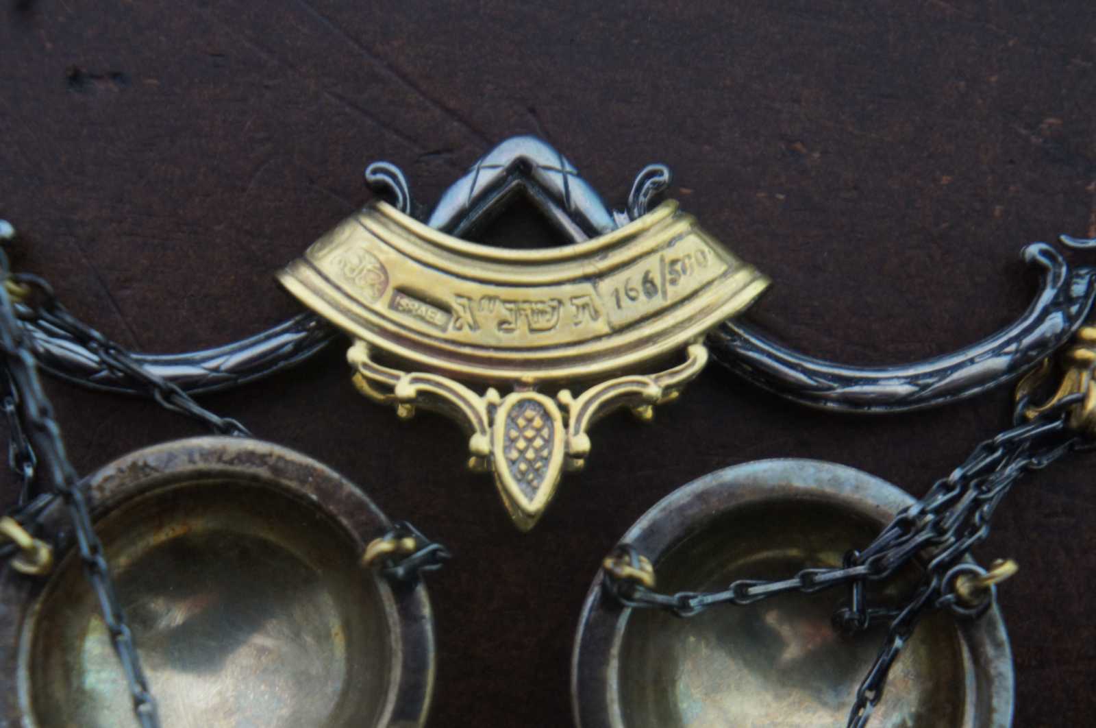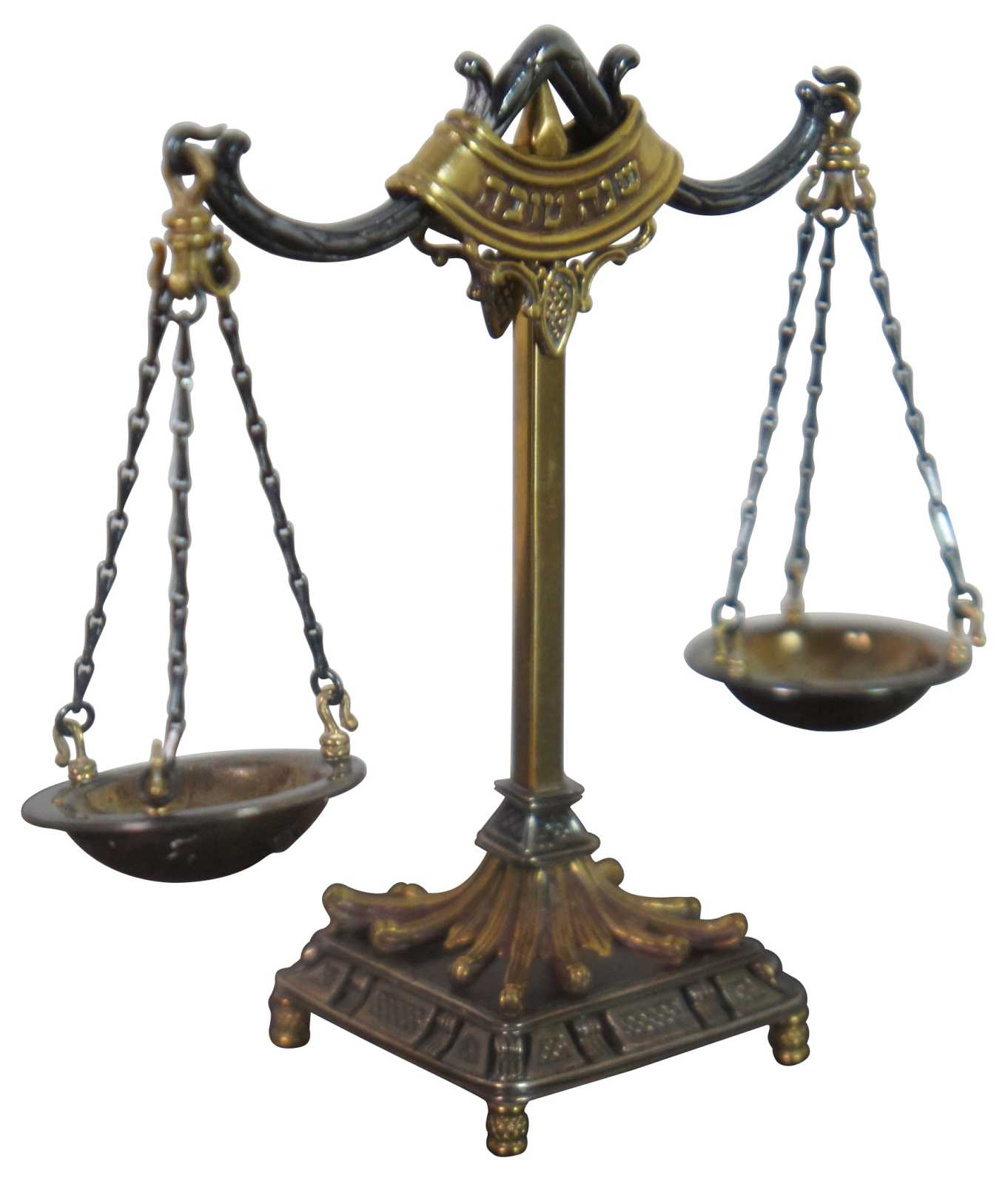 Vintage sterling silver and brass Scales of Judgment / justice art sculpture. Numbered 166/500. “Rosh Hashana, (Hebrew: “Beginning/Head of the Year”) , Hashana also spelled Hashanah or Ha-shanah, also called Day of Judgment or Day of Remembrance, a major Jewish observance now accepted as inaugurating the religious New Year on Tishri 1 (September or October). Because the New Year ushers in a 10-day period of self-examination and penitence, Rosh Hashana is also called the annual Day of Judgment; during this period each Jew reviews his relationship with God, the Supreme Judge. A distinctive feature of the liturgy is the blowing of the ram’s horn (shofar) as prescribed in Numbers 29:1; the notes of the shofar call the Jewish people to a spiritual awakening associated with the revelation to Moses on Mount Sinai. During the Additional Service in the synagogue, the shofar is sounded after the recital of each of three groups of prayers. Rosh Hashana is also known as the Day of Remembrance, for on this day Jews commemorate the creation of the world, and the Jewish nation recalls its responsibilities as God’s chosen people. On the first night of Rosh Hashana a New Year’s custom dictates that delicacies be prepared as omens of good luck. On the following night bread and fruit, dipped in honey, are customarily eaten, and a special blessing is recited. Rosh Hashana is the only festival observed for two days in Israel.”
