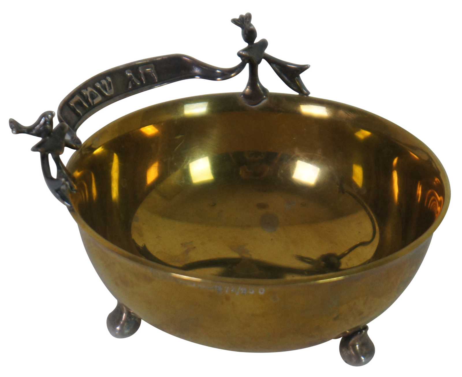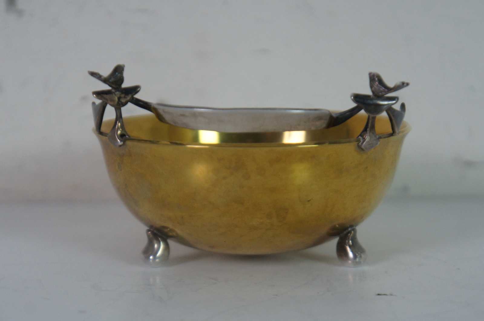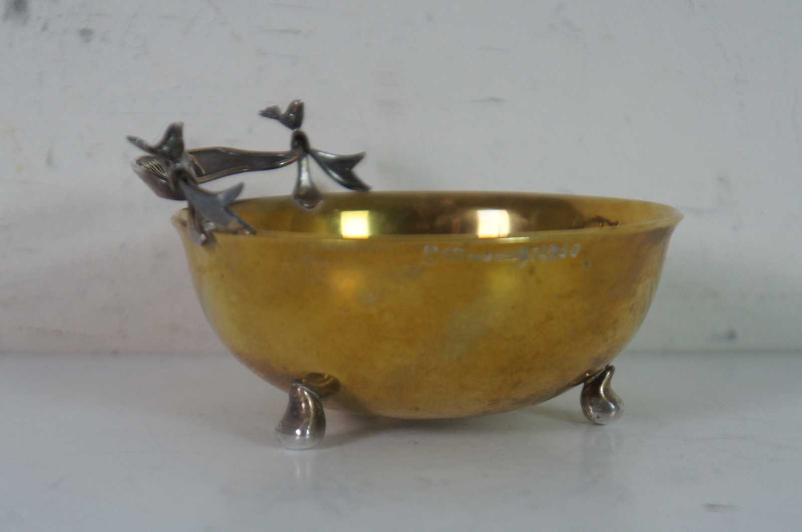 Vintage gilded sterling silver honey dish / bowl / compote by Dudik Swed Masters, with three bun feet and adorned with a pair of birds holding a ribbon. Numbered 172/250.