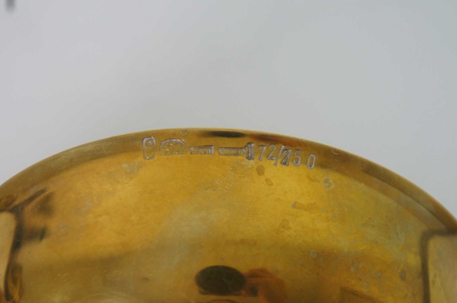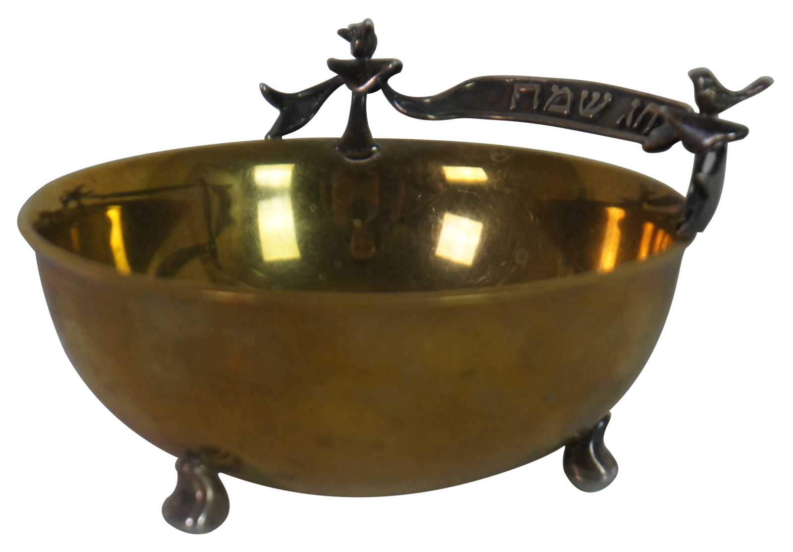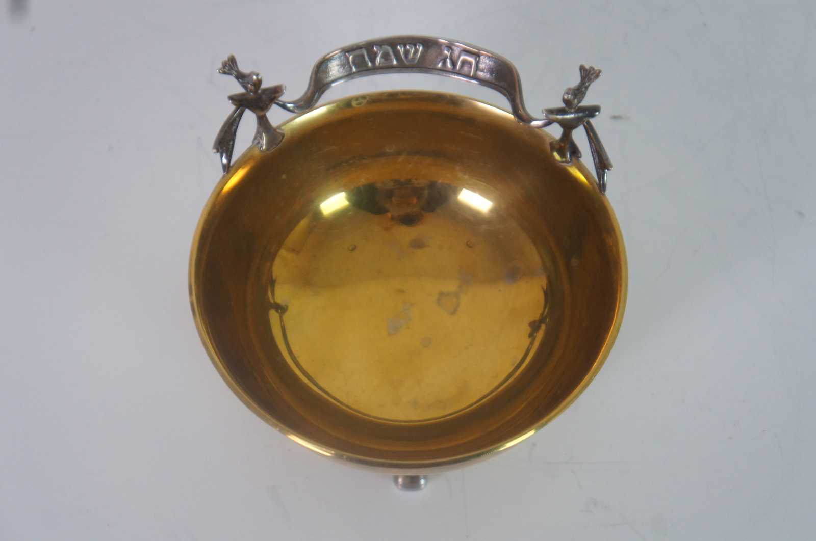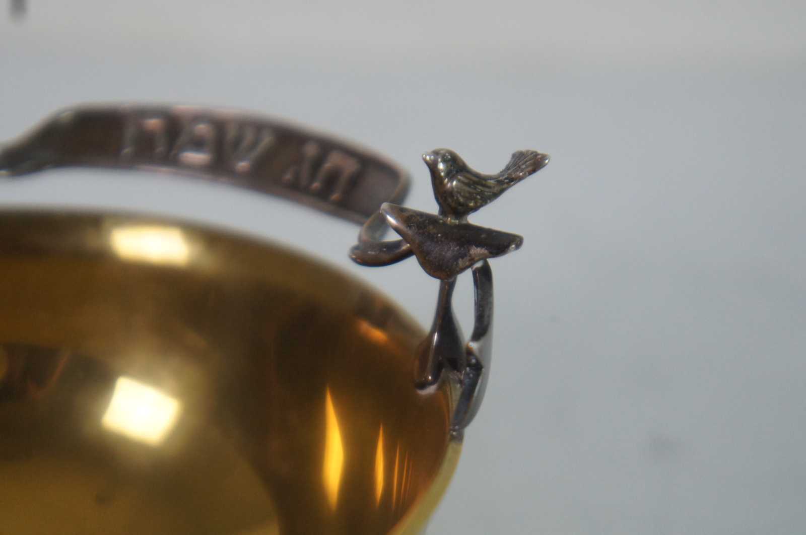 Vintage gilded sterling silver honey dish / bowl / compote by Dudik Swed Masters, with three bun feet and adorned with a pair of birds holding a ribbon. Numbered 172/250.