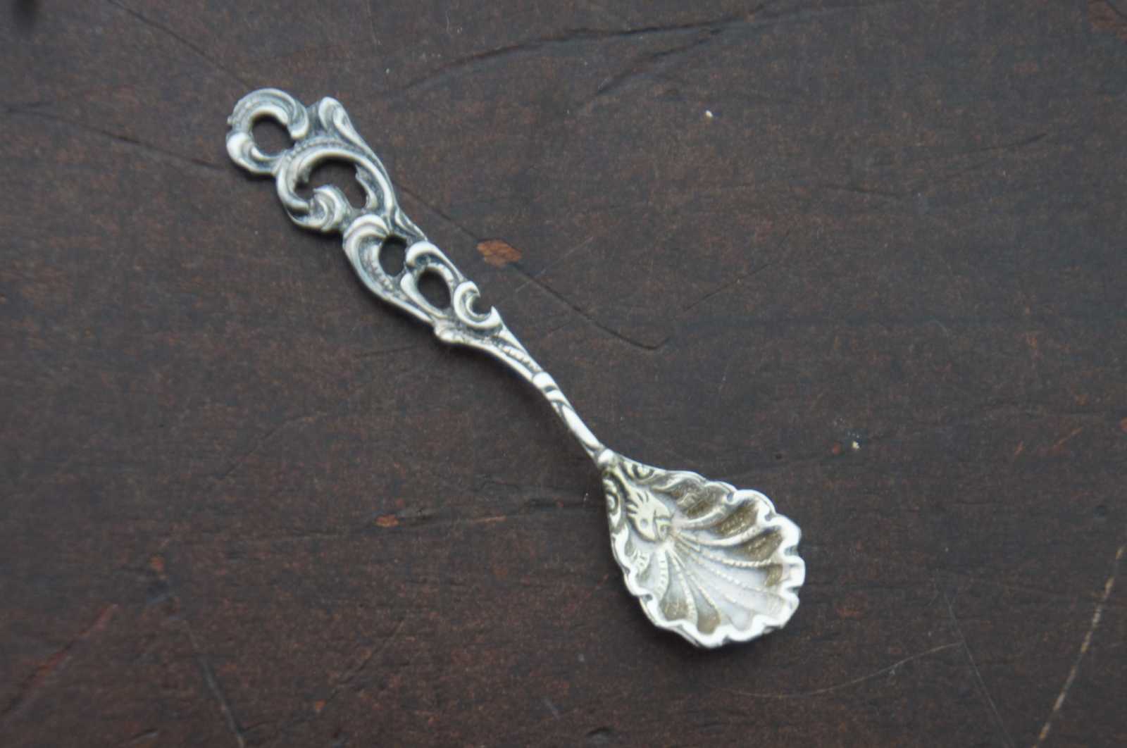 Vintage sterling silver 925 salt cellar / dish / compote in the shape of a scallop shell decorated with roses and a round handle, plus a shell shaped salt spoon.