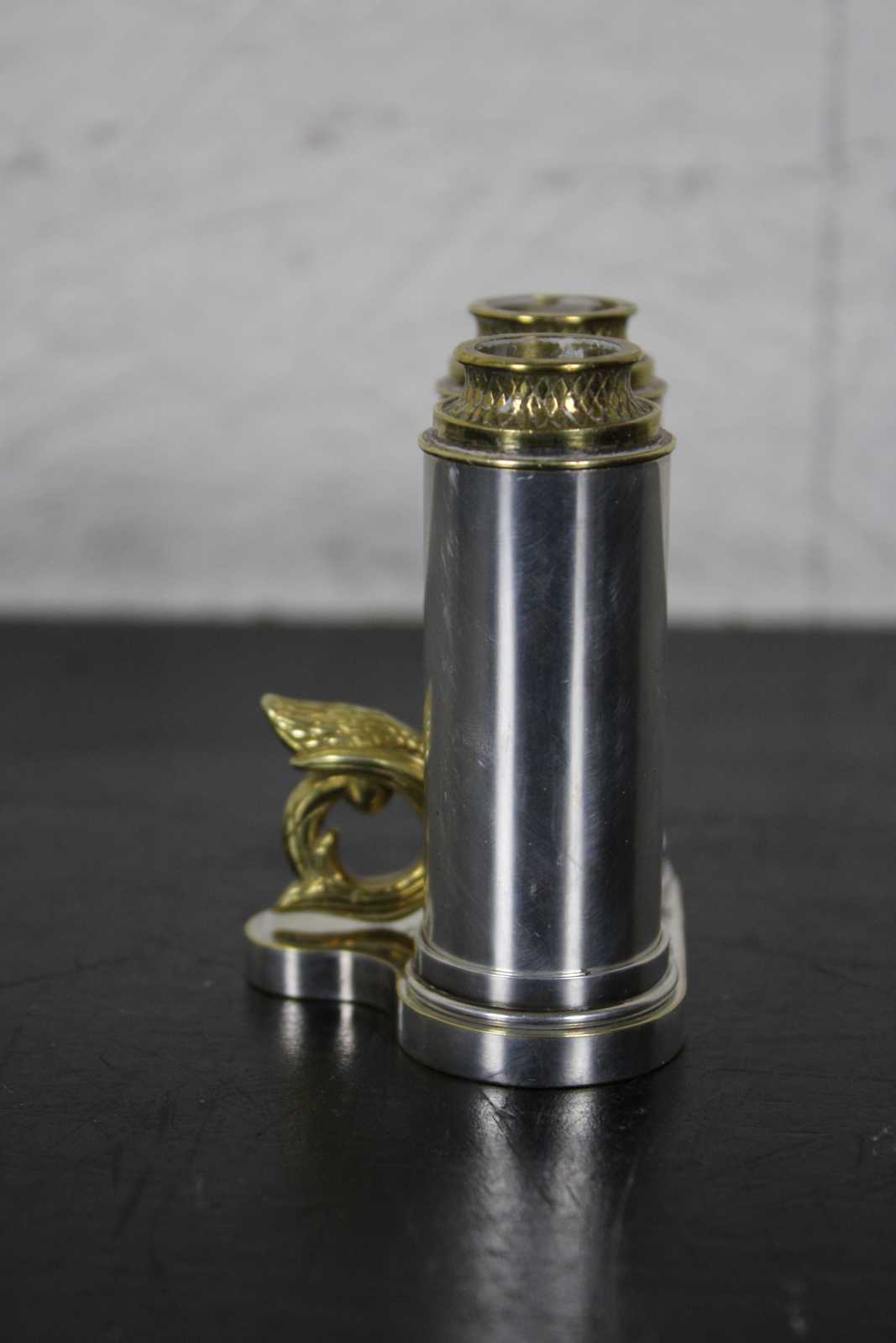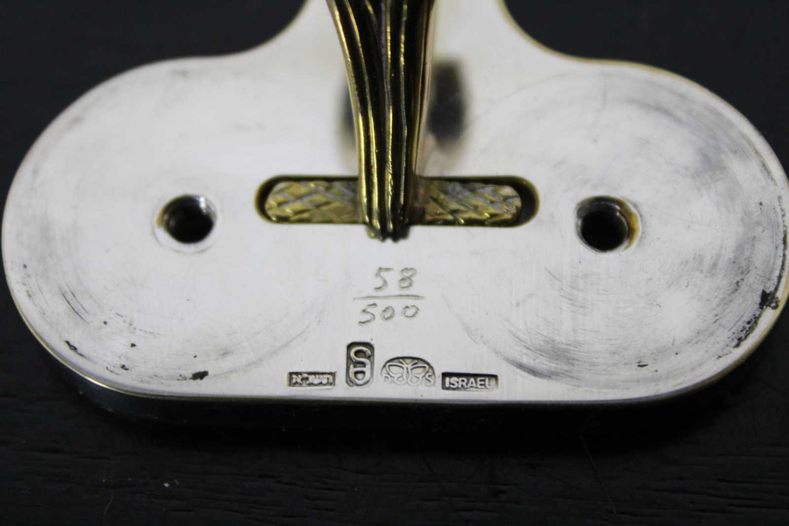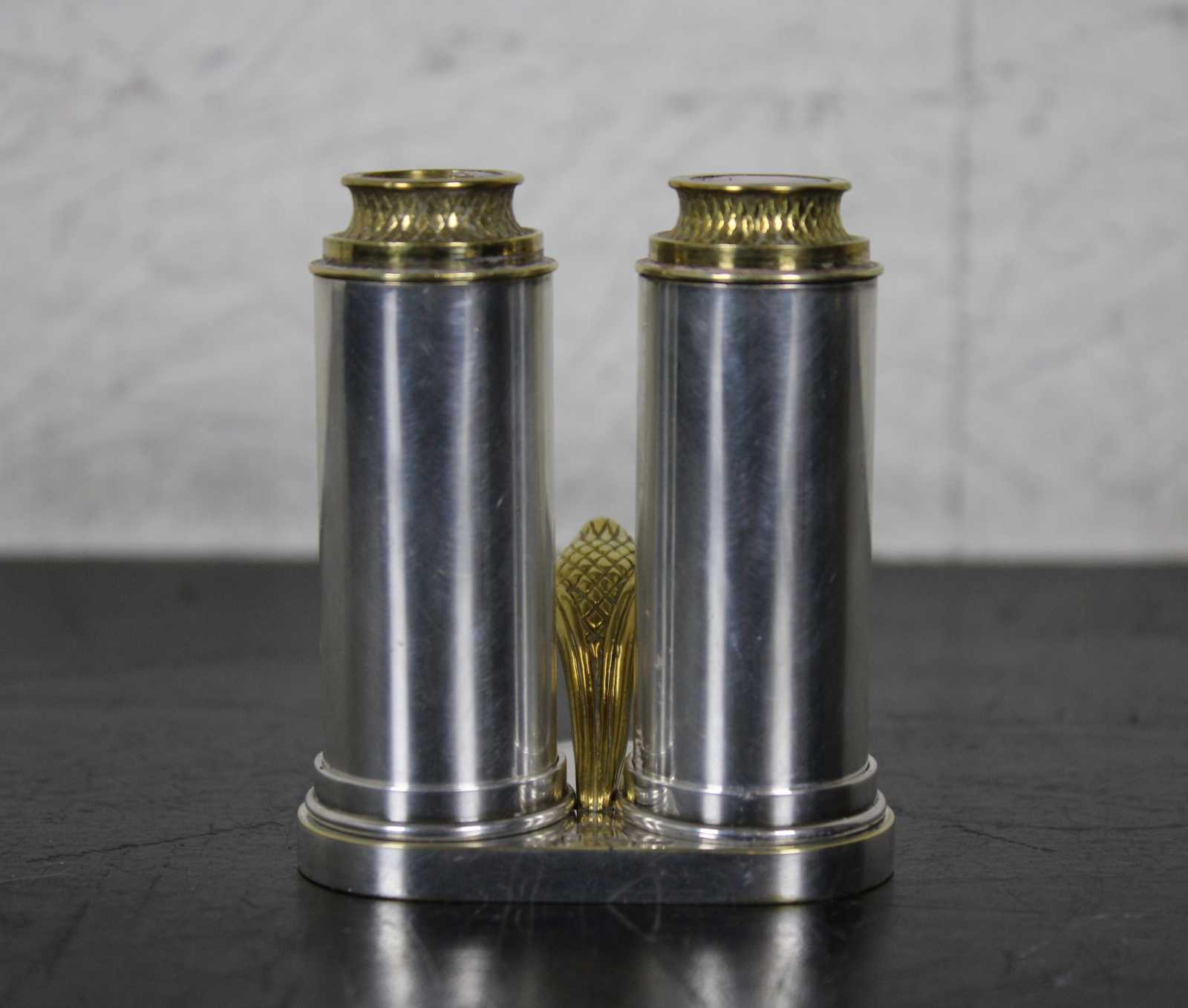 Rare vintage Sterling Silver and brass traveling sabbath lamy by Dudik Swed / Swed Masters. Numbered 58/500. Circa 1990s. The perfect minimalist or travel set. When closed the set perfectly conceals and protects the shabbat candles. Brass toppers flip to reveal candleholders. Breaks down for ease of cleaning.