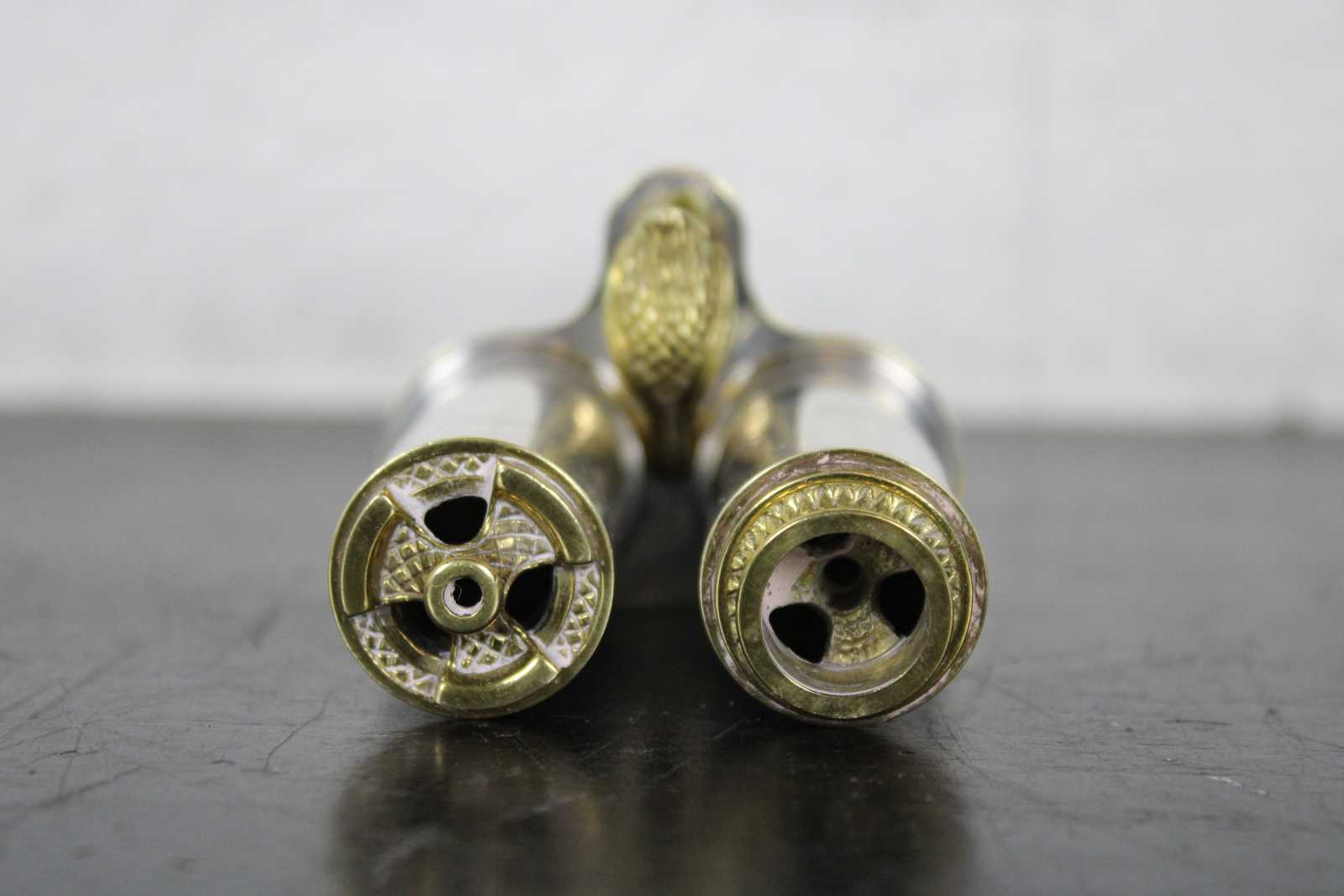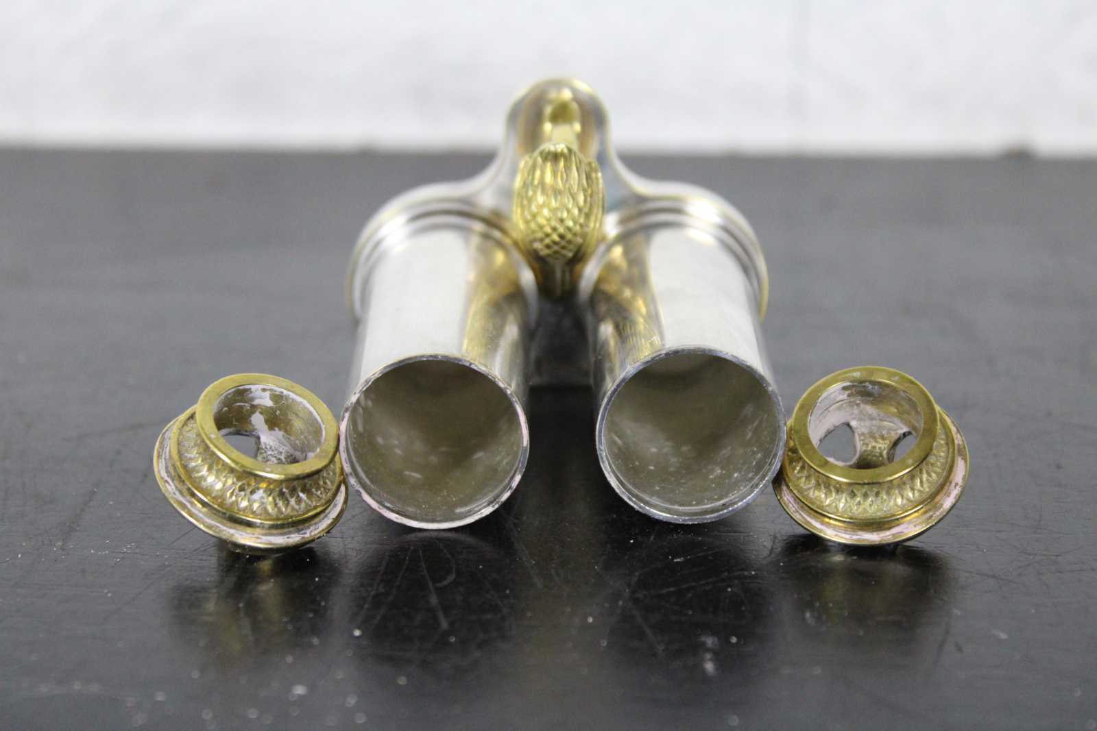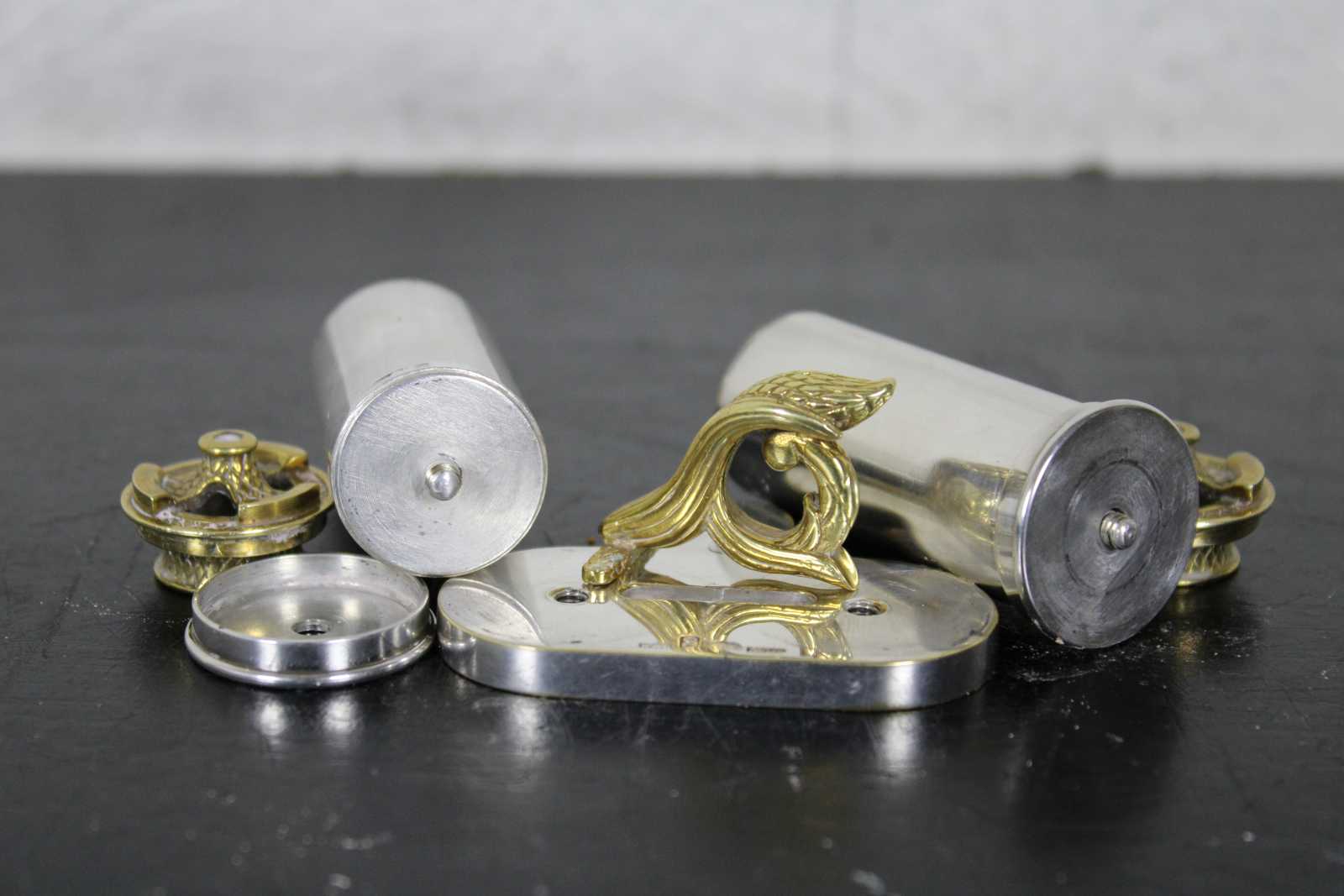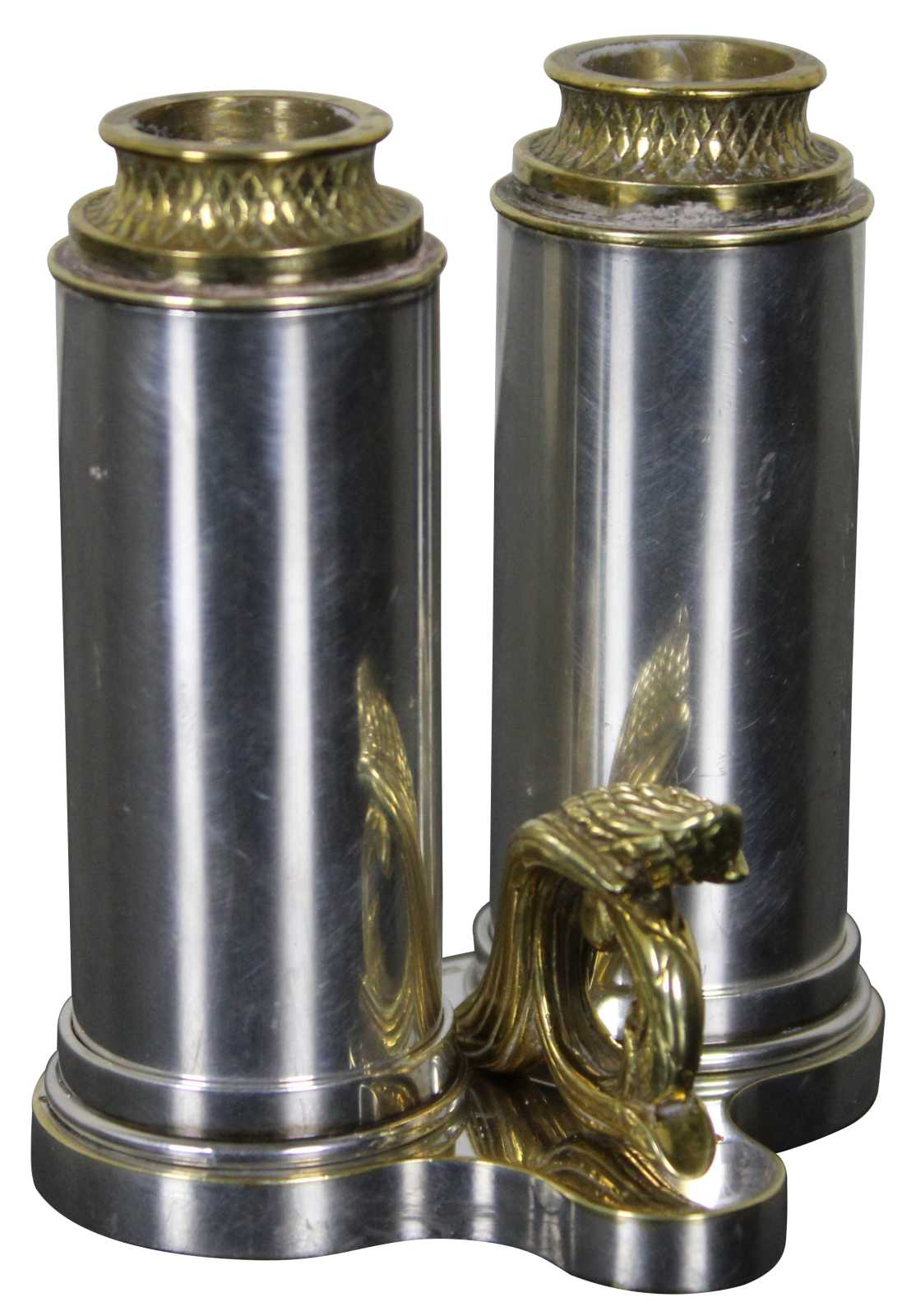 Rare vintage Sterling Silver and brass traveling sabbath lamy by Dudik Swed / Swed Masters. Numbered 58/500. Circa 1990s. The perfect minimalist or travel set. When closed the set perfectly conceals and protects the shabbat candles. Brass toppers flip to reveal candleholders. Breaks down for ease of cleaning.