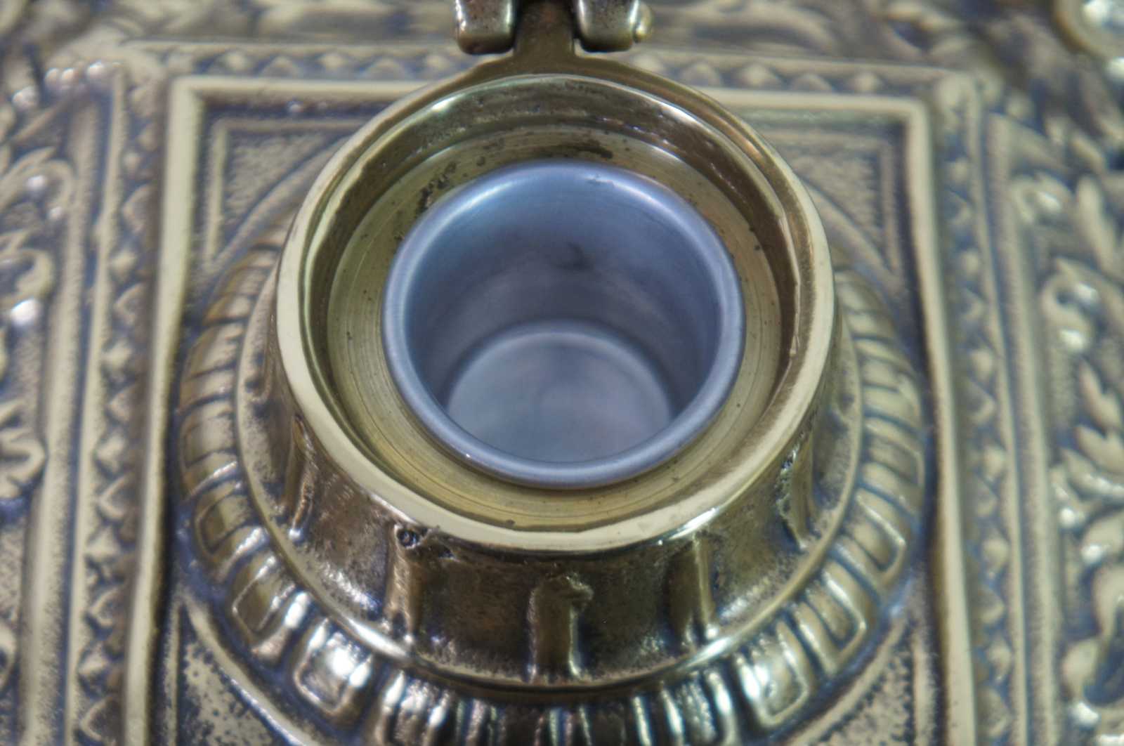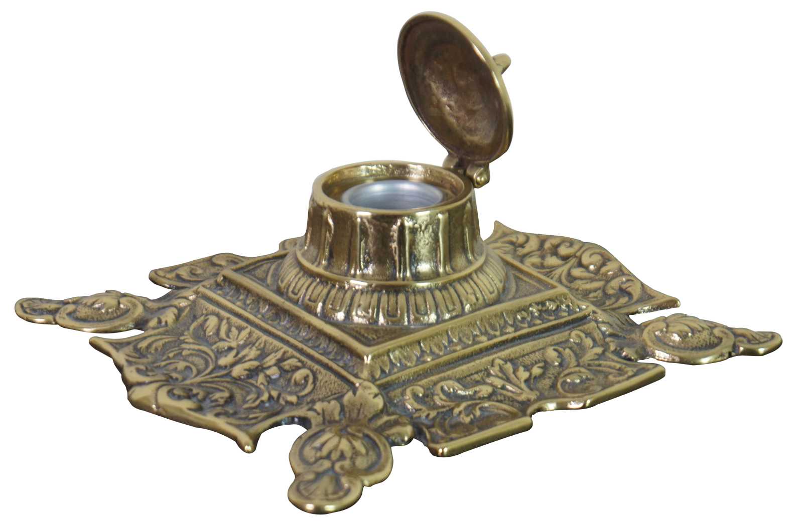 Antique ornate art nouveau style embossed scalloped floral / acanthus brass inkwell with insert.