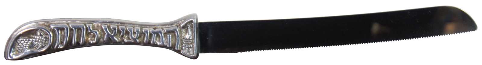Vintage challah knife made in Sheffield, England with stainless steel blade and ornate 925 sterling silver handle. Inscribed on the handle, Hamotzi Lechem, Shabbat Hakodesh, which translates to who brings forth bread from this earth, Holy Shabbat.