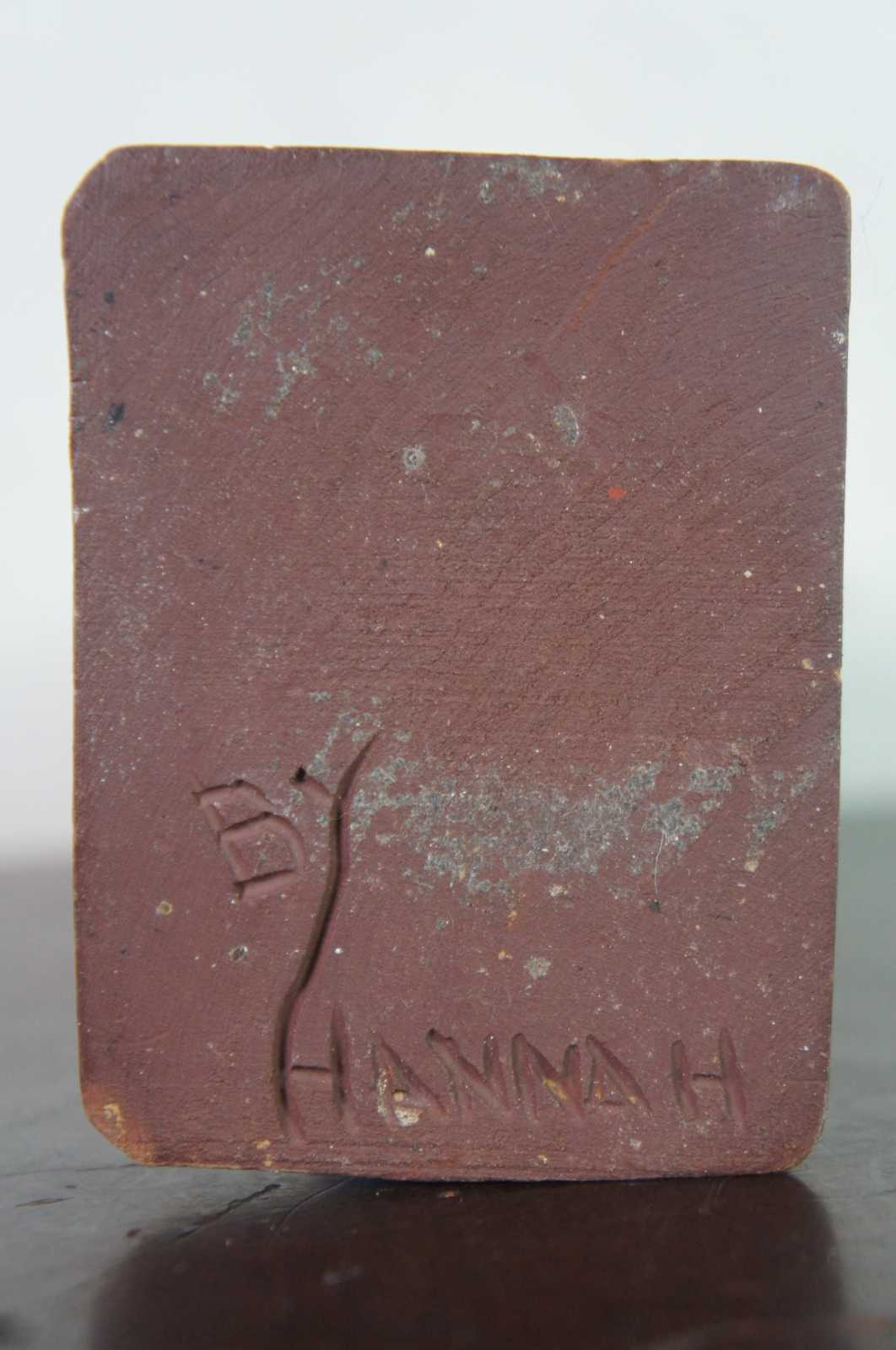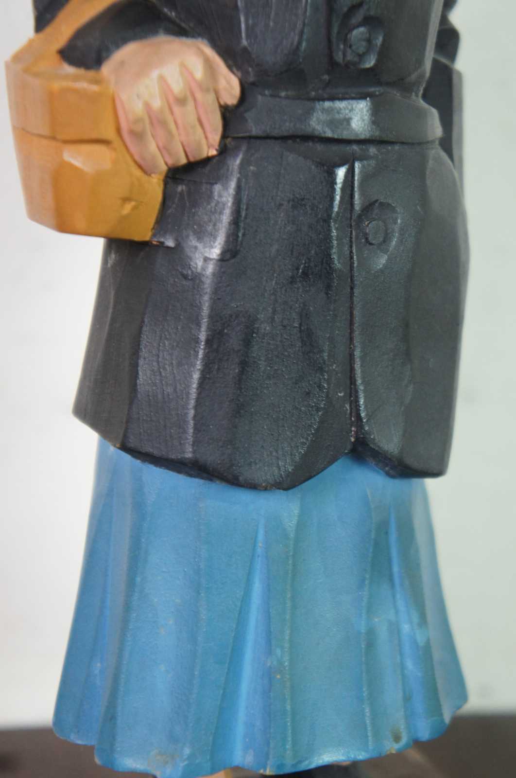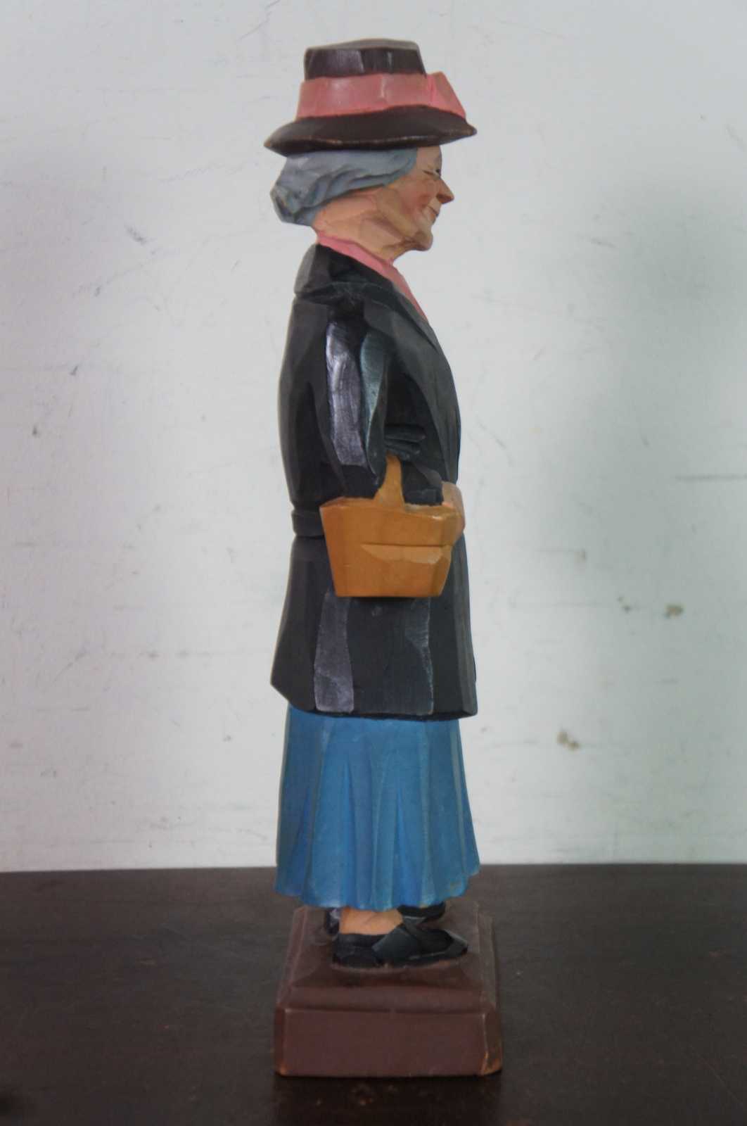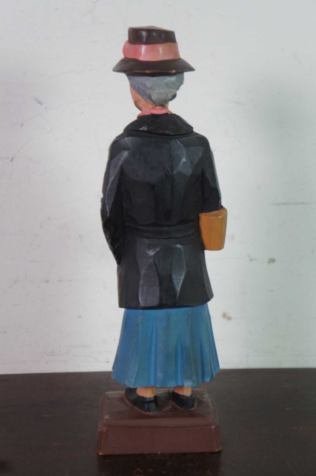 Mid Century carved wood folk art figure by Gerald Pat Hannah, titled “Rose,” showing an old woman in a dark hat and coat with a purse on her arm. “One of the original three Hannah brothers (Charles, Pat and Tom) who became wood carvers in the 1930’s in Quebec. “Pat” Gerald Hannah and his brother Charles learned wood carving from Carl-Johan Trygg (the founder of the Trygg family of artists in Canada.) who had a carving school near Saint-Sauveur, Quebec. He was called Pat because he was born on Saint-Patrick’s day; though living in the predominantly Irish Burrough of Verdun may have had some influence. The Trygg influence is apparent in many works done by him and the other family members who learned their techniques from Pat and Charlie Hannah. After a brief stay in Florida, Pat Hannah re-located in North Poultney, Vermont in 1948. He carved character figures in a full range; from Mounted Police to sailors, famous people and just ‘folks’ in various sizes typically about 6 inches high. All in bright paint and in Pine wood or Basswood. Unlike the Trygg carvers, who applied their bases, Most of the the Hannah sculptors carved the base into their works. In the carvings by ‘Pat’ Hannah, illustrated below, the bases are applied, as the Tryggs were. He signed P. Hannah or Pat Hannah, usually on the bottom of the base with a pencil or later, with a chisel. In the late 50’s he started signing his carvings “By Hannah.” His son, Duncan Hannah, of Vermont, was also a carver of figural characters (see his post). He had another son, Pete Hannah, who may have carved. Carvings stamped “Hand Carved by P. R. Hannah, Quebec” are seen occasionally.”