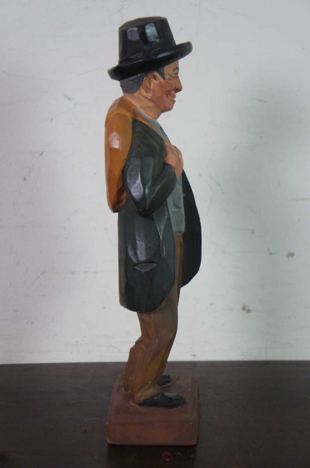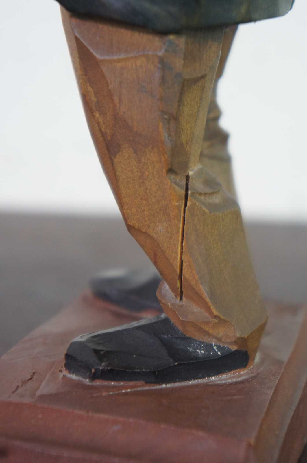 Mid Century carved wood folk art figure by Geral Pat Hannah titled “Yankee Pedlar,” featuring an middle aged man with a pack on his back. “One of the original three Hannah brothers (Charles, Pat and Tom) who became wood carvers in the 1930’s in Quebec. “Pat” Gerald Hannah and his brother Charles learned wood carving from Carl-Johan Trygg (the founder of the Trygg family of artists in Canada.) who had a carving school near Saint-Sauveur, Quebec. He was called Pat because he was born on Saint-Patrick’s day; though living in the predominantly Irish Burrough of Verdun may have had some influence. The Trygg influence is apparent in many works done by him and the other family members who learned their techniques from Pat and Charlie Hannah. After a brief stay in Florida, Pat Hannah re-located in North Poultney, Vermont in 1948. He carved character figures in a full range; from Mounted Police to sailors, famous people and just ‘folks’ in various sizes typically about 6 inches high. All in bright paint and in Pine wood or Basswood. Unlike the Trygg carvers, who applied their bases, Most of the the Hannah sculptors carved the base into their works. In the carvings by ‘Pat’ Hannah, illustrated below, the bases are applied, as the Tryggs were. He signed P. Hannah or Pat Hannah, usually on the bottom of the base with a pencil or later, with a chisel. In the late 50’s he started signing his carvings “By Hannah.” His son, Duncan Hannah, of Vermont, was also a carver of figural characters (see his post). He had another son, Pete Hannah, who may have carved. Carvings stamped “Hand Carved by P. R. Hannah, Quebec” are seen occasionally.”