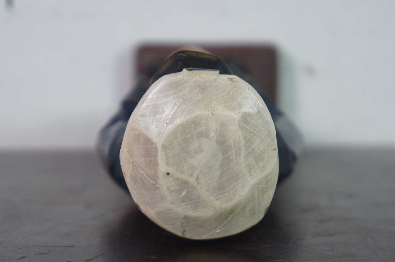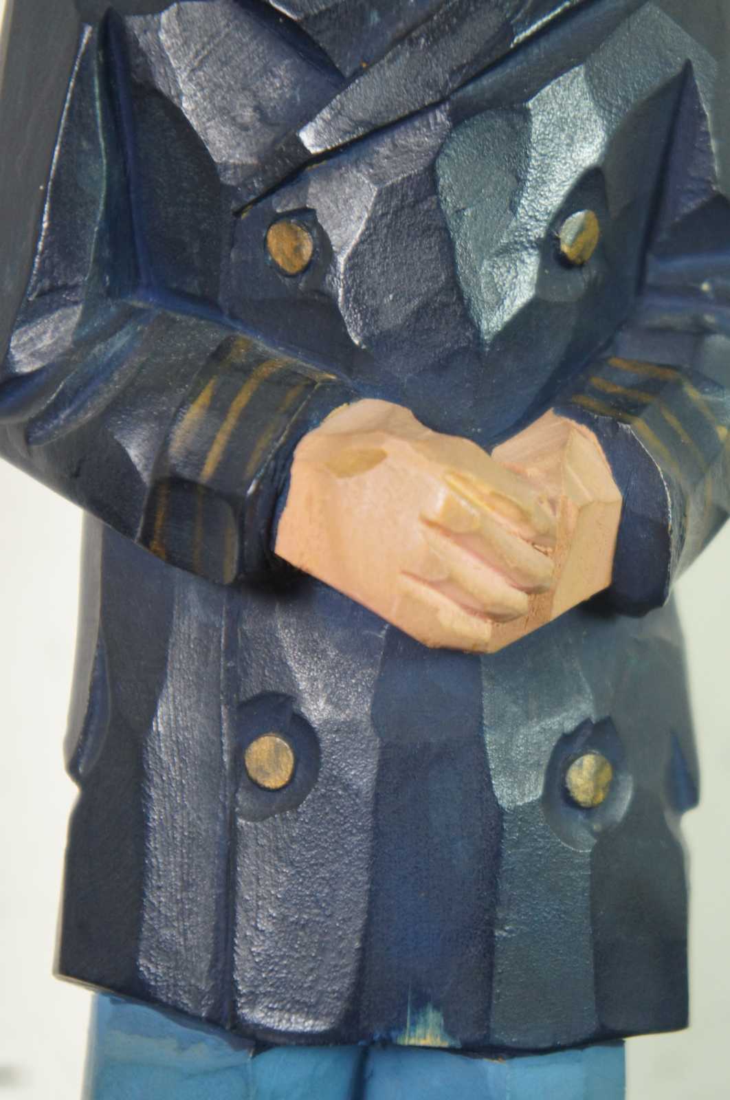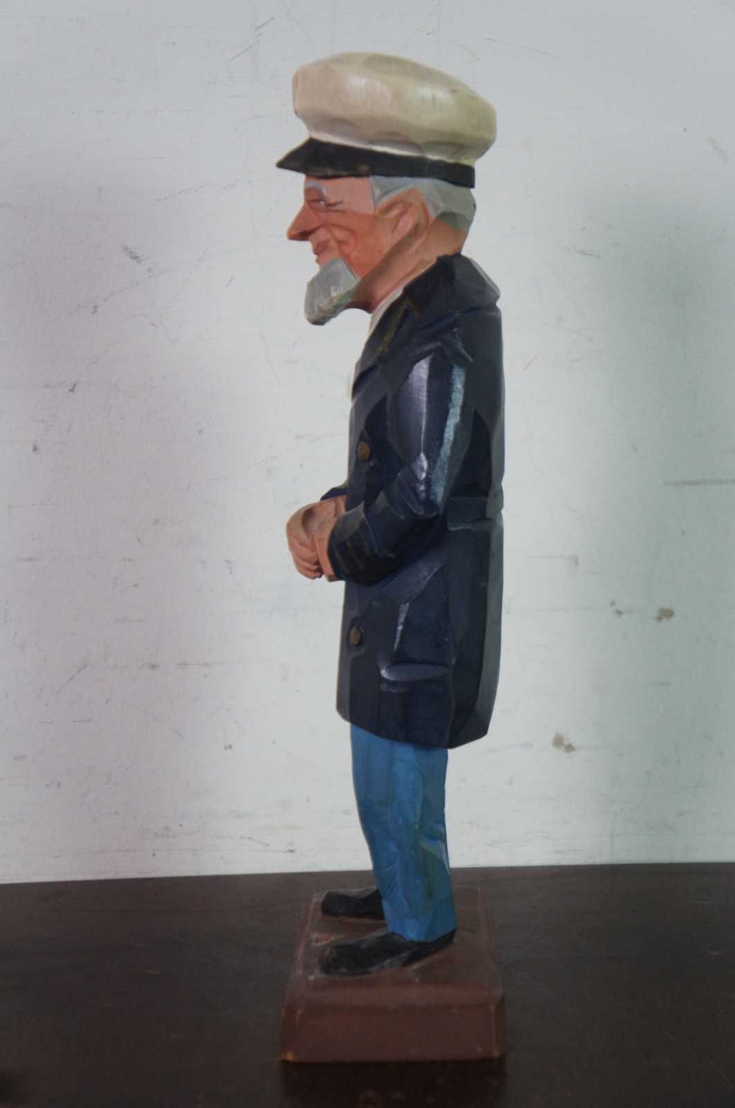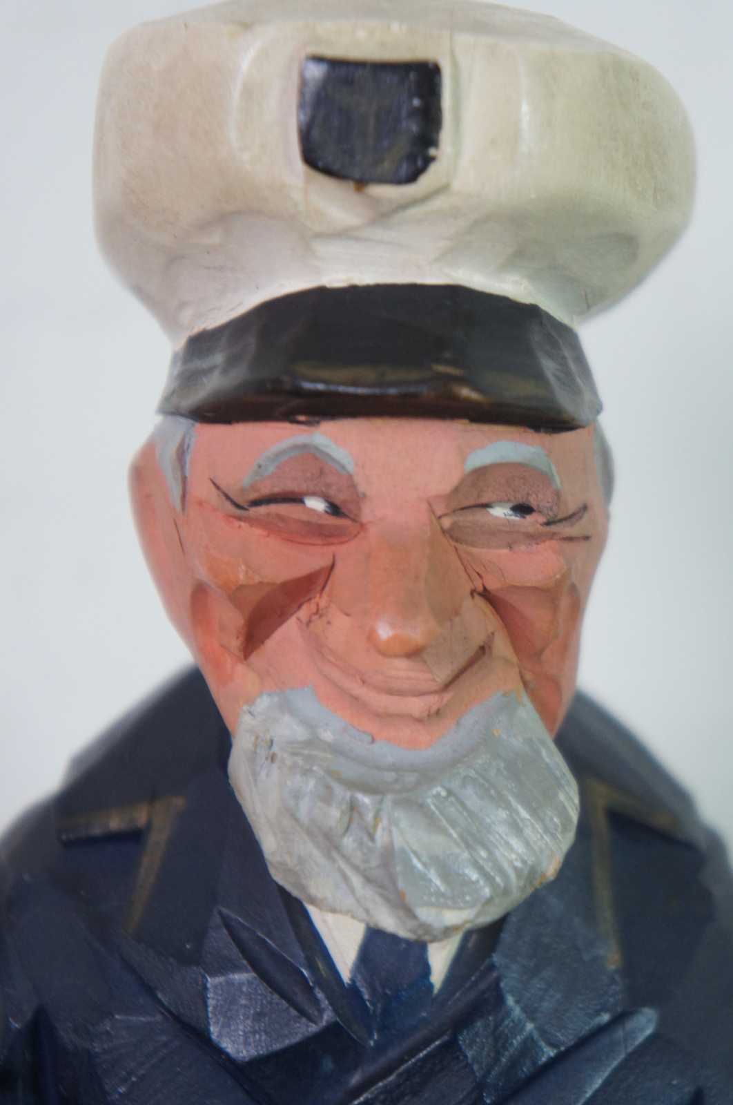 Mid Century carved wood folk art figure by Gerald Pat Hannah titled “Stay at Home,” featuring an old man dressed as a sea captain, once leaning on a walking stick. “One of the original three Hannah brothers (Charles, Pat and Tom) who became wood carvers in the 1930’s in Quebec. “Pat” Gerald Hannah and his brother Charles learned wood carving from Carl-Johan Trygg (the founder of the Trygg family of artists in Canada.) who had a carving school near Saint-Sauveur, Quebec. He was called Pat because he was born on Saint-Patrick’s day; though living in the predominantly Irish Burrough of Verdun may have had some influence. The Trygg influence is apparent in many works done by him and the other family members who learned their techniques from Pat and Charlie Hannah. After a brief stay in Florida, Pat Hannah re-located in North Poultney, Vermont in 1948. He carved character figures in a full range; from Mounted Police to sailors, famous people and just ‘folks’ in various sizes typically about 6 inches high. All in bright paint and in Pine wood or Basswood. Unlike the Trygg carvers, who applied their bases, Most of the the Hannah sculptors carved the base into their works. In the carvings by ‘Pat’ Hannah, illustrated below, the bases are applied, as the Tryggs were. He signed P. Hannah or Pat Hannah, usually on the bottom of the base with a pencil or later, with a chisel. In the late 50’s he started signing his carvings “By Hannah.” His son, Duncan Hannah, of Vermont, was also a carver of figural characters (see his post). He had another son, Pete Hannah, who may have carved. Carvings stamped “Hand Carved by P. R. Hannah, Quebec” are seen occasionally.”