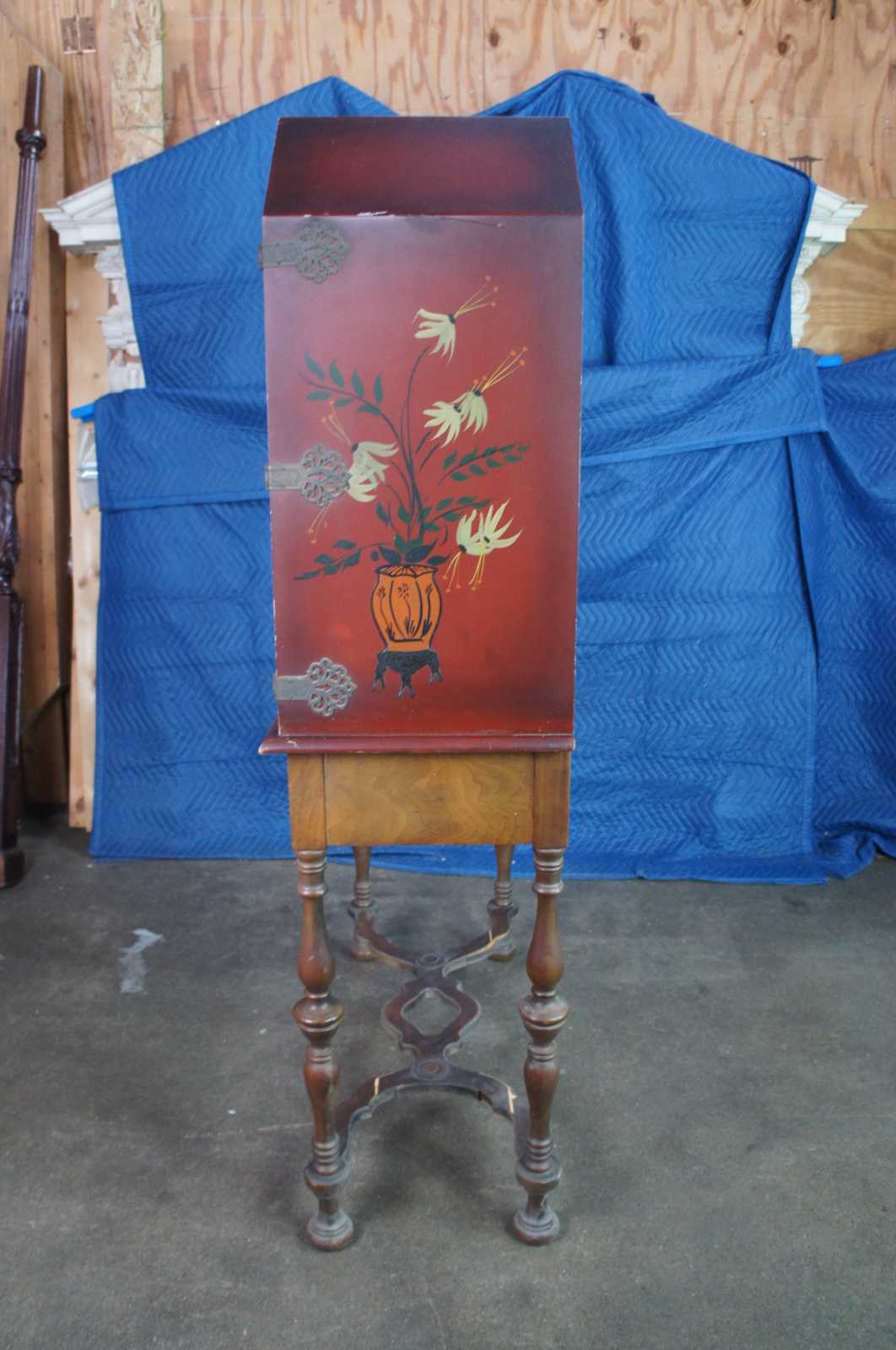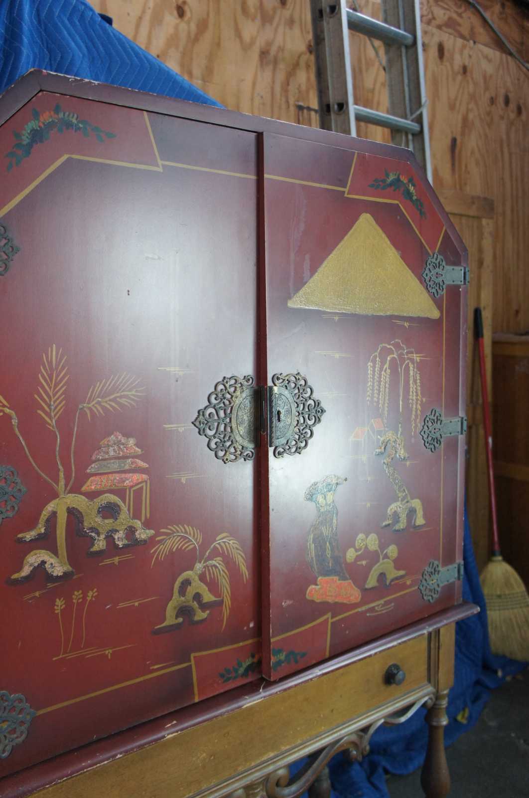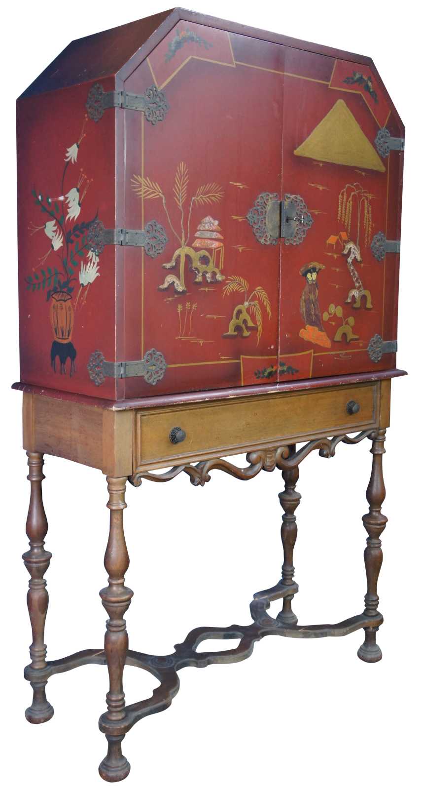Mid century red lacquered William & Mary style chinoiserie cabinet, dry bar, or stand featuring Asian themed japanned landscape scene with jardinaires, flowers, pagodas and Geishas. Includes one drawer with locking cabinet that opens to green painted interior with two shelves for linens, books or TV / stereo components. The cabinet is supported by cup and urn shaped legs connected by an ornate H form stretcher. A styling indicative of William & Mary Revival.