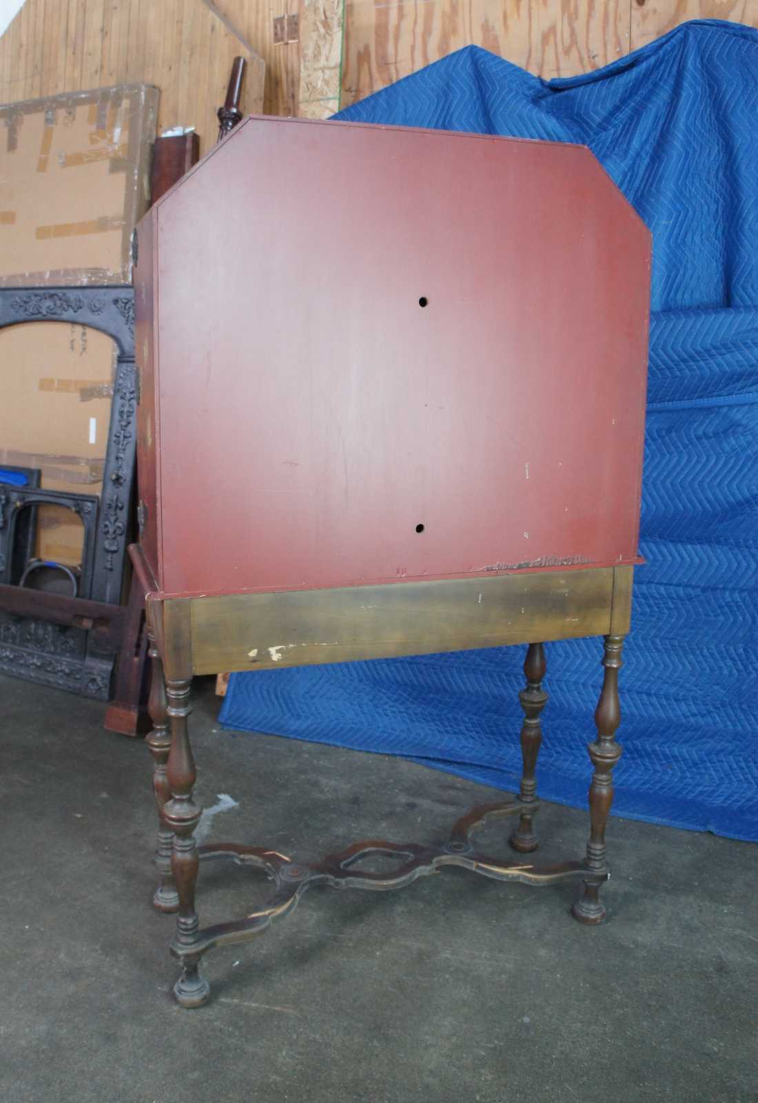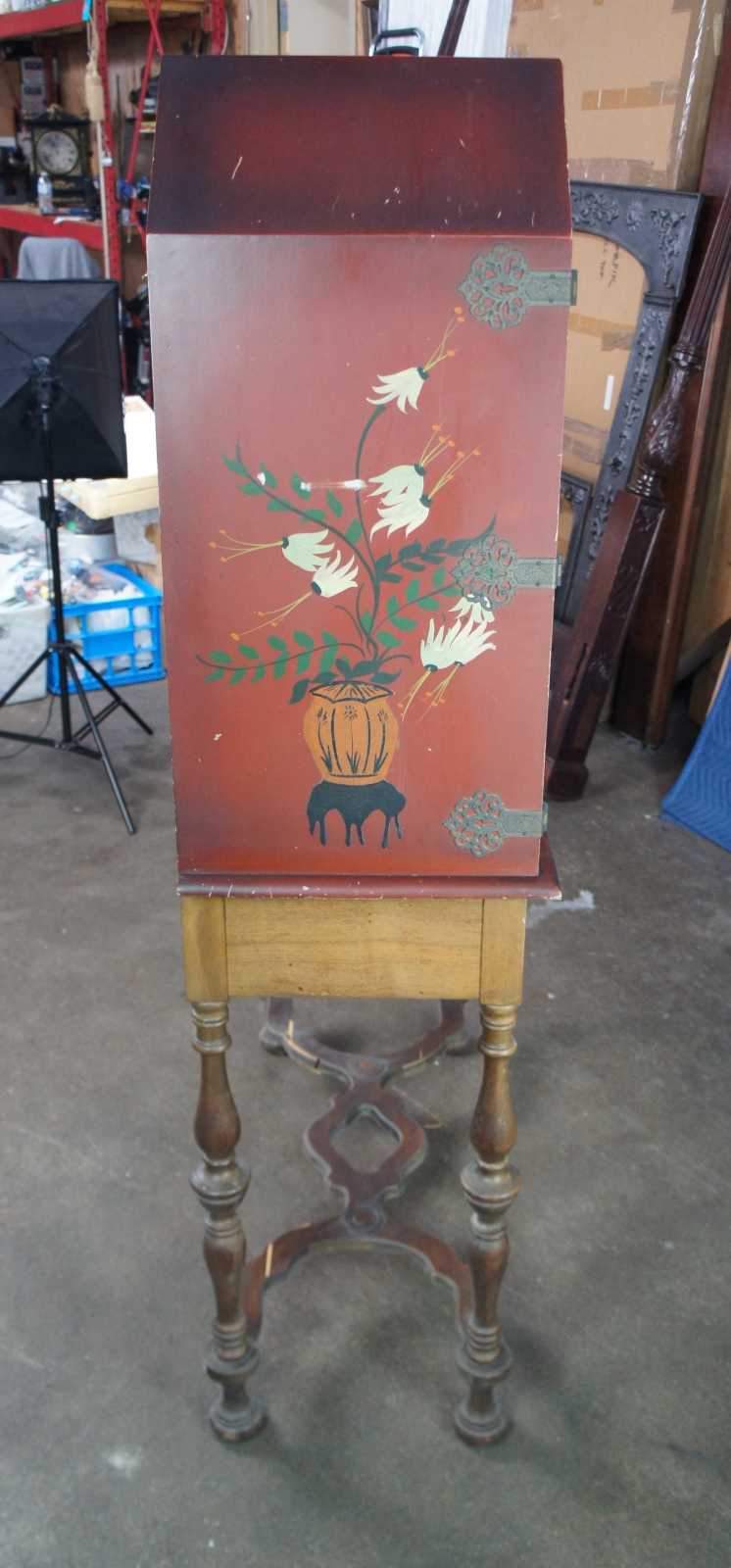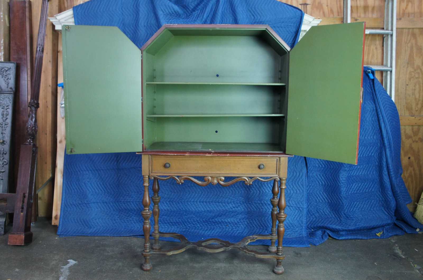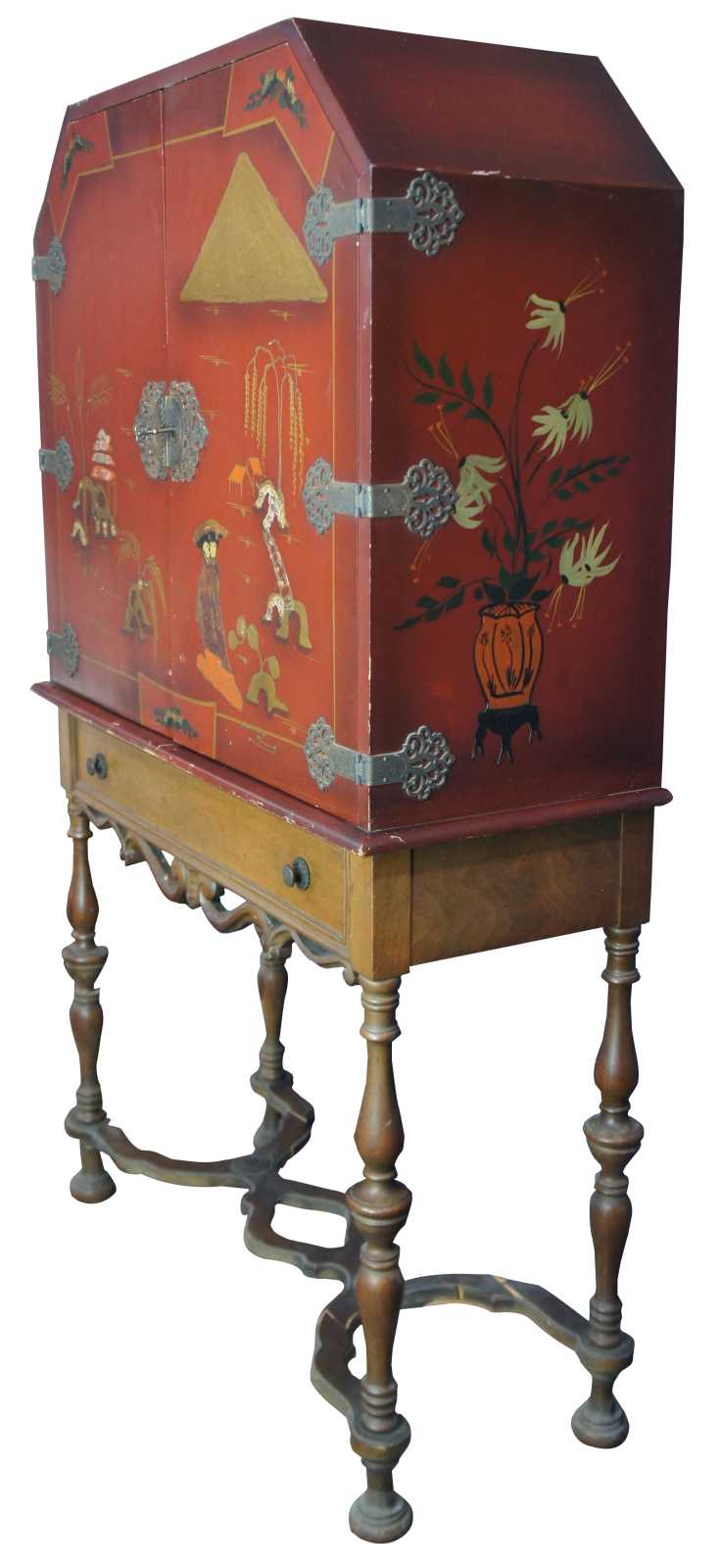 Mid century red lacquered William & Mary style chinoiserie cabinet, dry bar, or stand featuring Asian themed japanned landscape scene with jardinaires, flowers, pagodas and Geishas. Includes one drawer with locking cabinet that opens to green painted interior with two shelves for linens, books or TV / stereo components. The cabinet is supported by cup and urn shaped legs connected by an ornate H form stretcher. A styling indicative of William & Mary Revival.