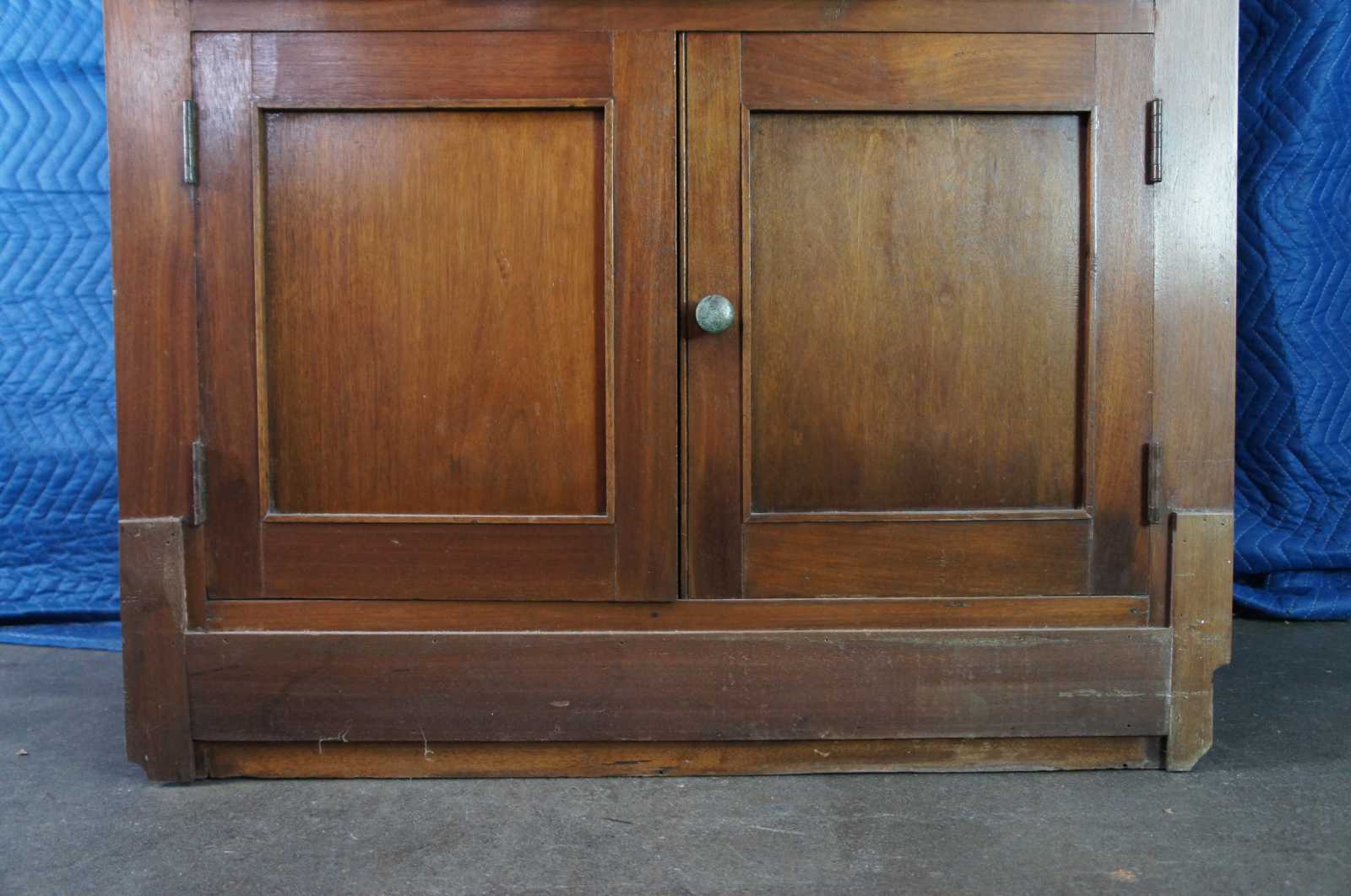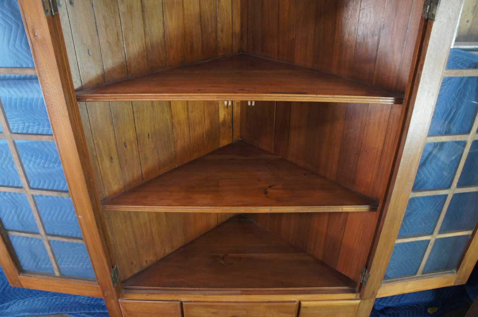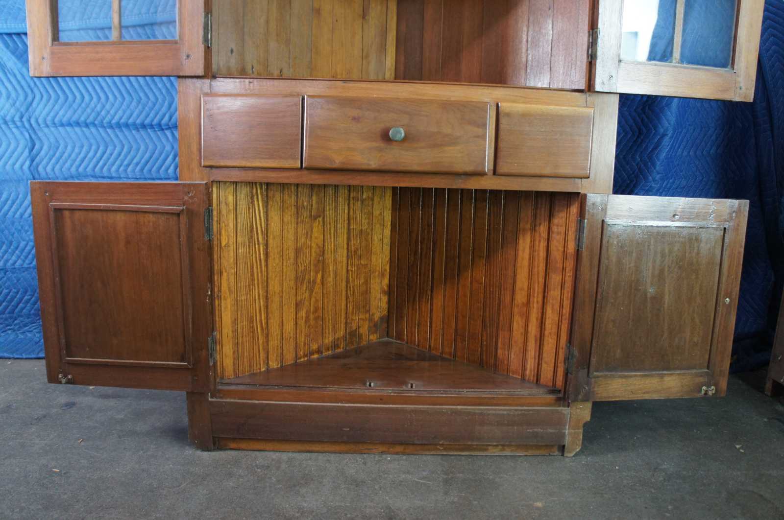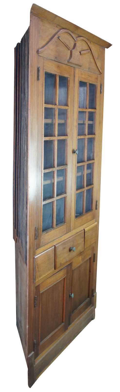 Antique oak corner display cabinet, curio or cupboard featuring upper cabinet with three shelves, central drawer and lower cabinet.