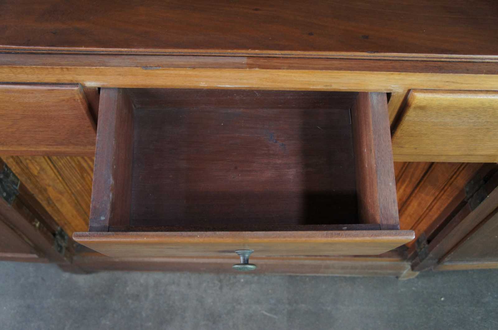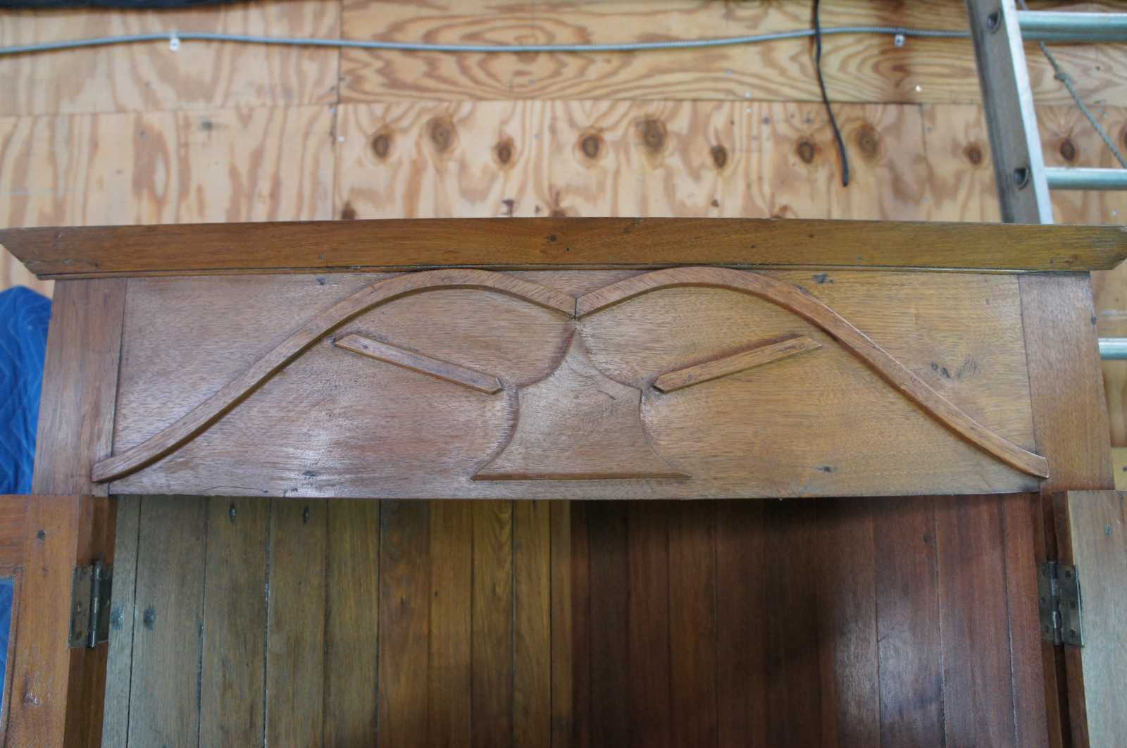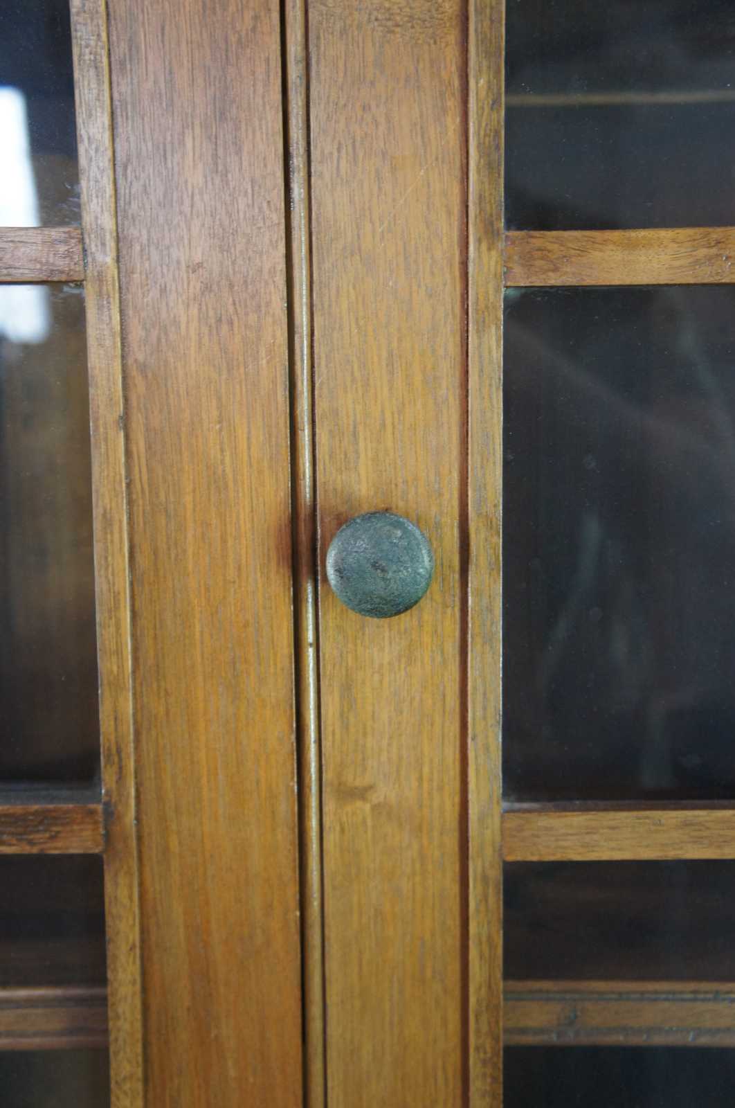 Antique oak corner display cabinet, curio or cupboard featuring upper cabinet with three shelves, central drawer and lower cabinet.