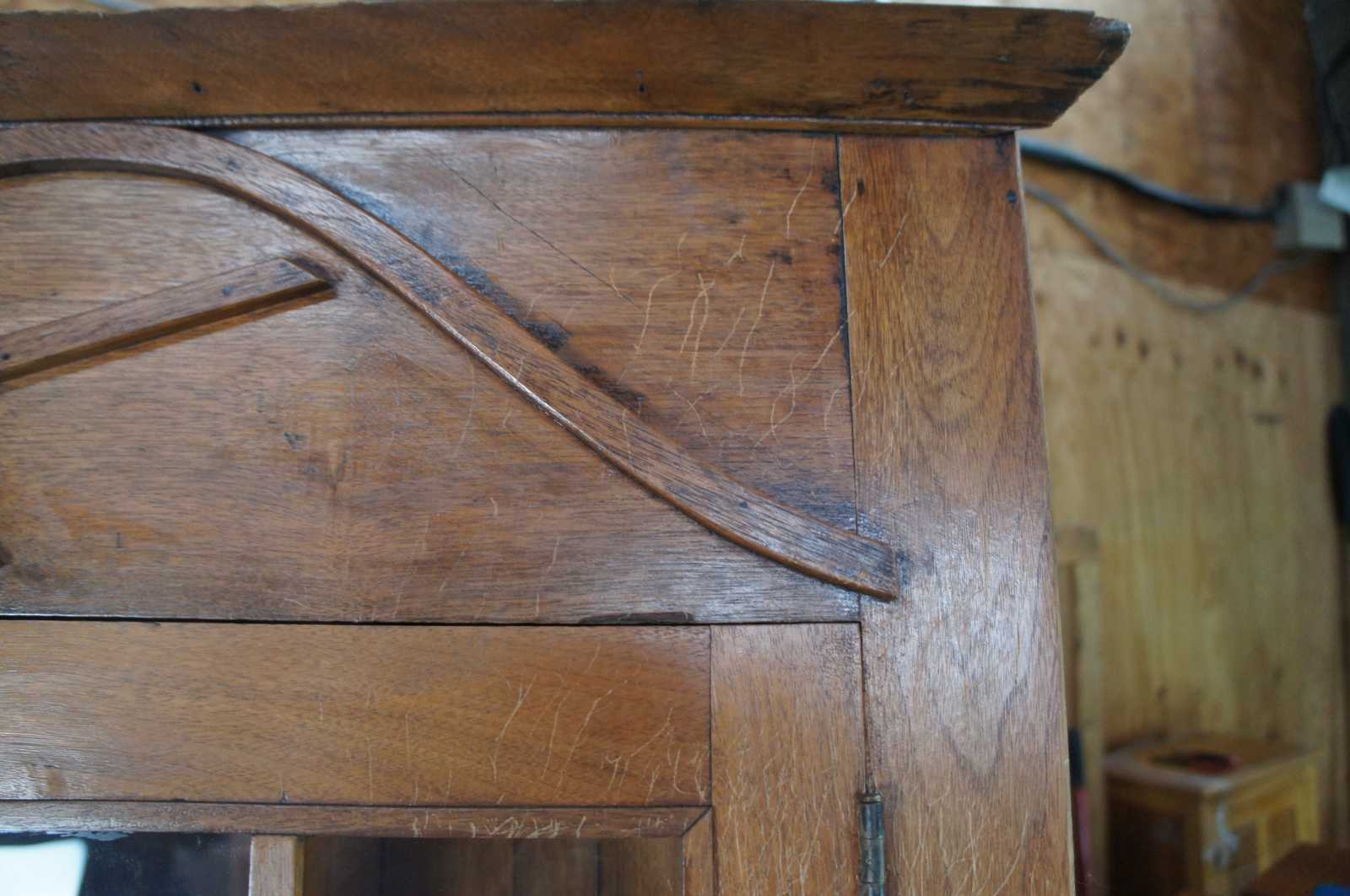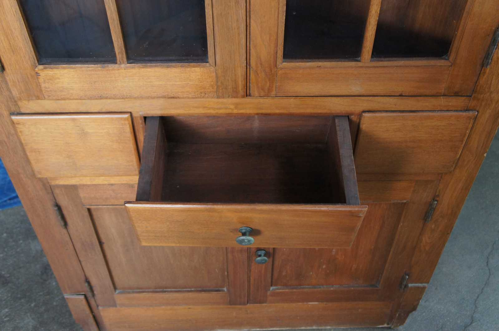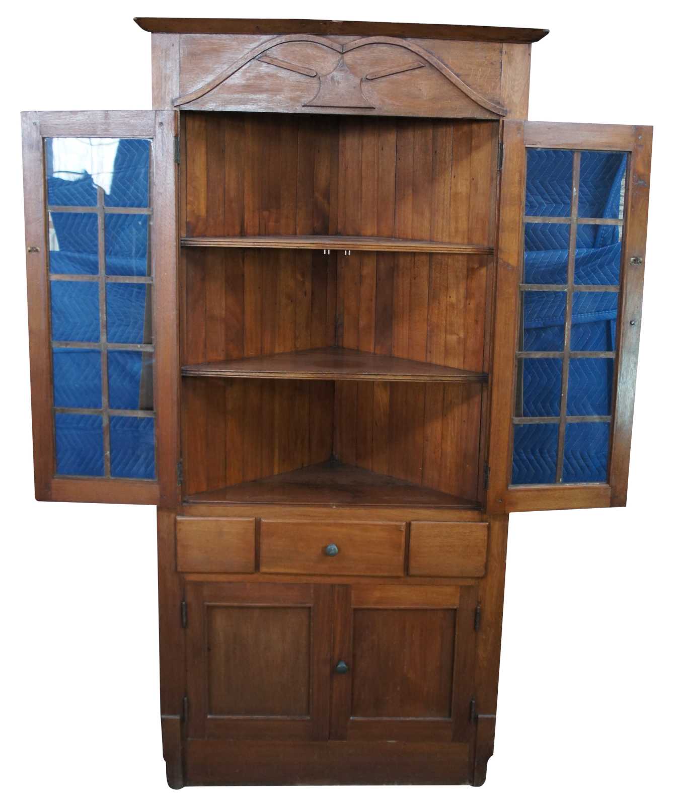 Antique oak corner display cabinet, curio or cupboard featuring upper cabinet with three shelves, central drawer and lower cabinet.