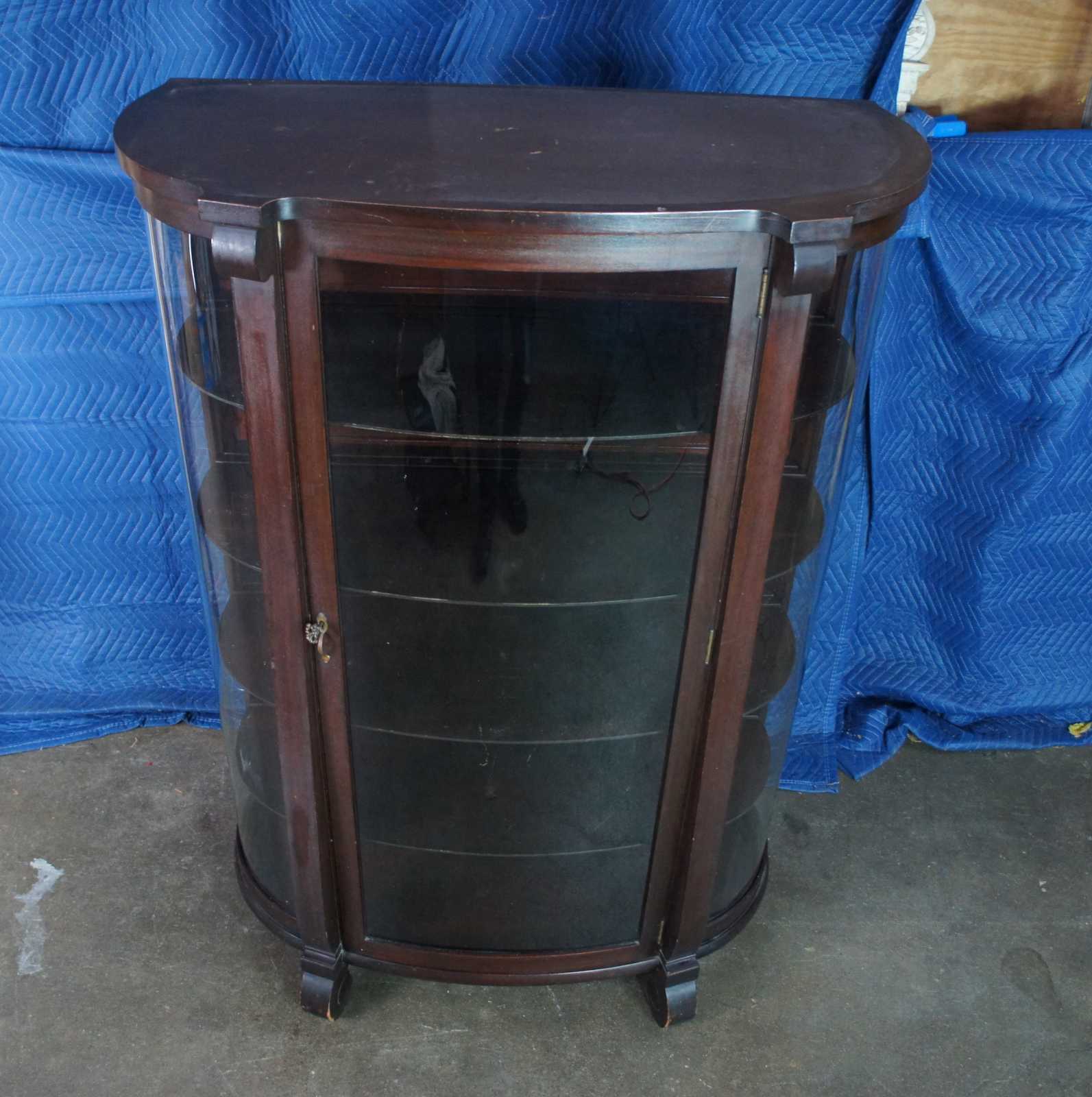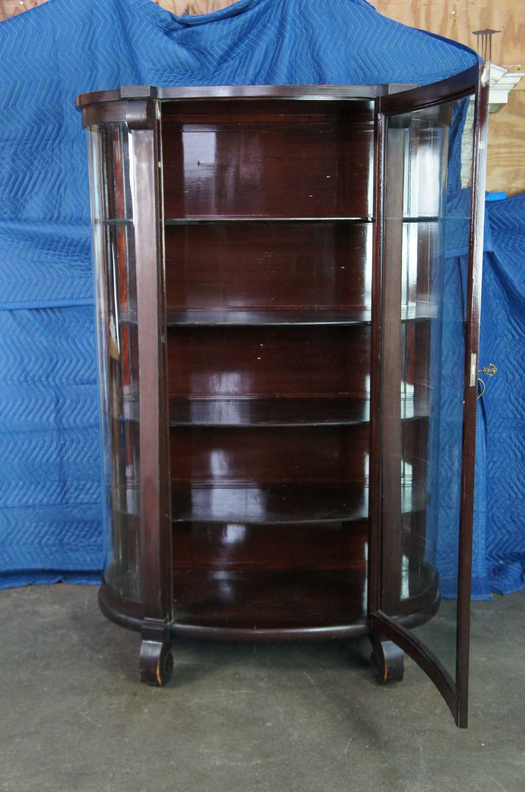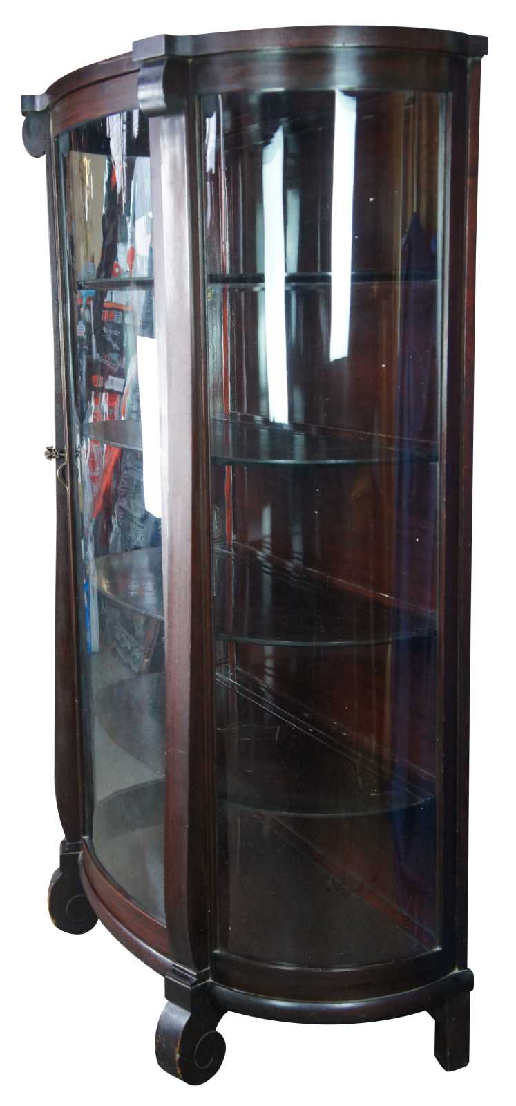 Antique mahogany bow front curio display or china cabinet featuring American Empire styling with curved glass doors, wood shelves and scrolled legs.