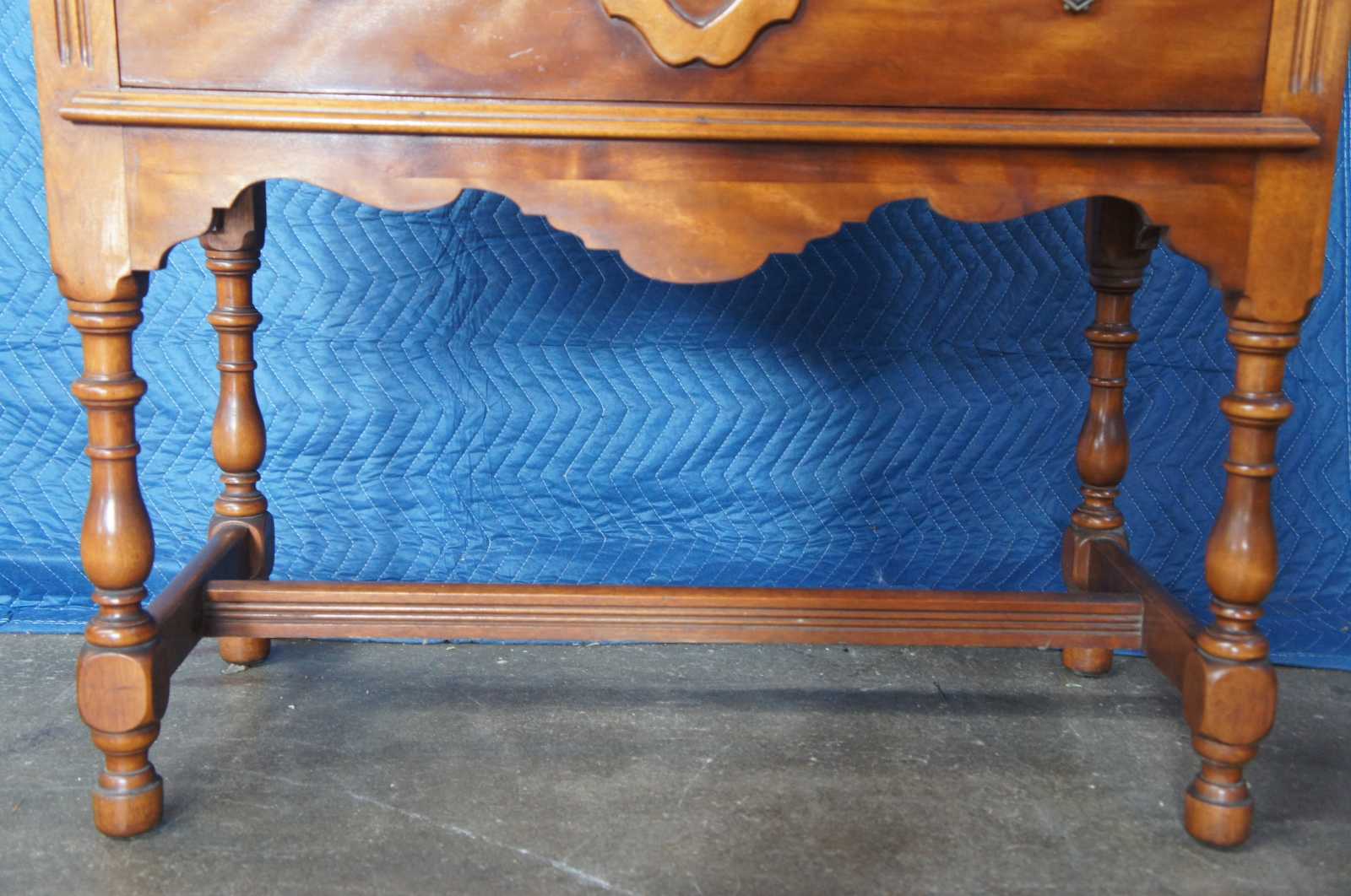 Circa 1940s William & Mary style maple flamed cupboard, cabinet or china hutch featuring old cherry finish with three shelves and lower drawer.