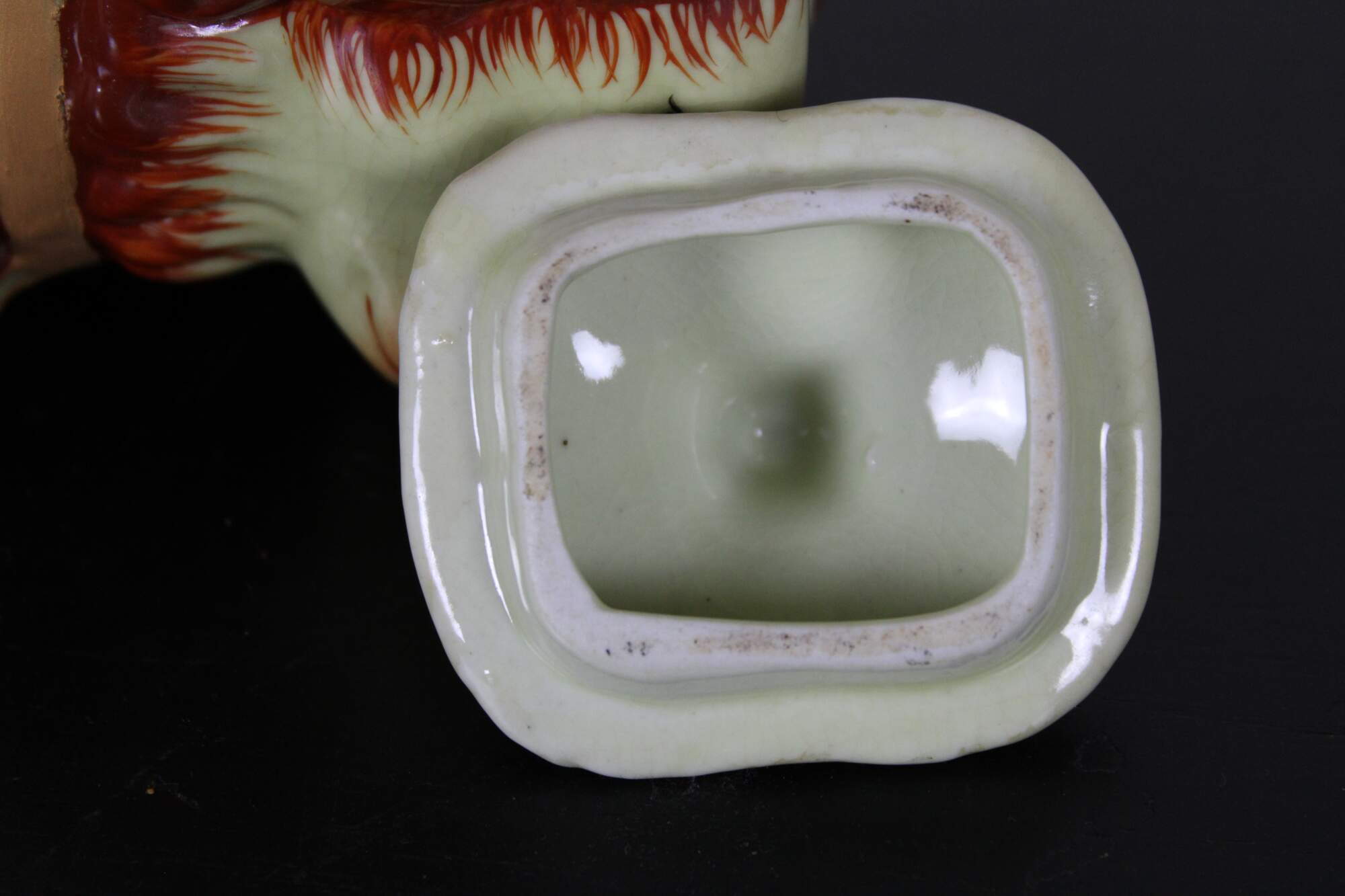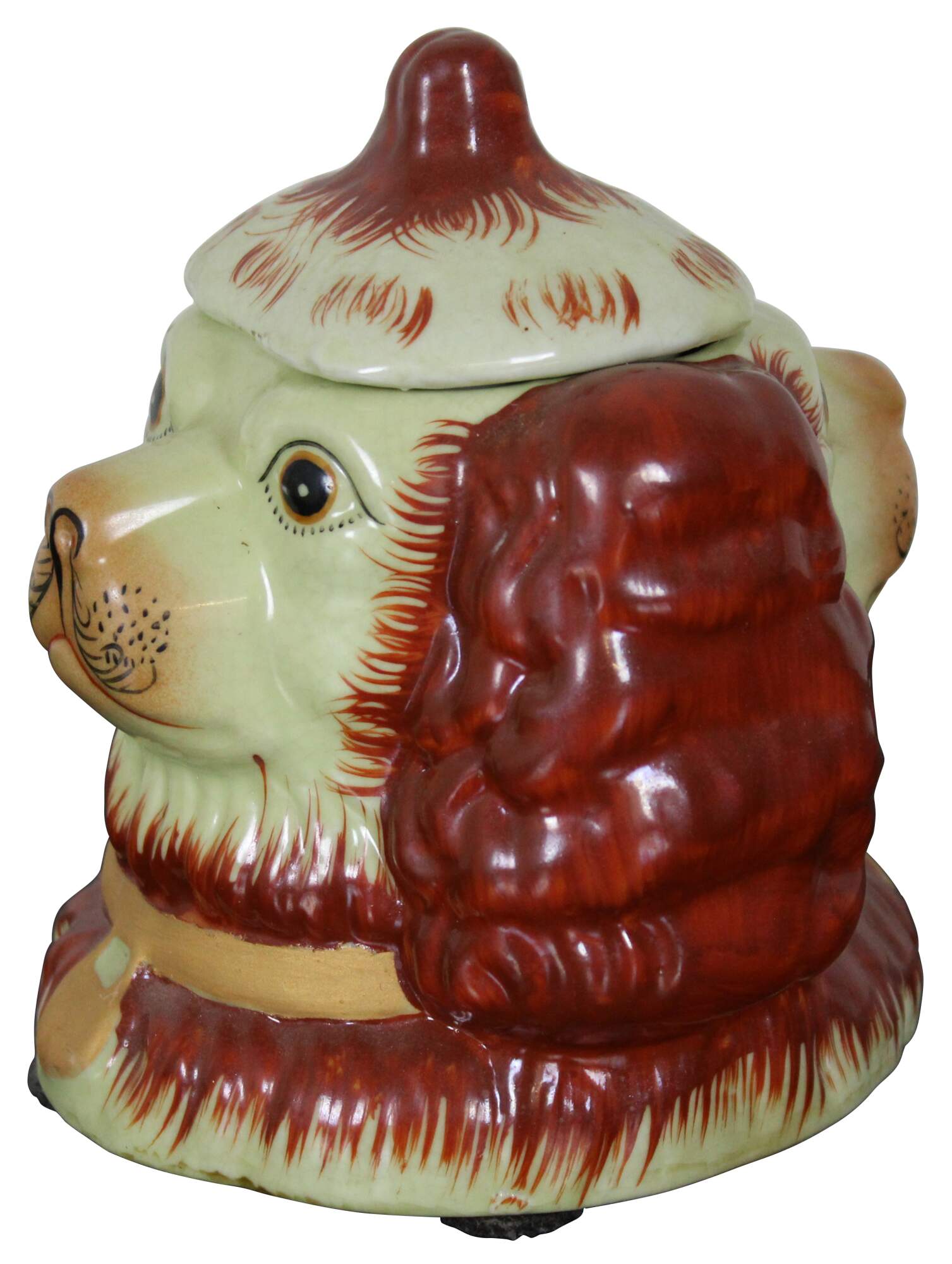 British 19th Century crackle Staffordshire with iron red & black enamels, Two Faced Spaniel Head Candy Jar with collar and tag.