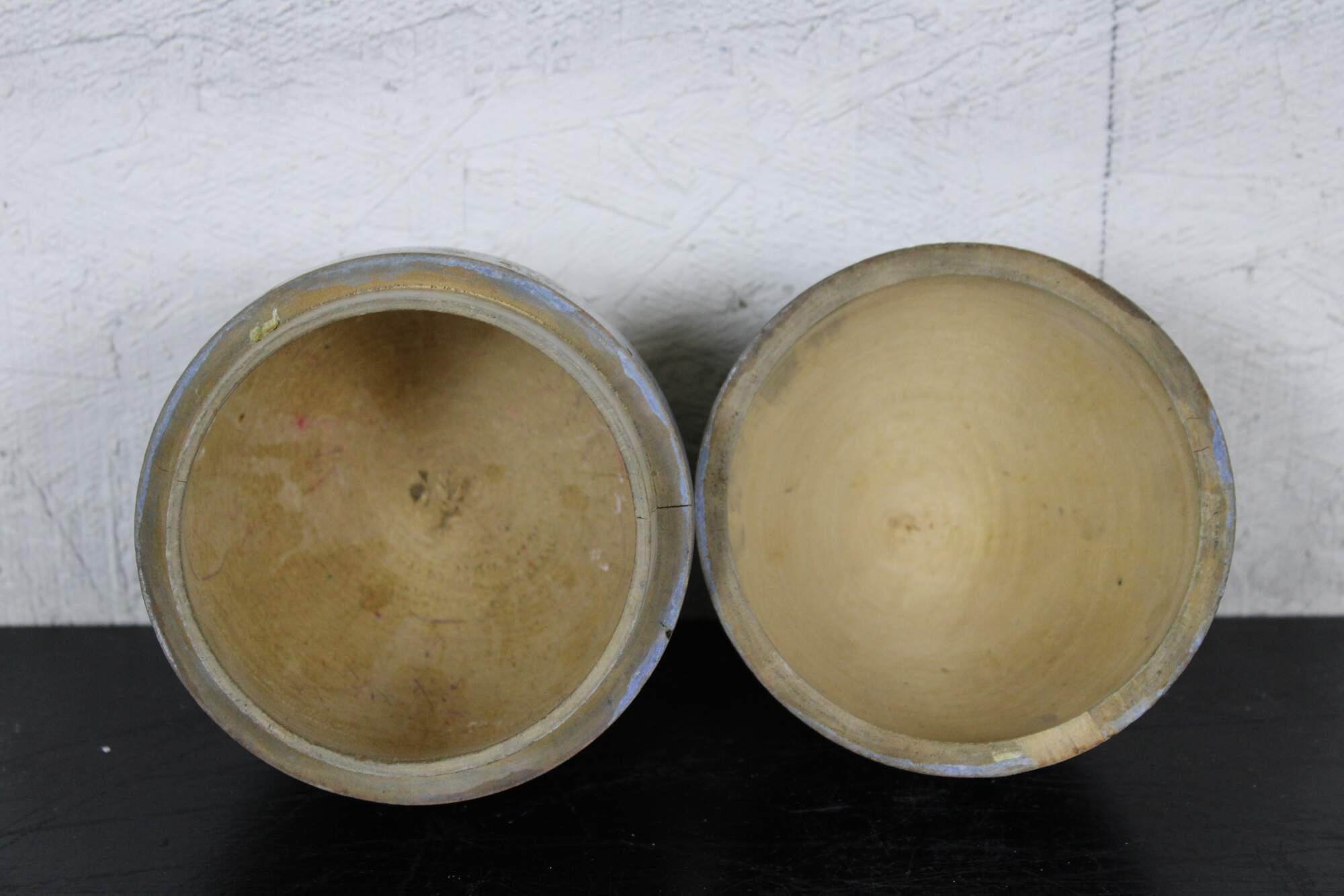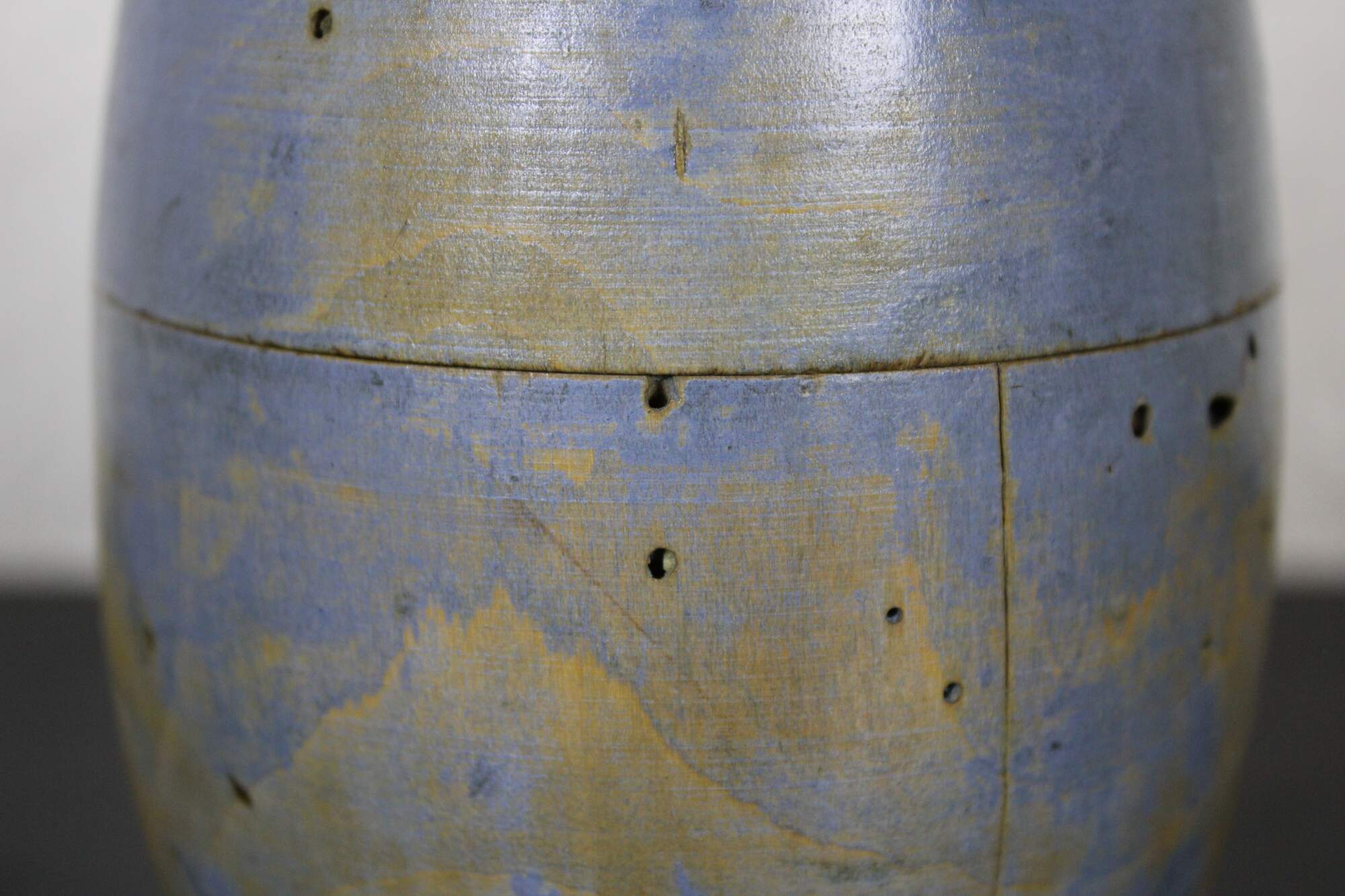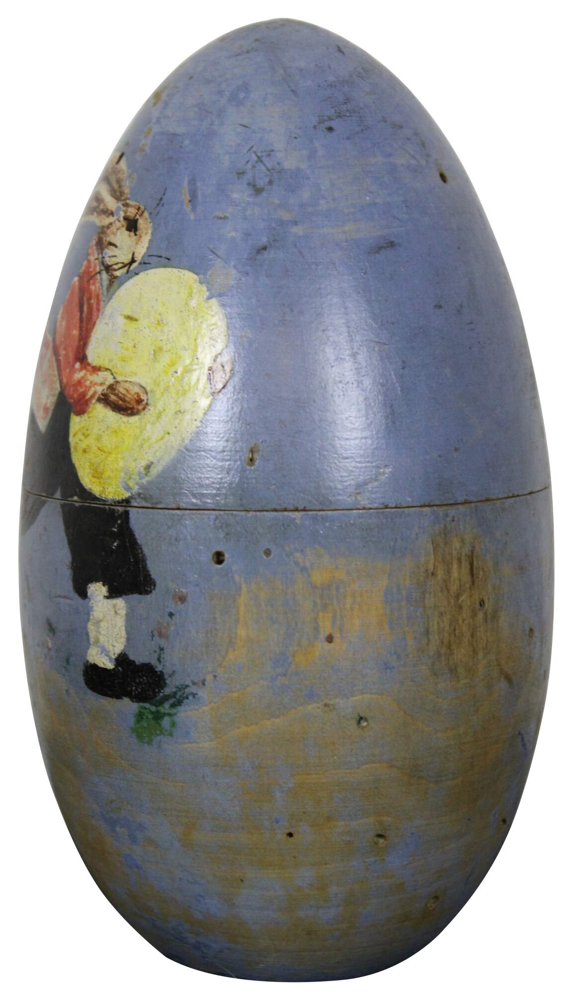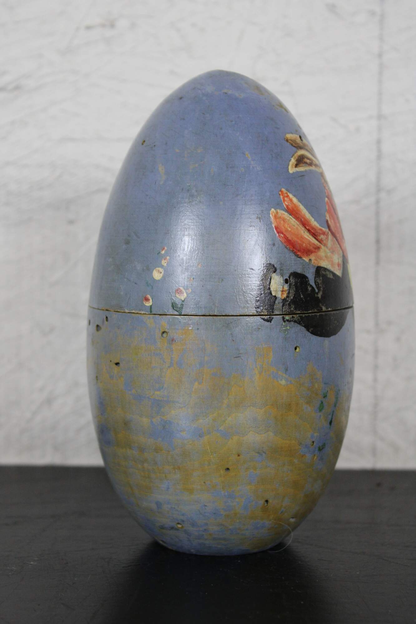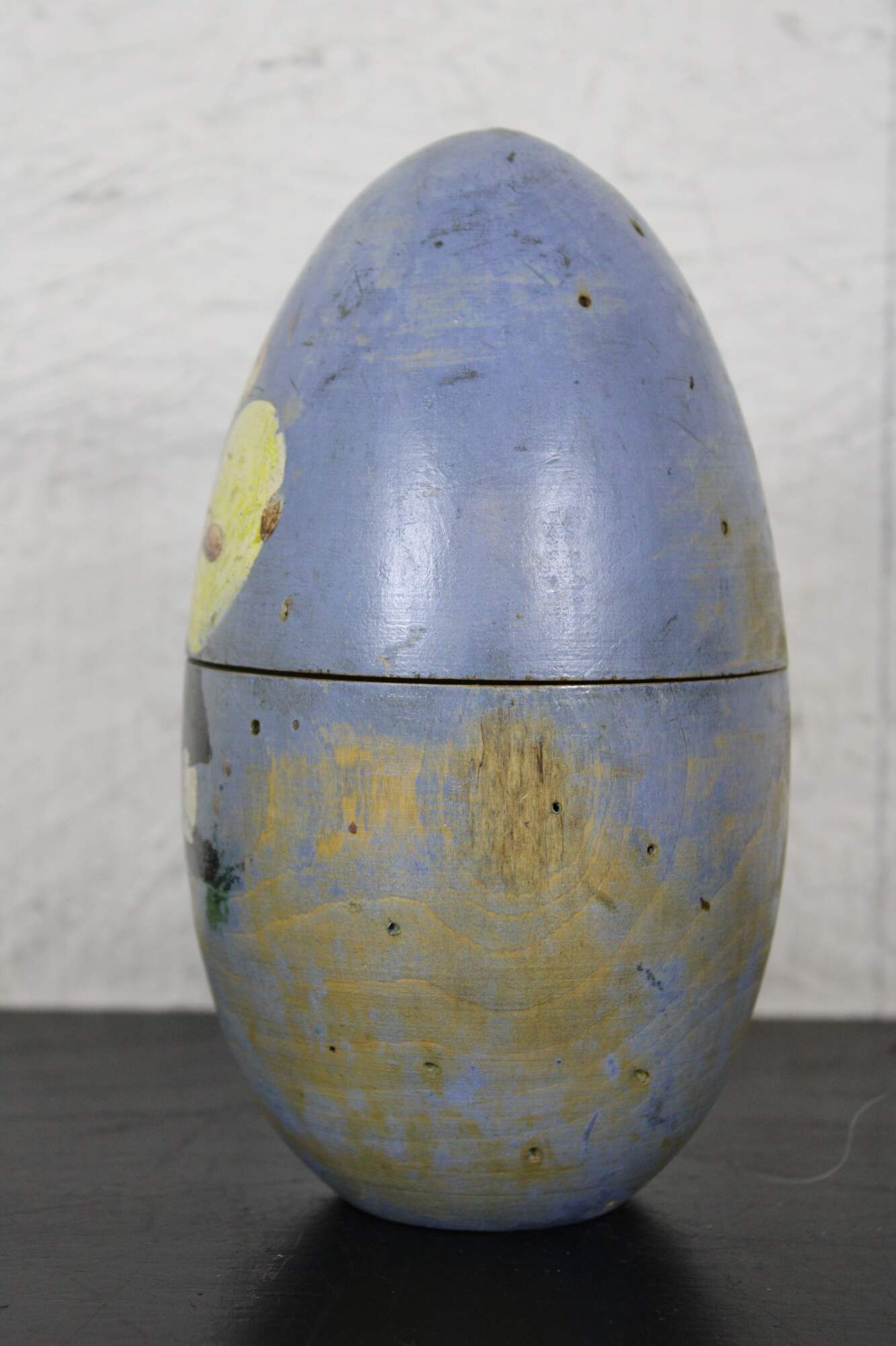 Vintage folk art style carved wooden egg shaped trinet box, painted blue with the image of an Easter Bunny running with a large yellow egg.