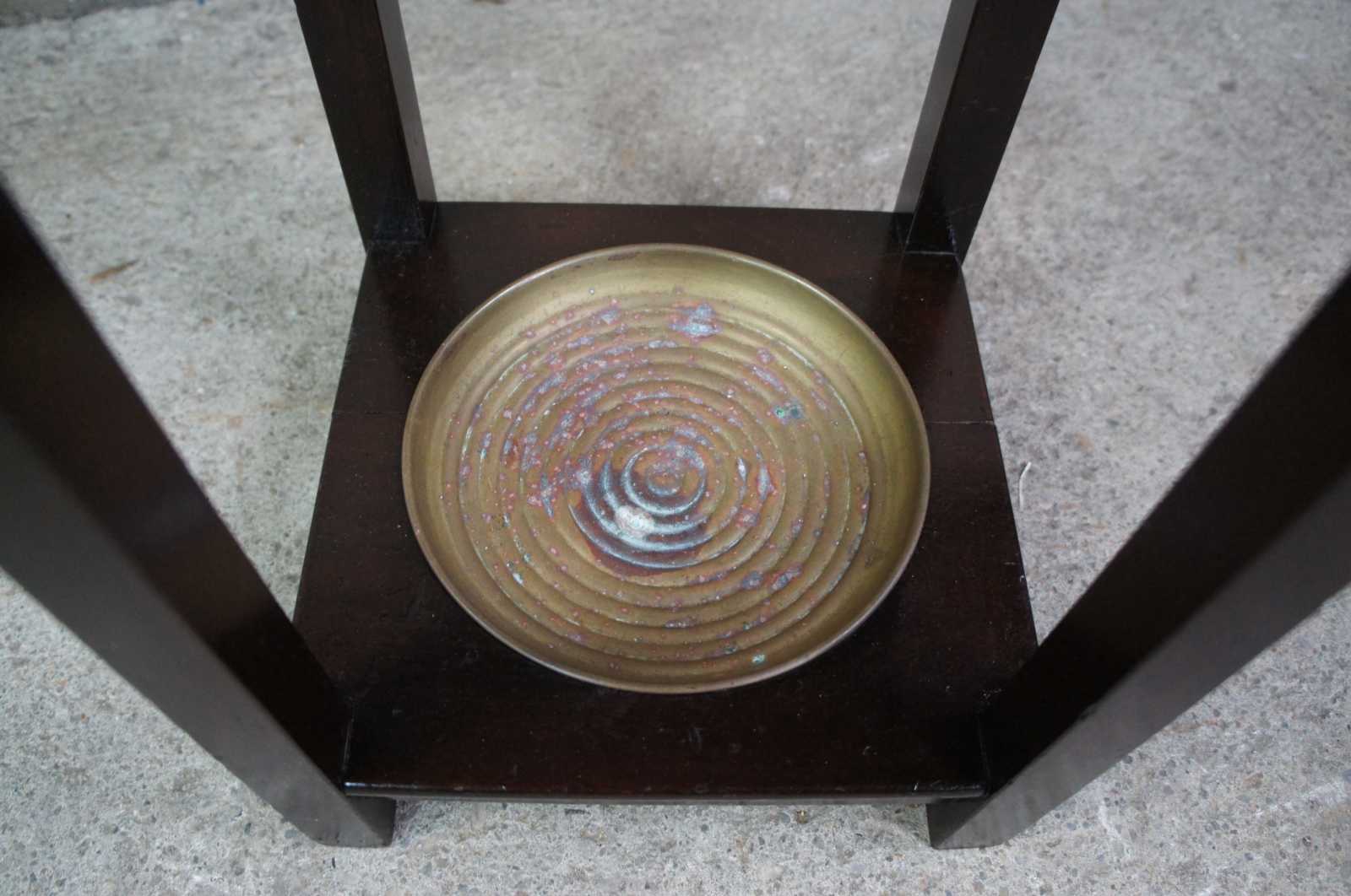 Antique umbrella stand or cane stand featuring mission styling with four divided compartments and ribbed brass tray.