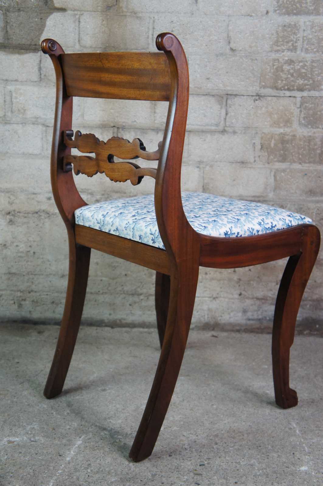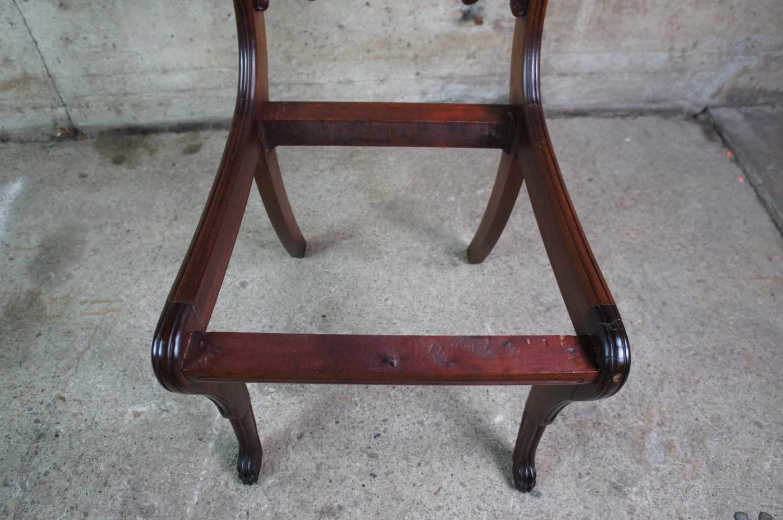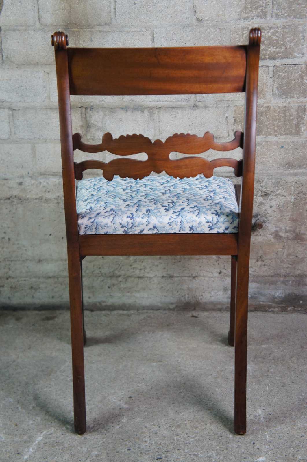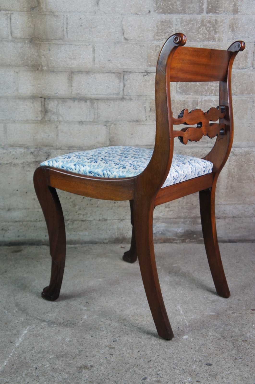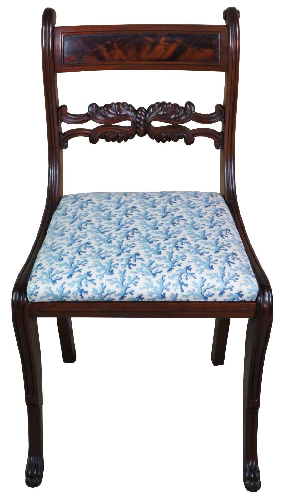 Antique Duncan Phyfe dining, parlor or vanity chair. Made of flamed mahogany featuring Klismos form with carved serpentine back support, fluted accents, and paw feet.