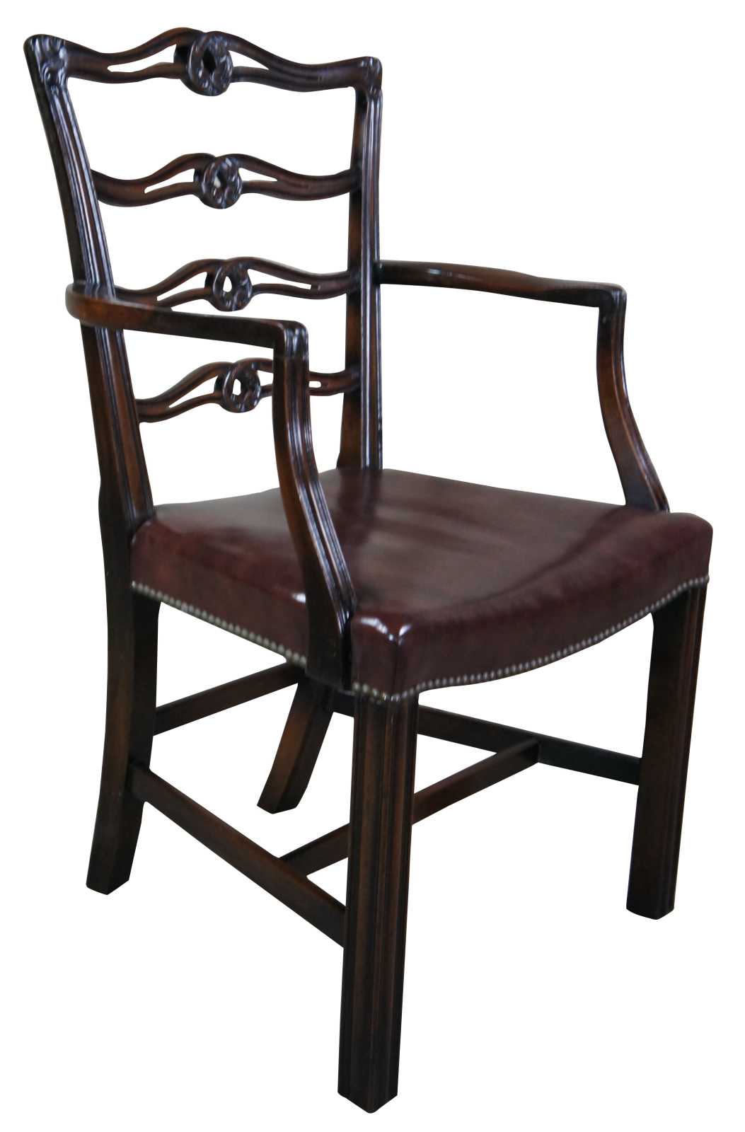 Six antique dining chairs made from mahogany featuring Georgian / Chippendale style, circa first quarter 20th century. Includes a "riddle-back" which is woven and pierced. This design was developed in the 18th century and is now commonly referred to as a ribbon back. The chair is upholstered in a rich brown leather with nailhead trim and supported by straight legs connected by an H stretcher.