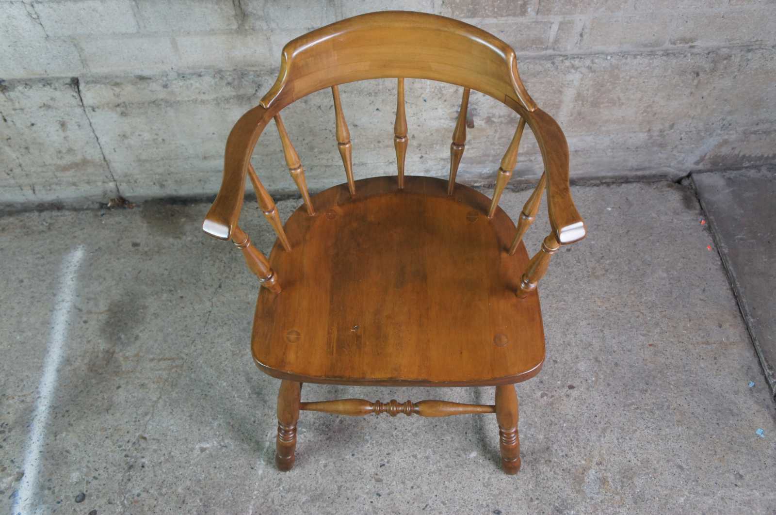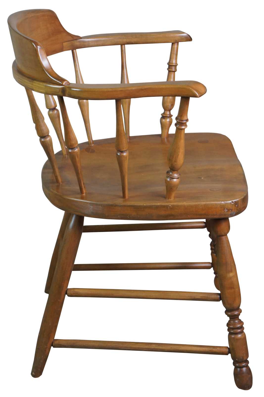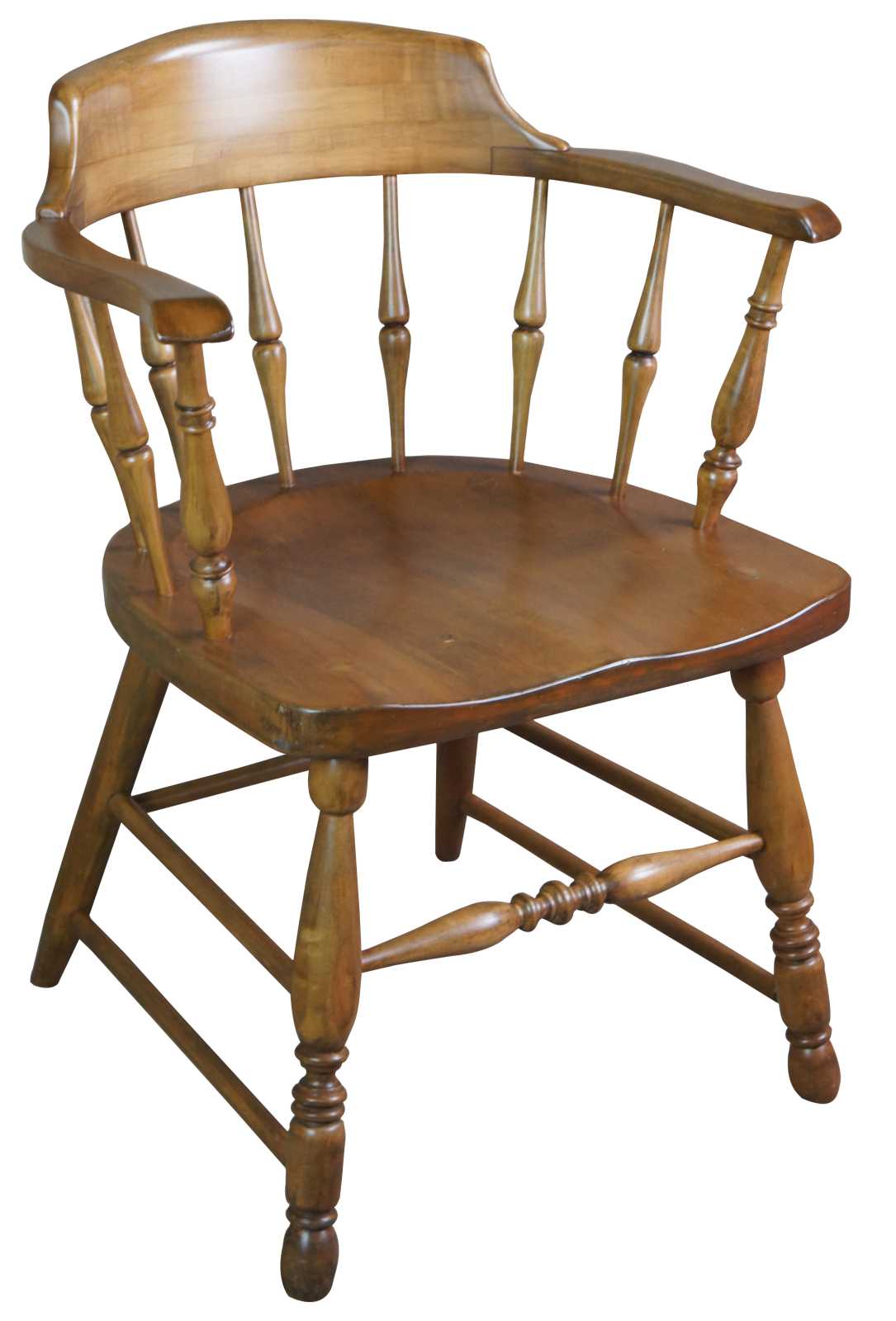 The Caboose Chair was first designed for the Union Pacific Railroad and was put into every caboose on the train. Specifically made to withstand abuse with its contoured saddle seat design, this is one of the strongest chairs made. These chairs are made by highly skilled craftsman with dedication and experience. These chairs also saw service in the old firehouse's and saloons of the day. This modern example is Made of maple featuring barrel form with turned posts and slats, circa 1960s.