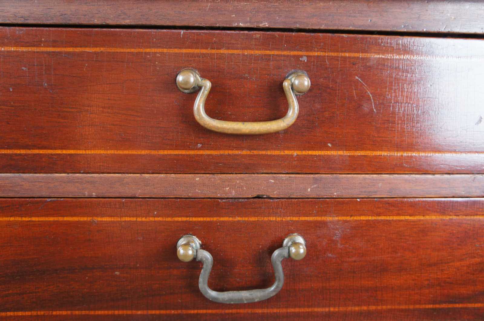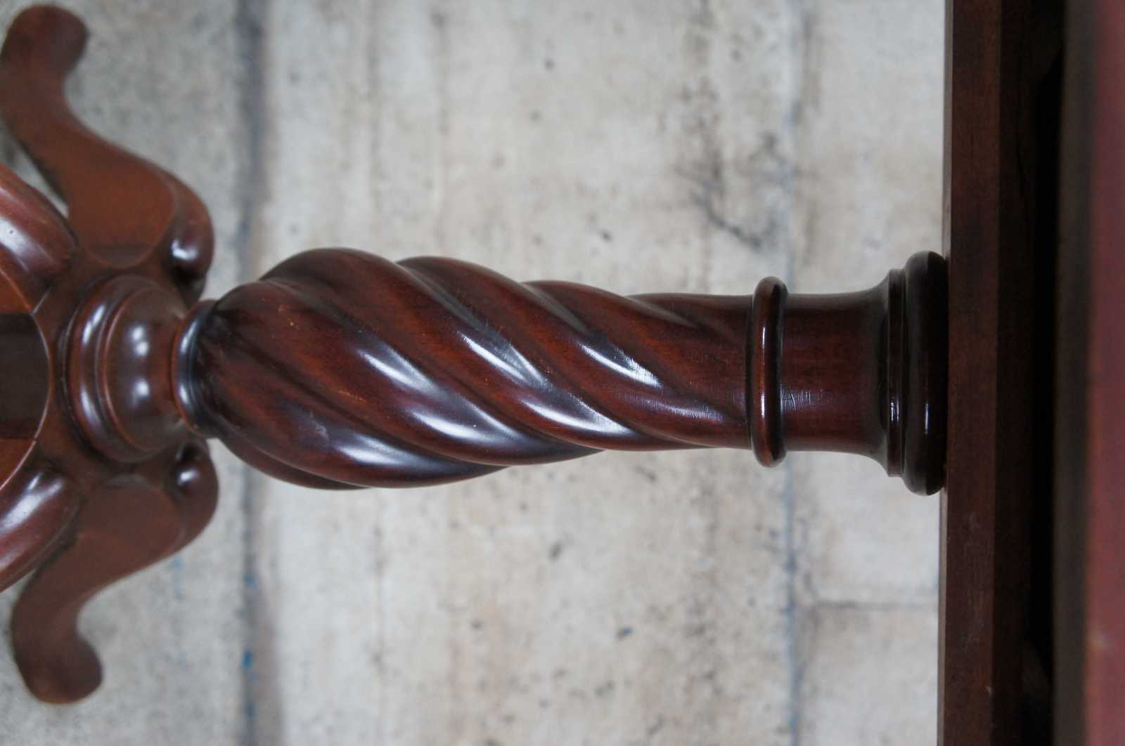 Antique pembroke parlor side accent table. Inspired by Federal & Regency styling, circa 1st quarter 20th century. Made of mahogany featuring inlaid mother of pearl pinwheel medallion with two drop leaves, two drawers (One with Dividers) and barley twisted column pedestal base.