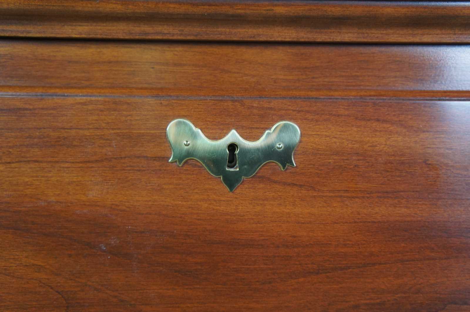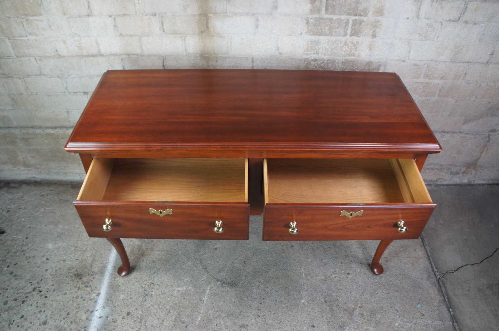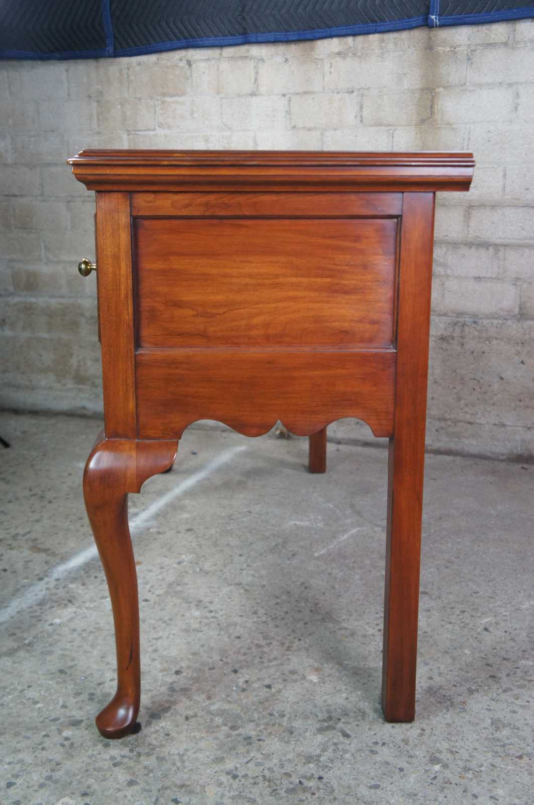 Vintage 1986 Hinkel Harris Jamestown Colony Wild Black Cherry buffet or sideboard. A recetangular form with 2 large drawers with brass knobs and colonial escutcheons over a serpentine cut apron. Supported by cabriole legs with pad feet and squared back supports. Includes key.