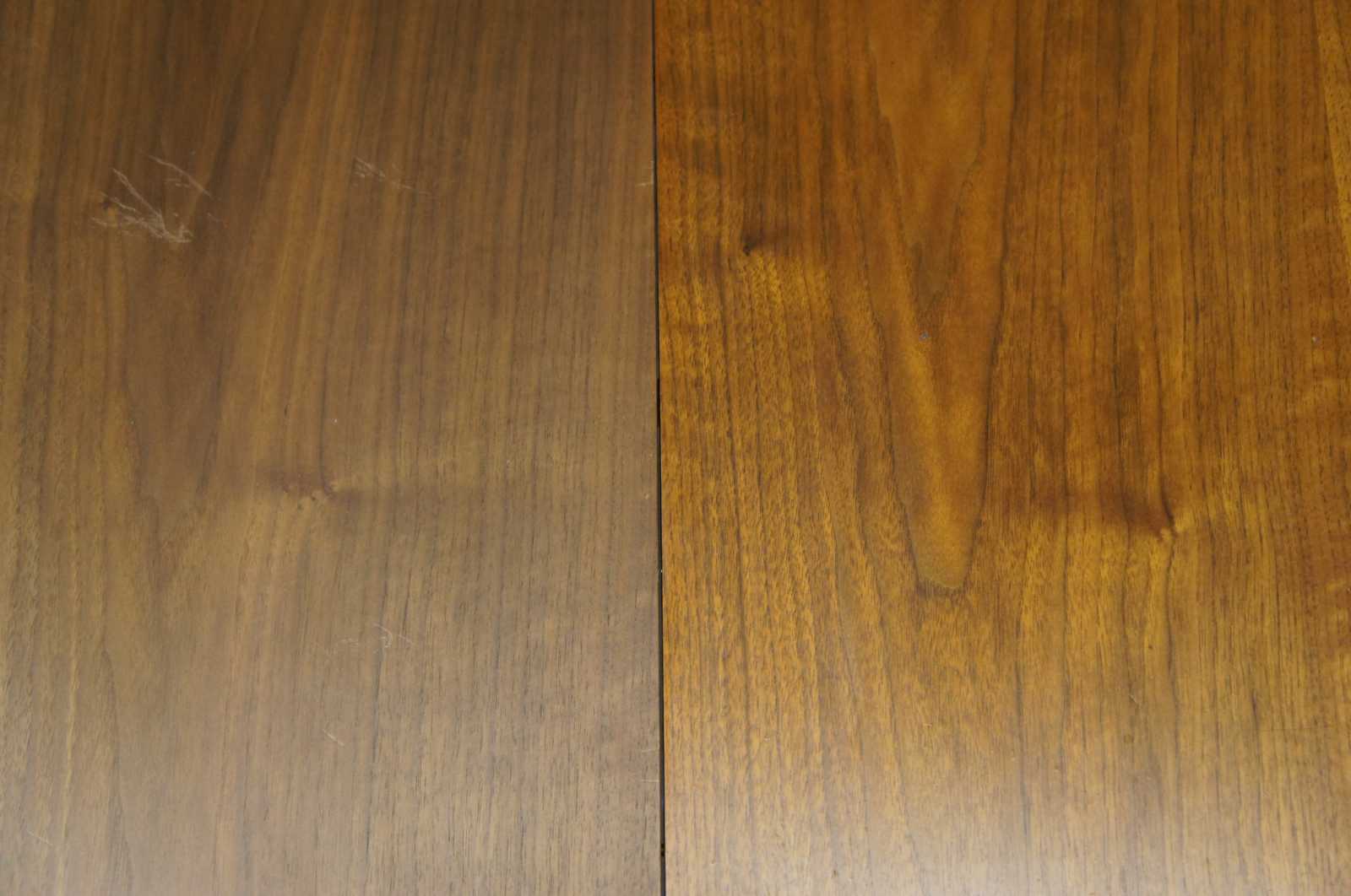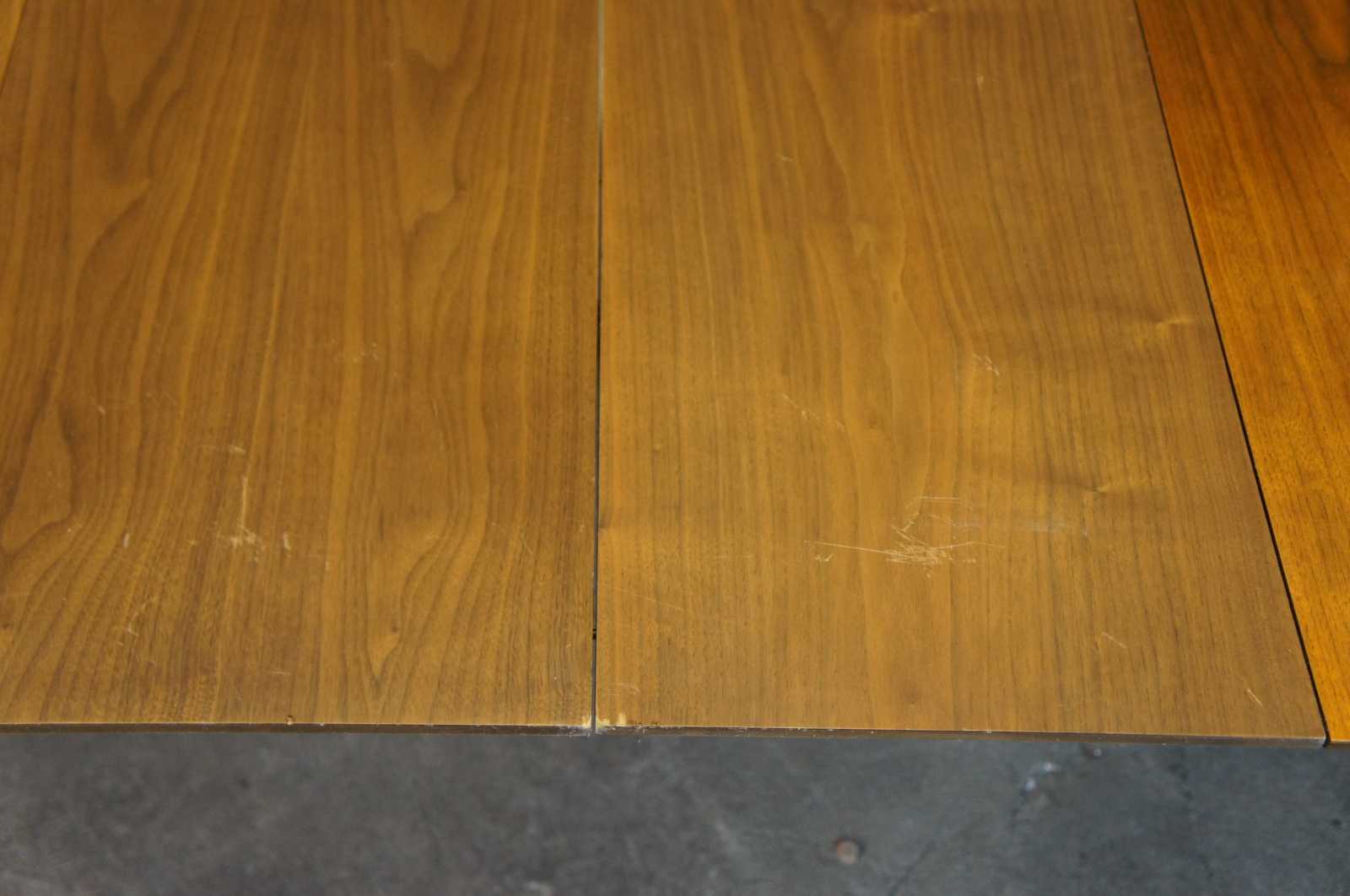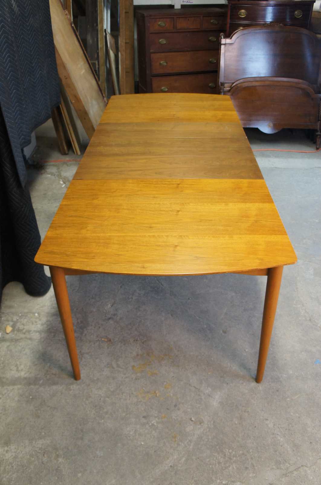 Mid century modern Morganton walnut dining table featuring Danish styling with rectangular form, rounded ends, tapered legs and extra leaves.